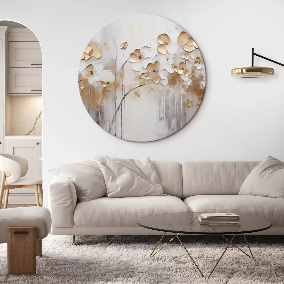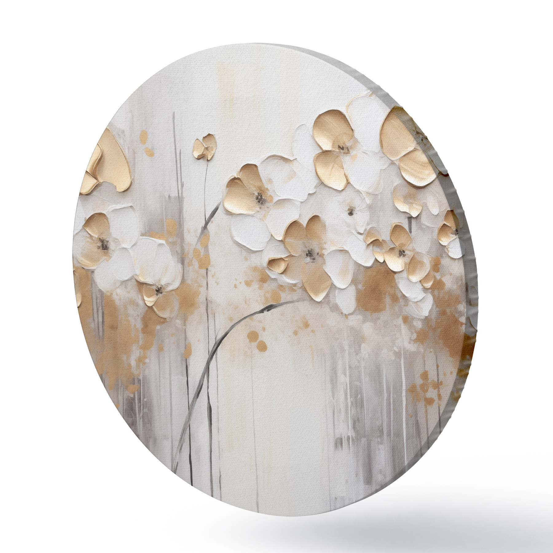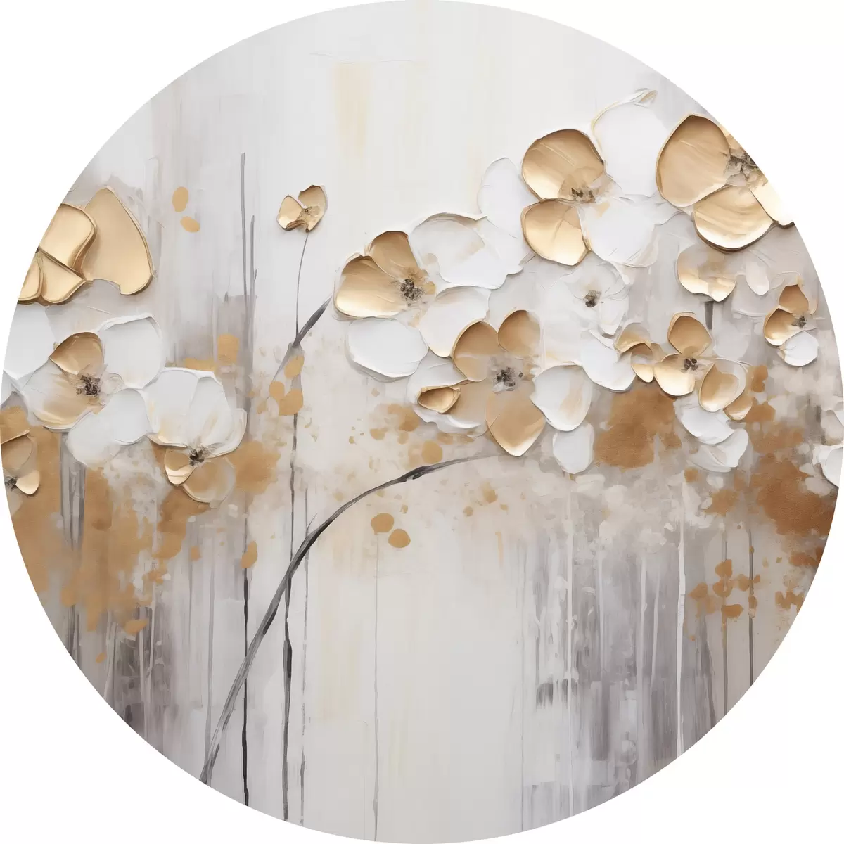 Apaļas gleznas Ziedi ar teksturētām ziedlapiņām uz maiga, pieklusināta fona ar abstraktiem krāsu triepieniem un vertikālām līnijām r42713