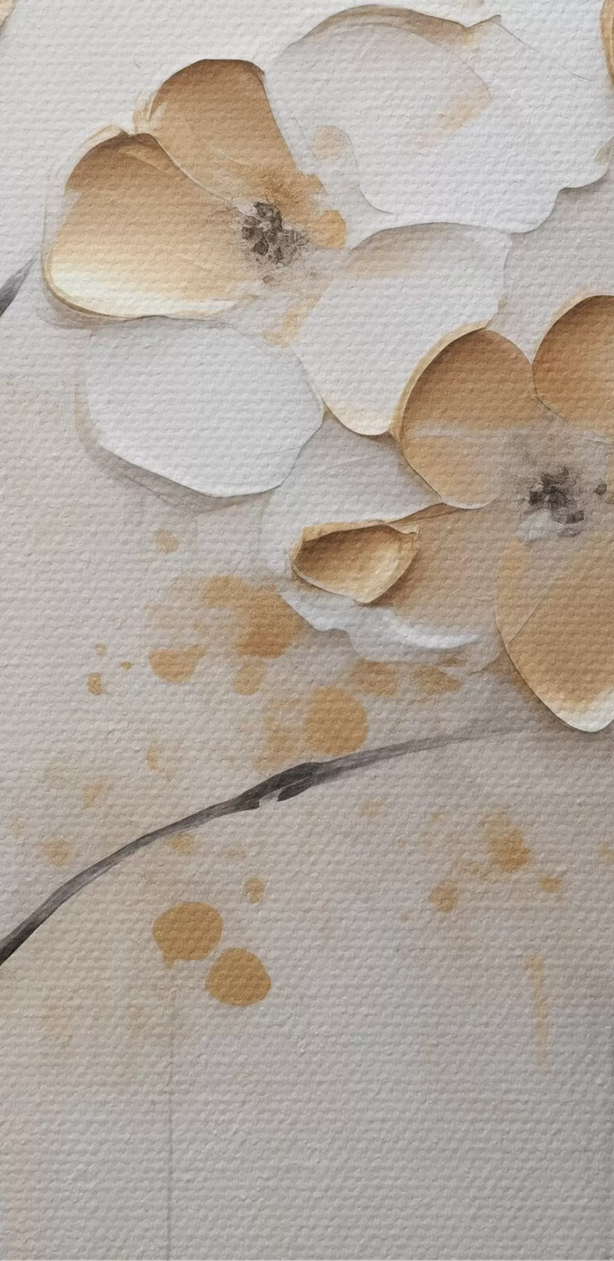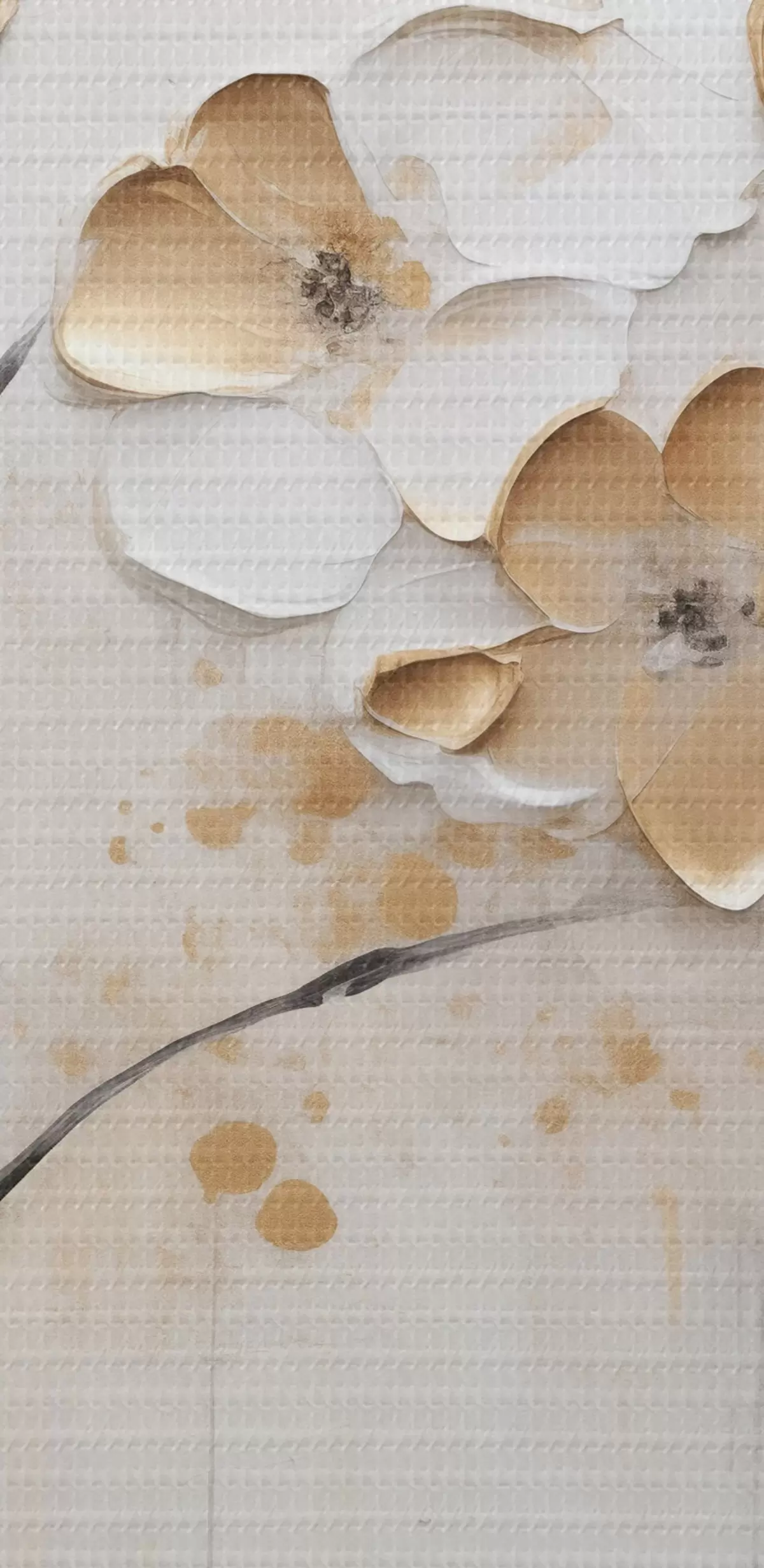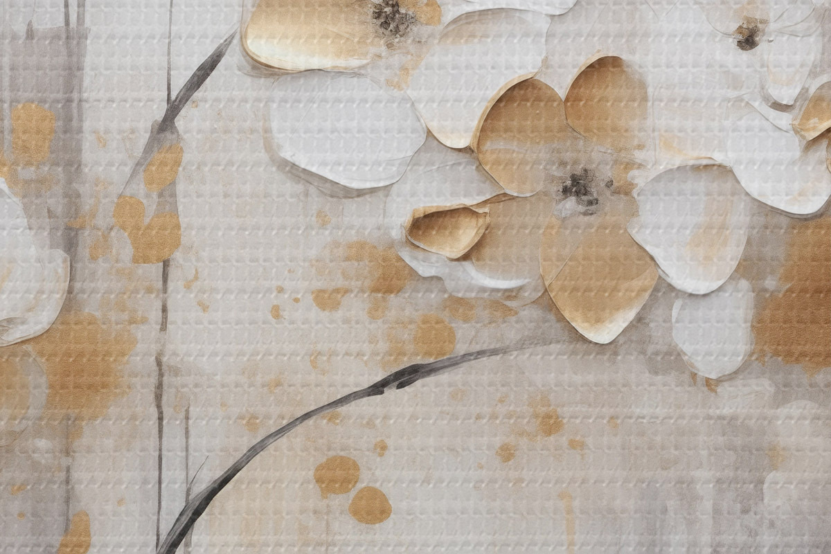 Attēls Ziedi ar teksturētām ziedlapiņām uz maiga, pieklusināta fona ar abstraktiem krāsu triepieniem un vertikālām līnijām Nr r42713