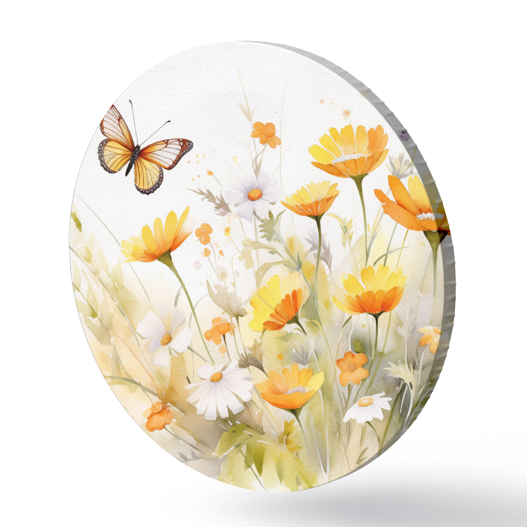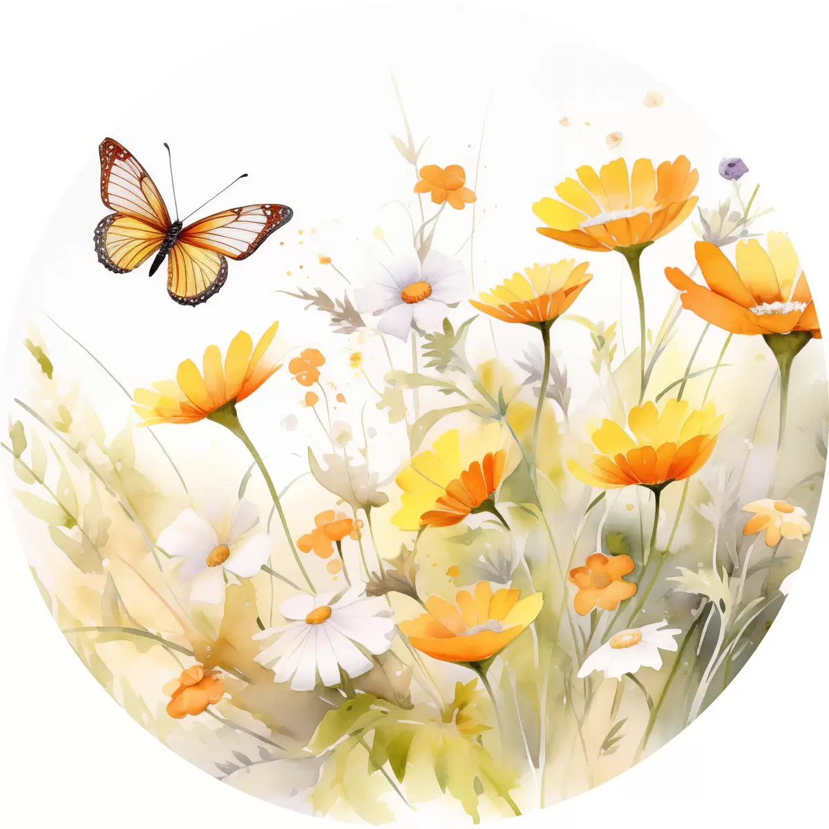 Apaļas gleznas Spilgts, akvarelim līdzīgs ziedu lauks ar oranžām un baltām margrietiņām un netālu lidojošu tauriņu r42714