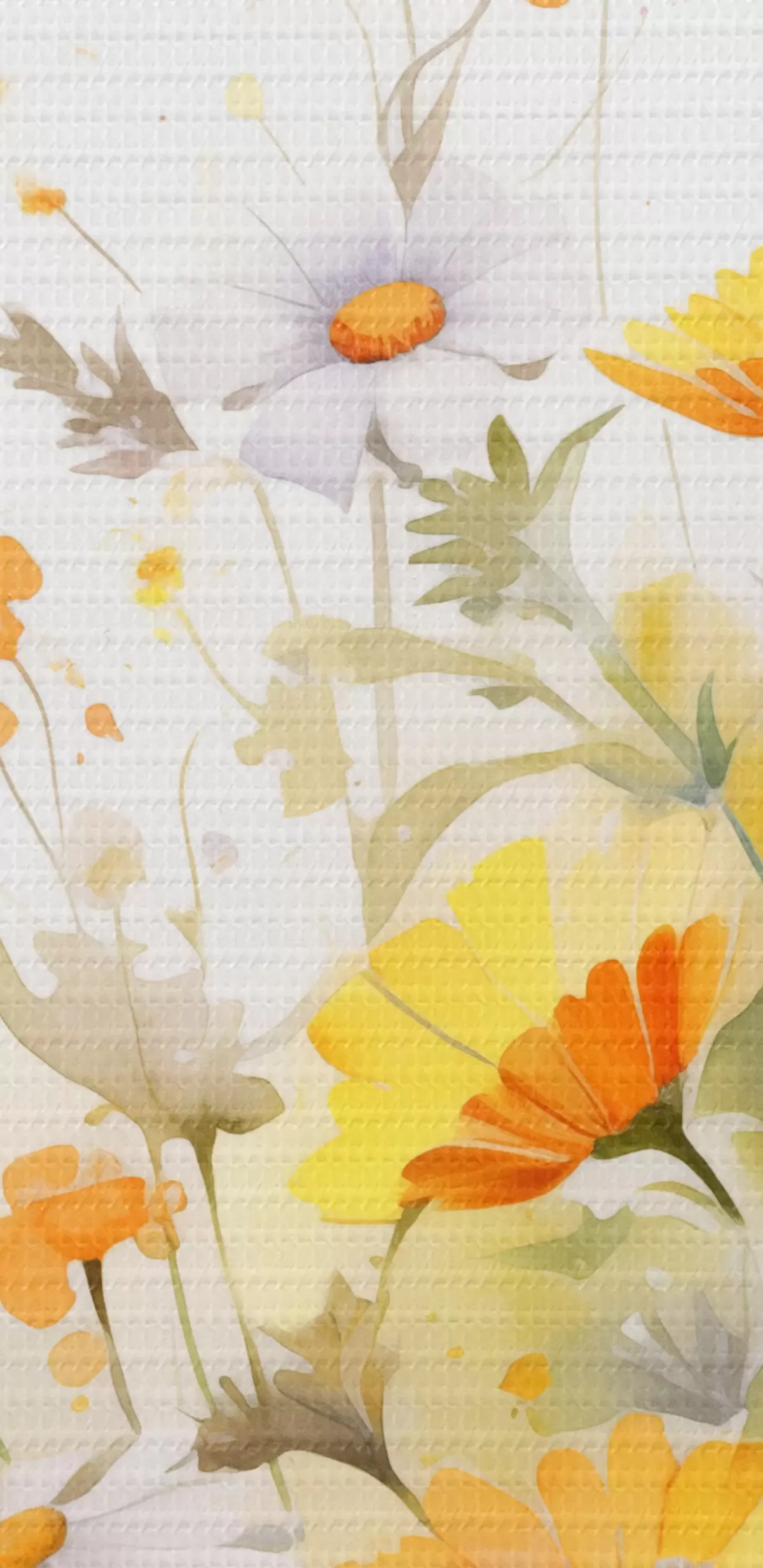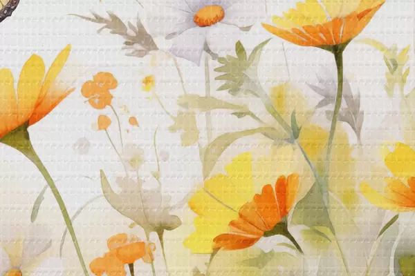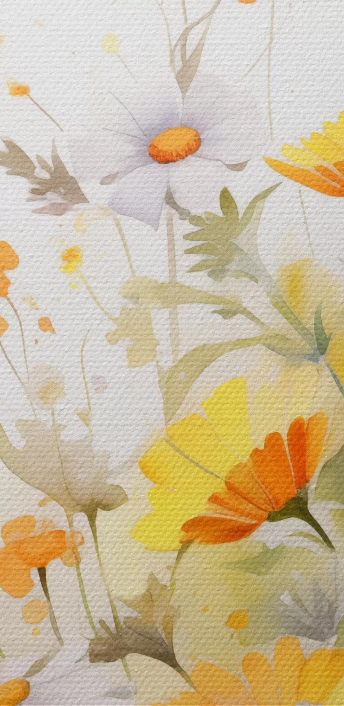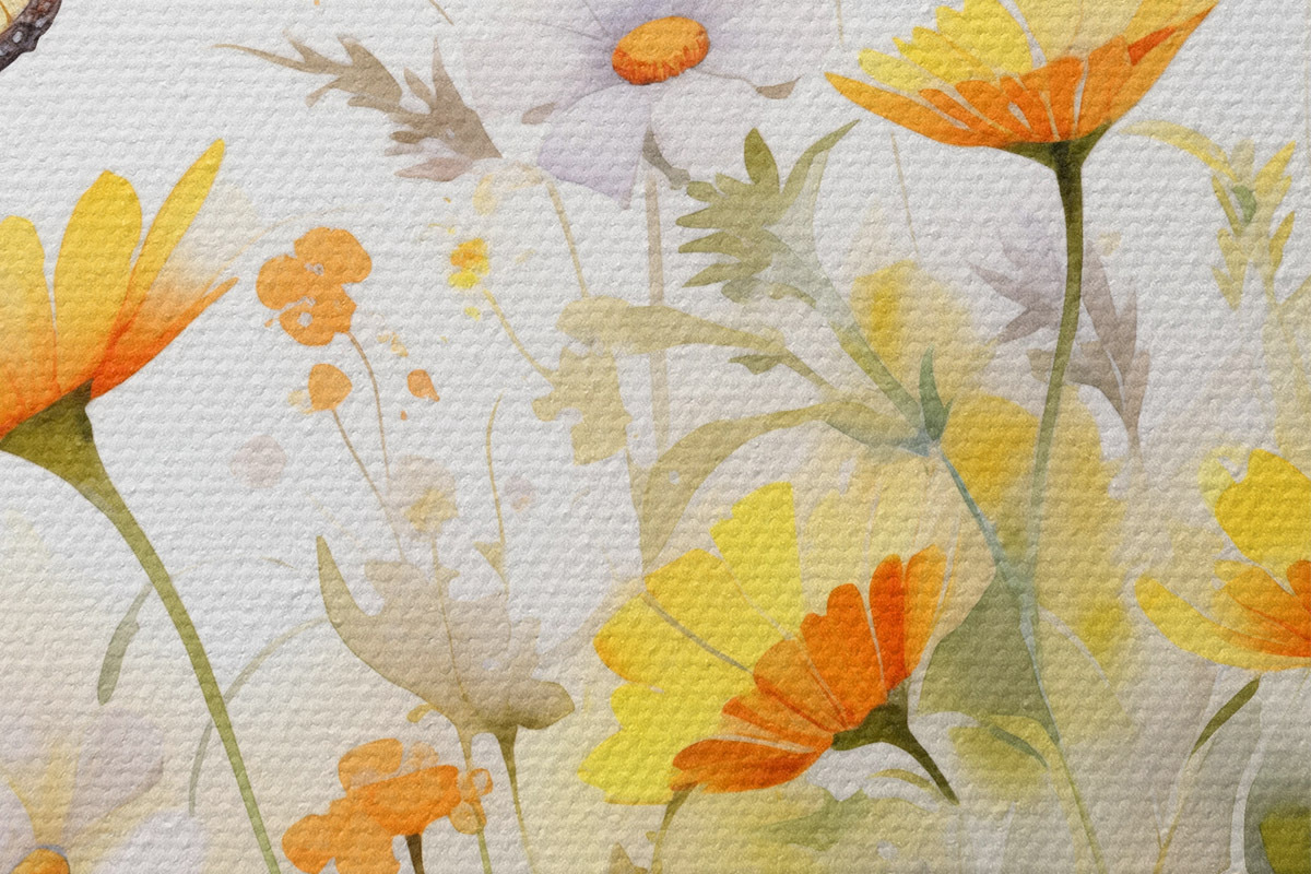 Attēls Spilgts, akvarelim līdzīgs ziedu lauks ar oranžām un baltām margrietiņām un netālu lidojošu tauriņu Nr r42714