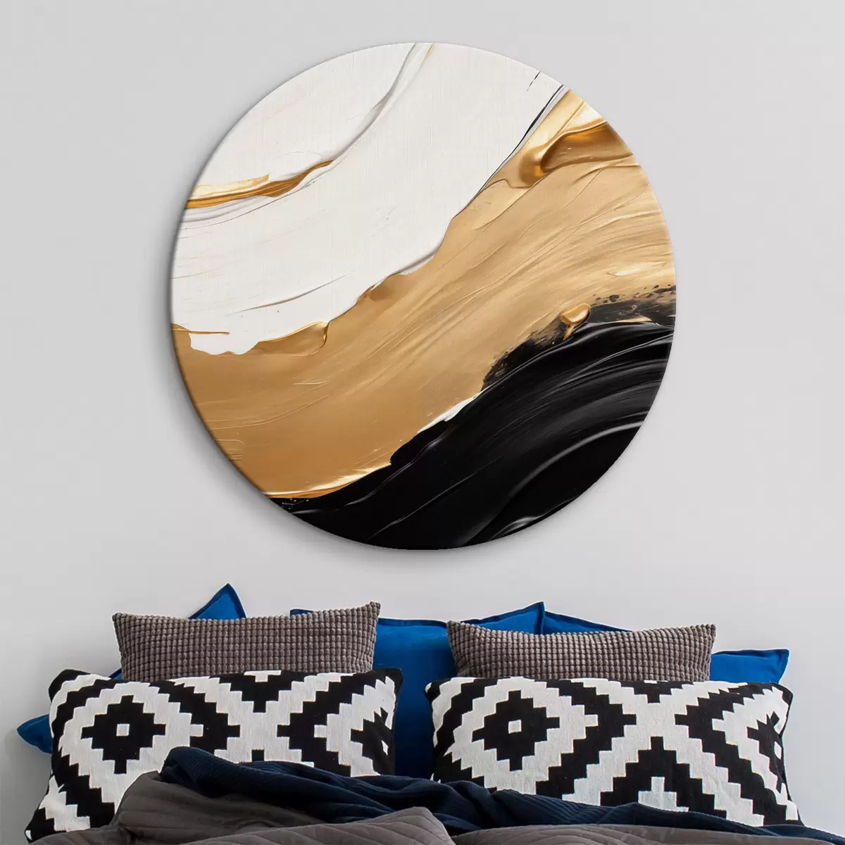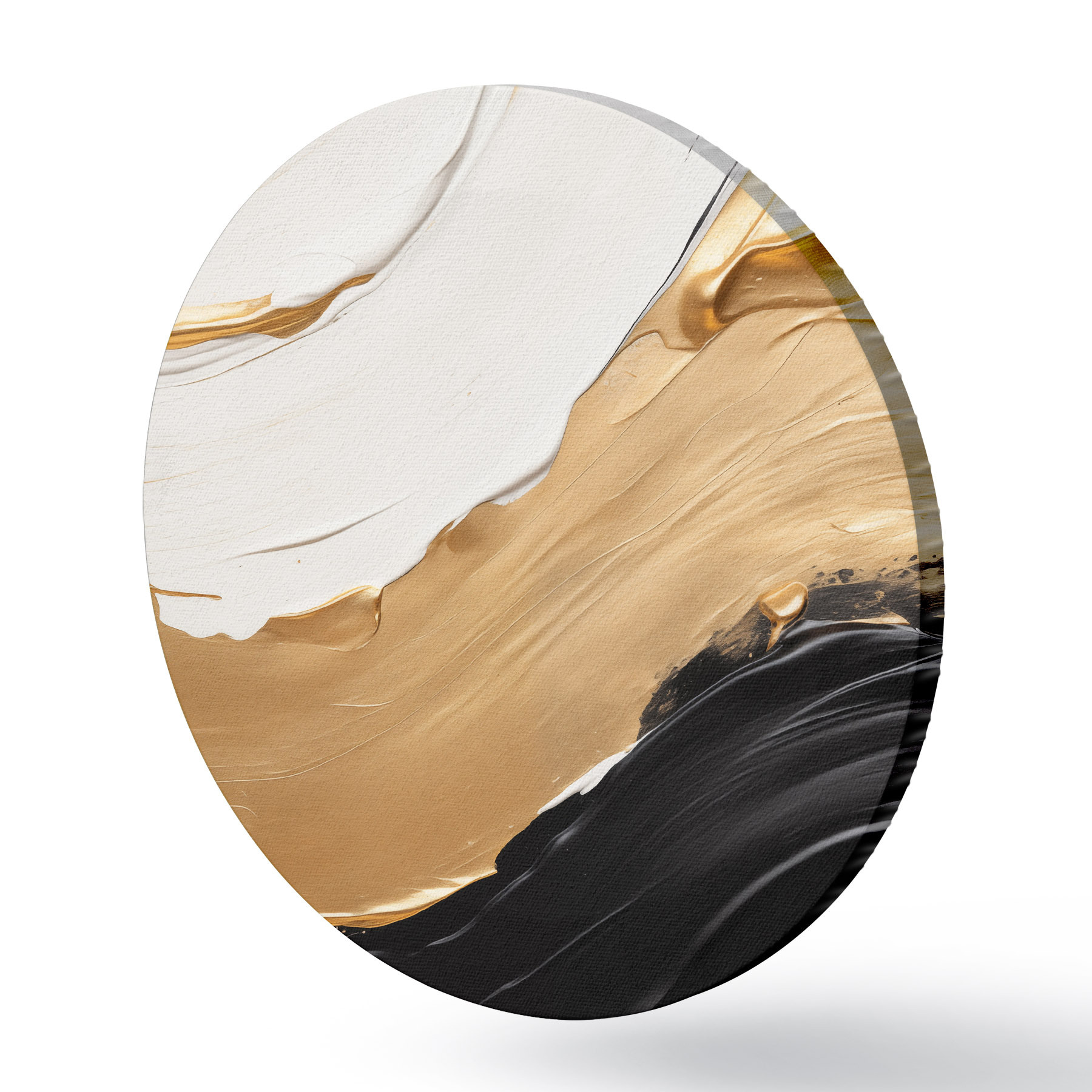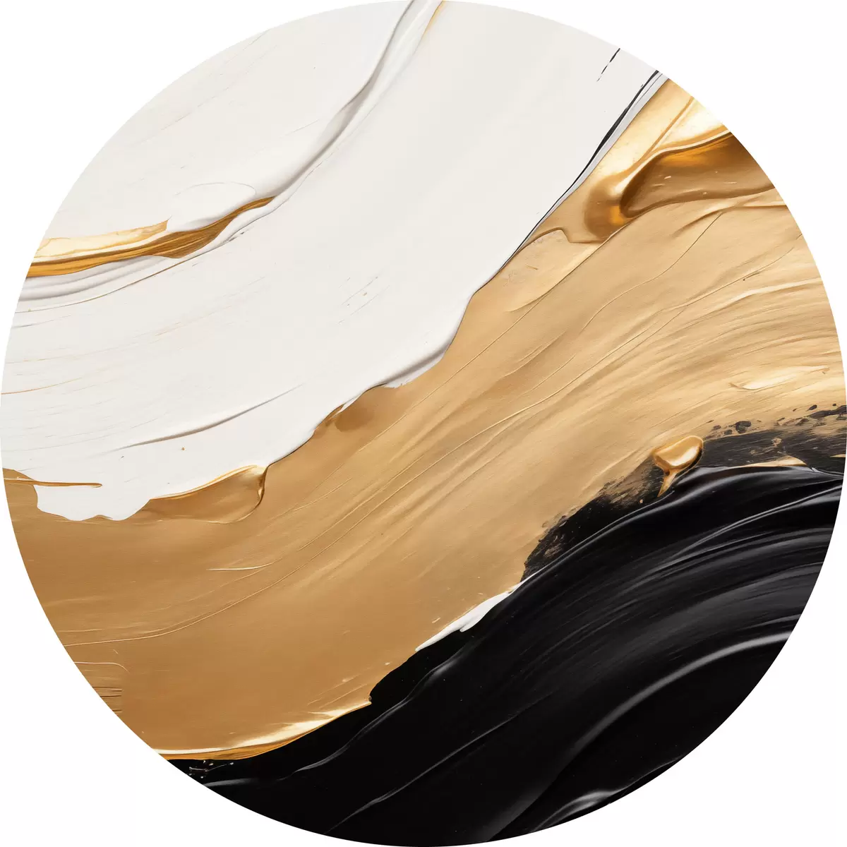 Apaļas gleznas Abstrakta kompozīcija ar drosmīgiem baltas, dzeltenas un melnas krāsas triepieniem r42717