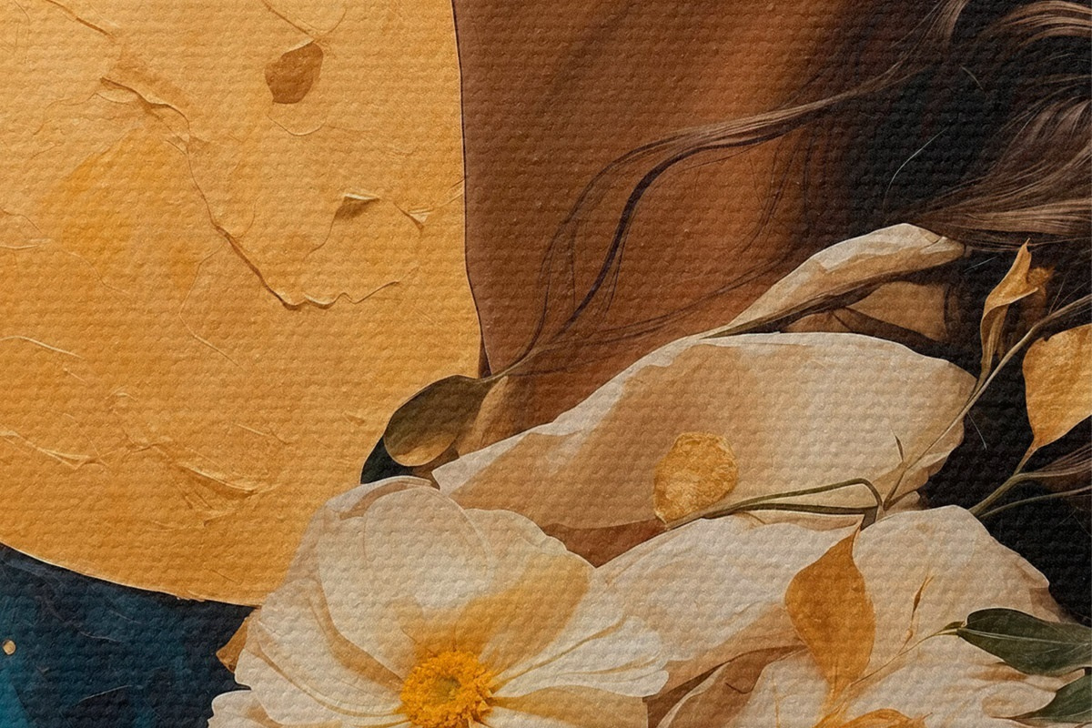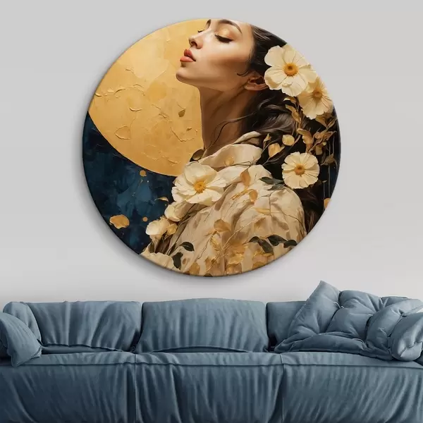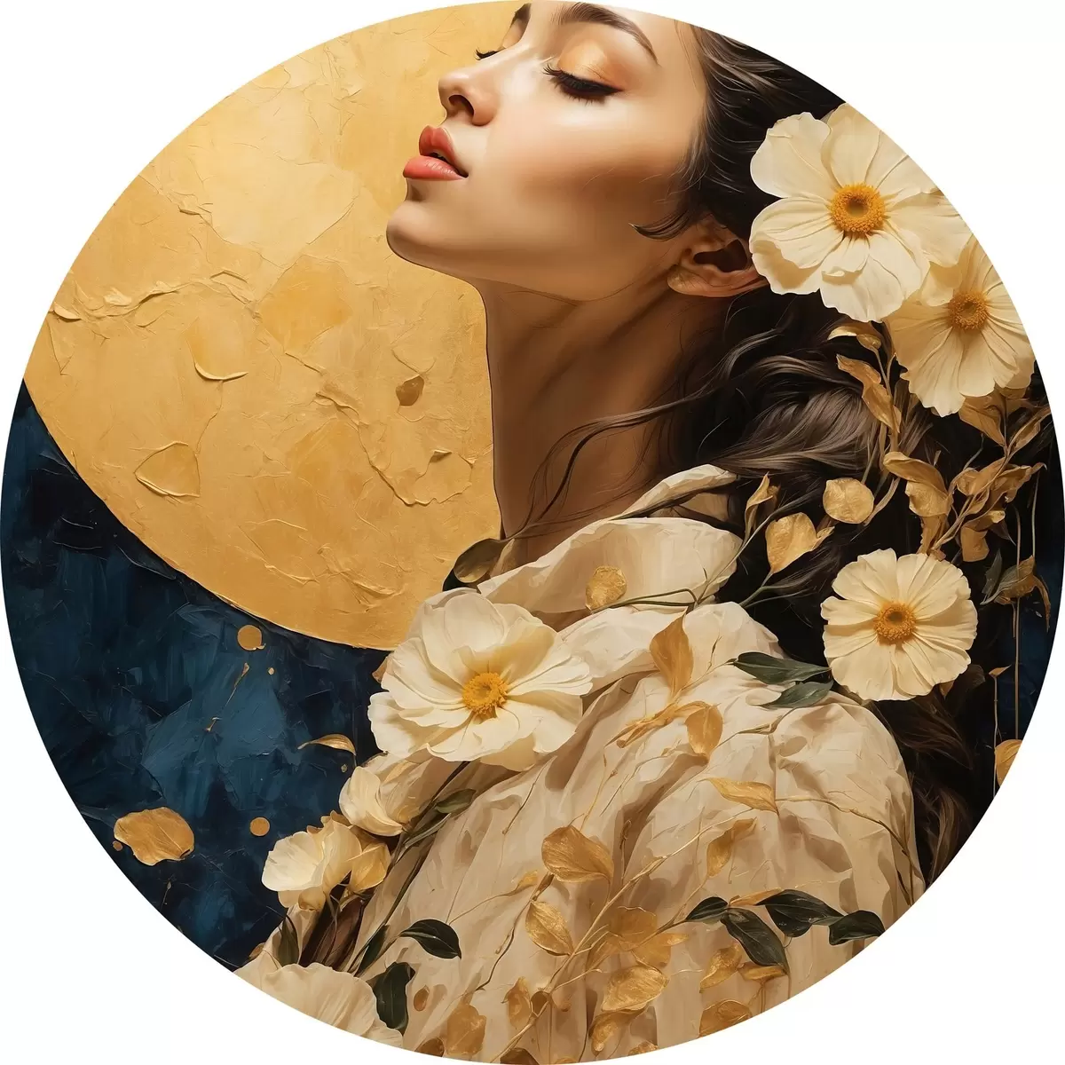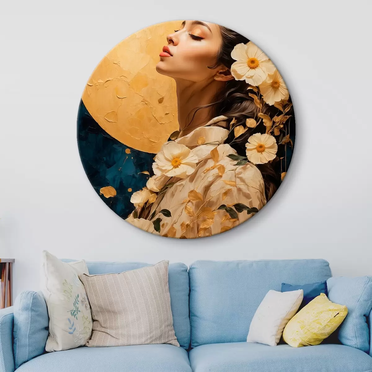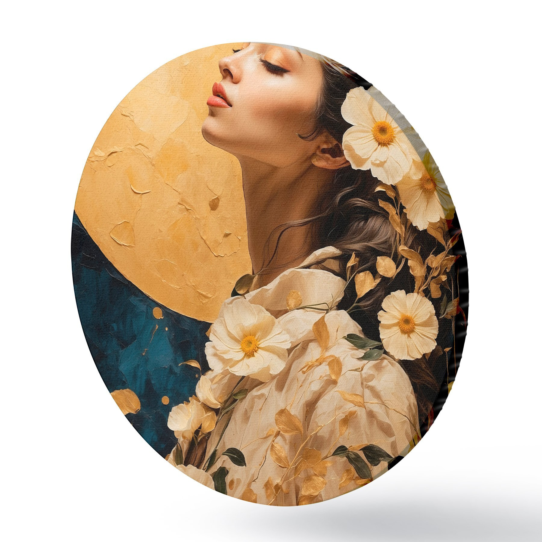 Apaļas gleznas Meitene ar ziediem uz mēness fona r42774