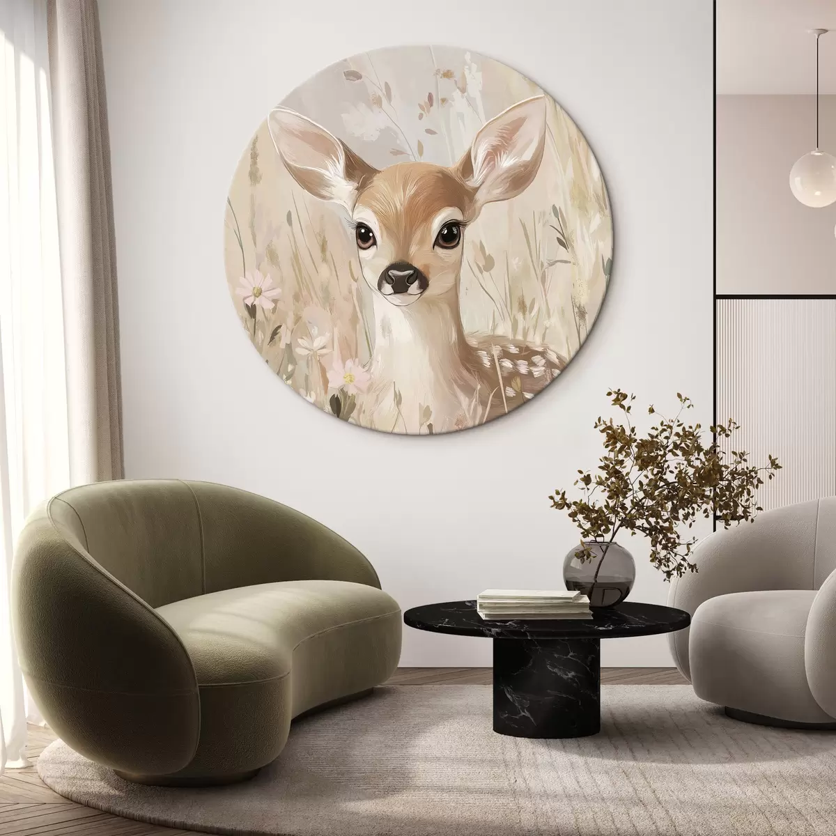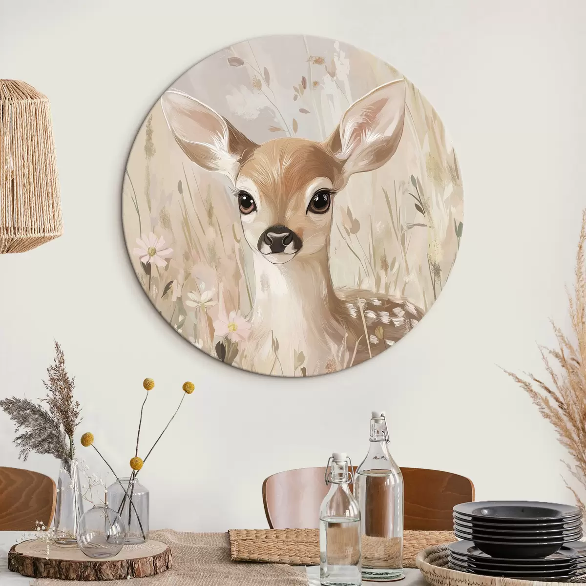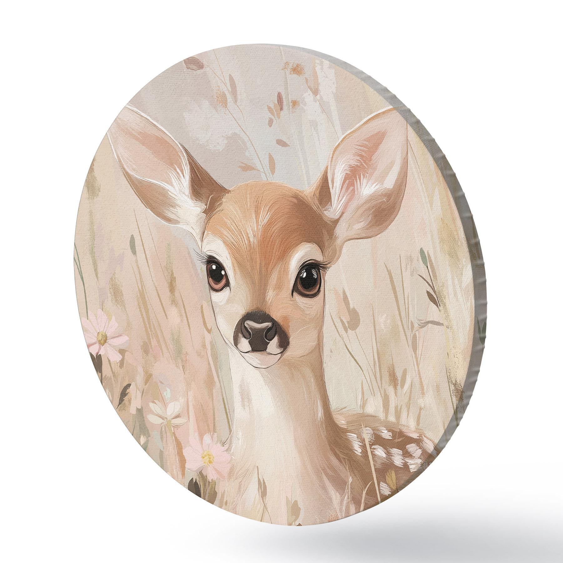 Apaļas gleznas Mazs briedis vasaras pļavā, akrila stila zīmējums, pasteļrozā un smilškrāsas krāsas r42781