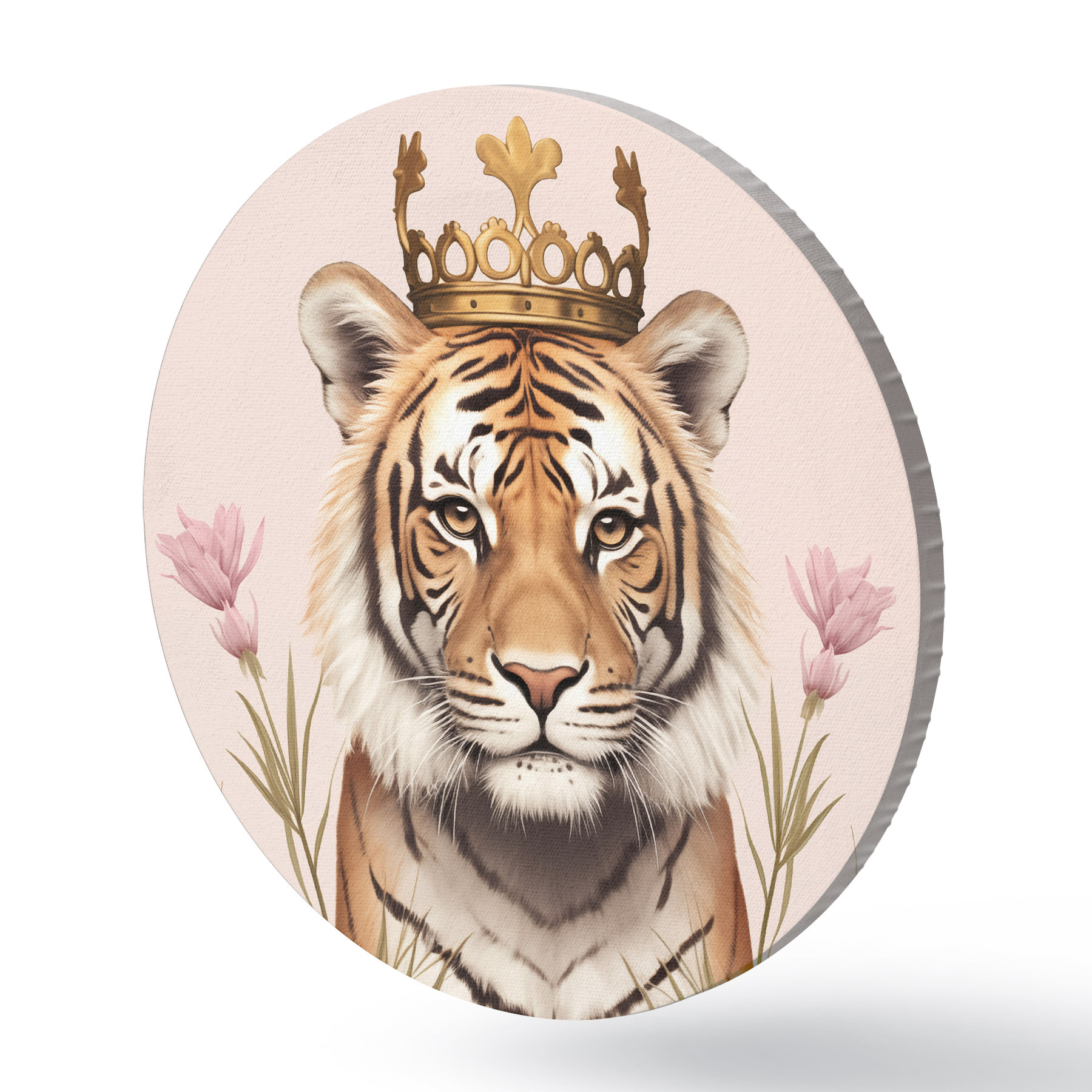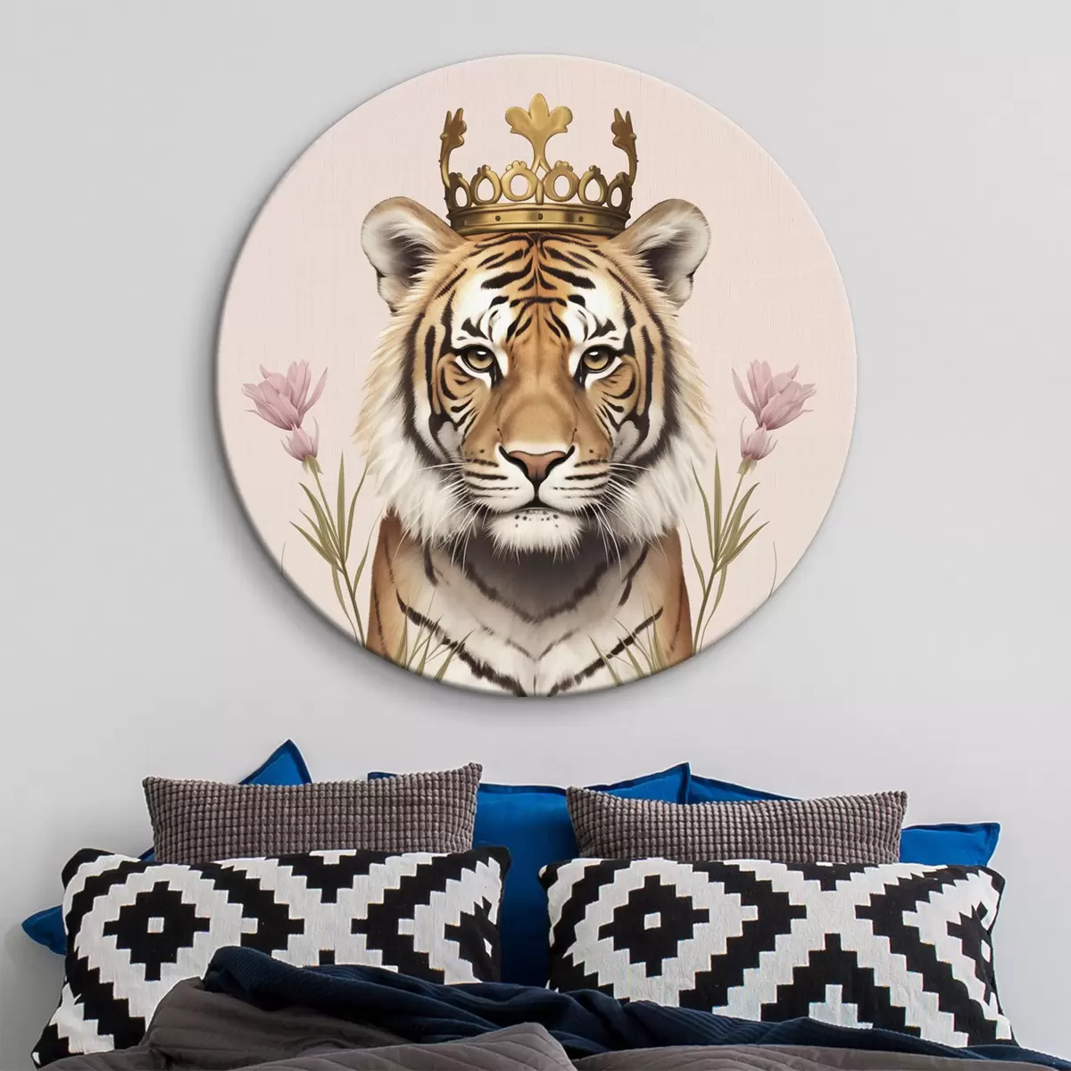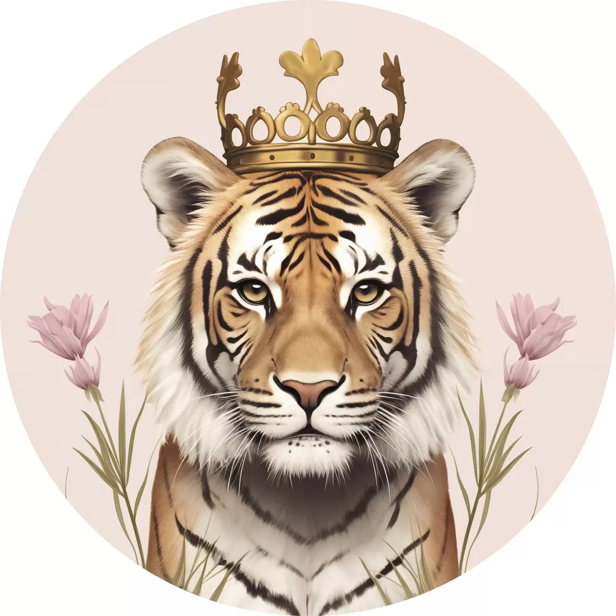 Apaļas gleznas Tīģeris ar kroni, rozā fons, tulpju ziedi r42782