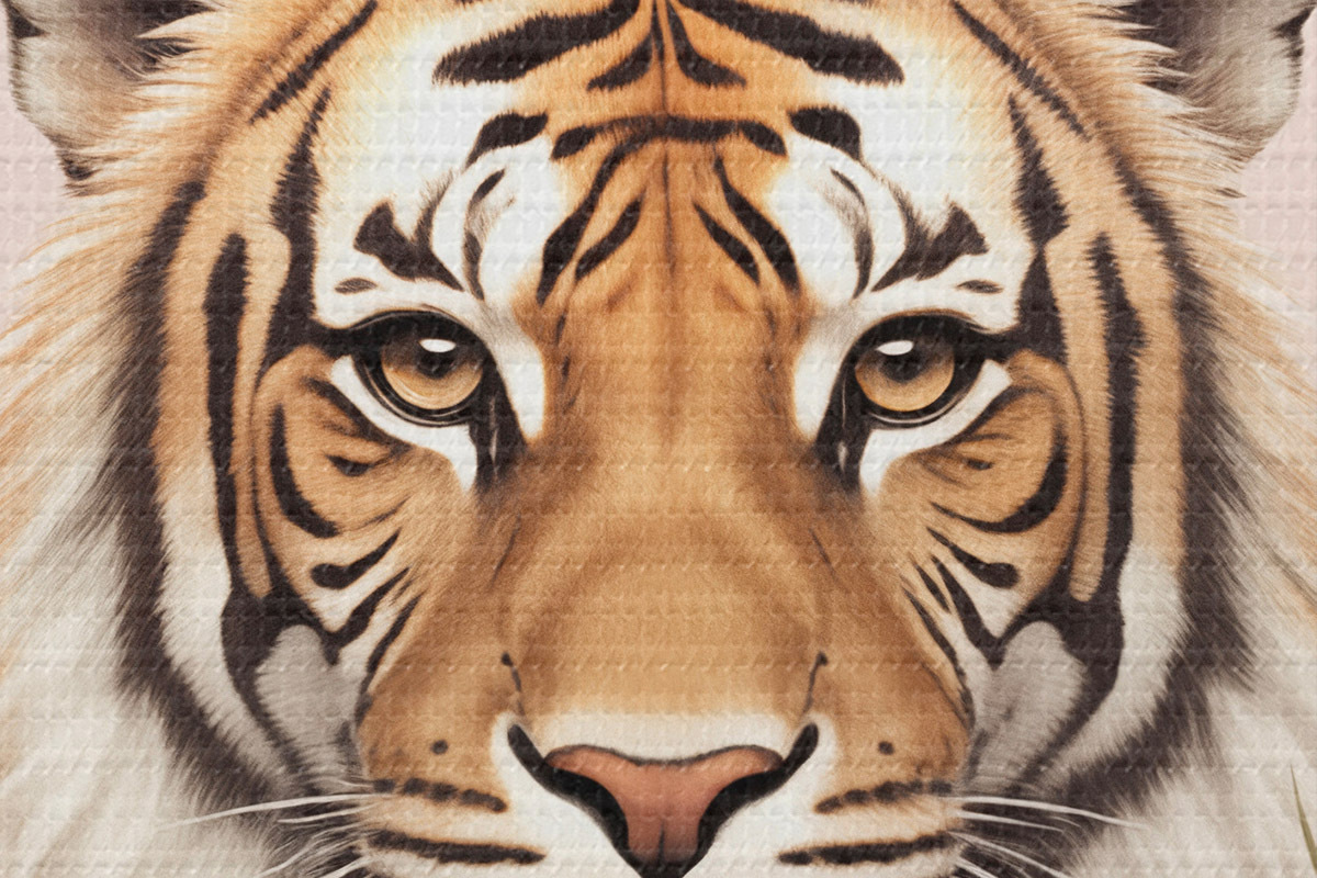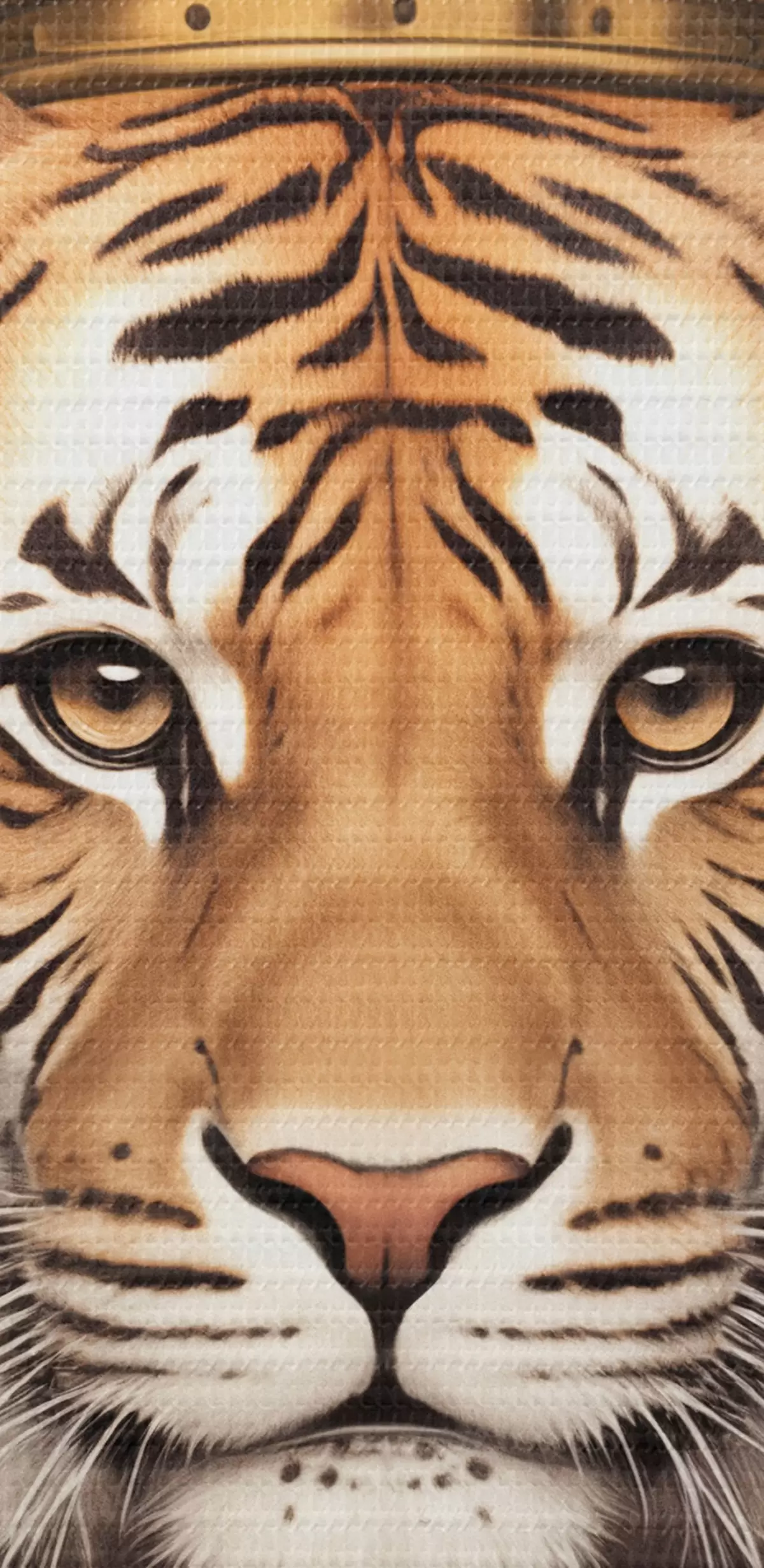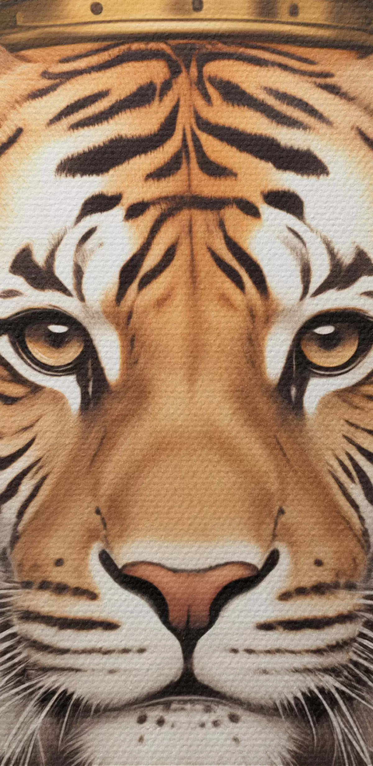 Attēls Tīģeris ar kroni, rozā fons, tulpju ziedi Nr r42782