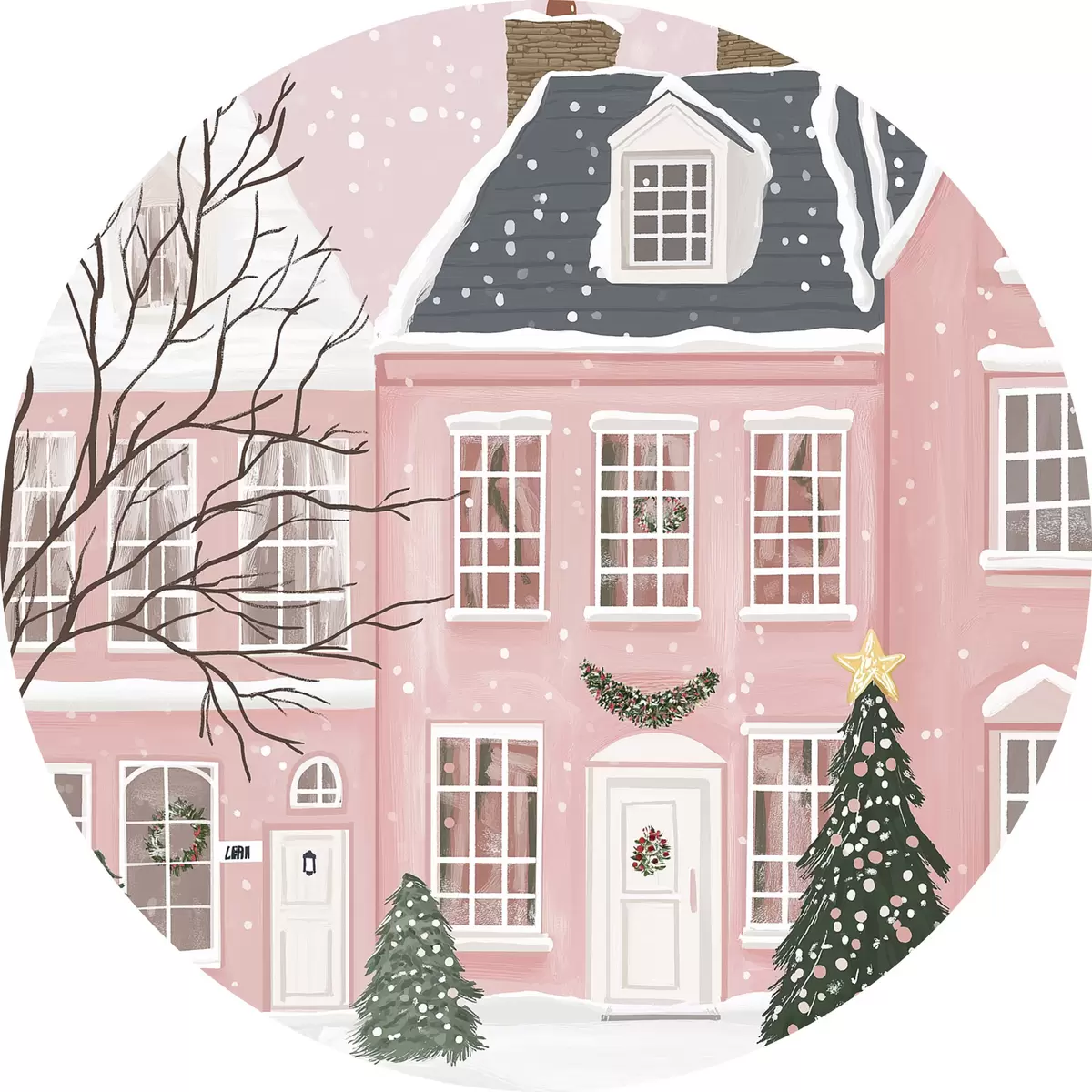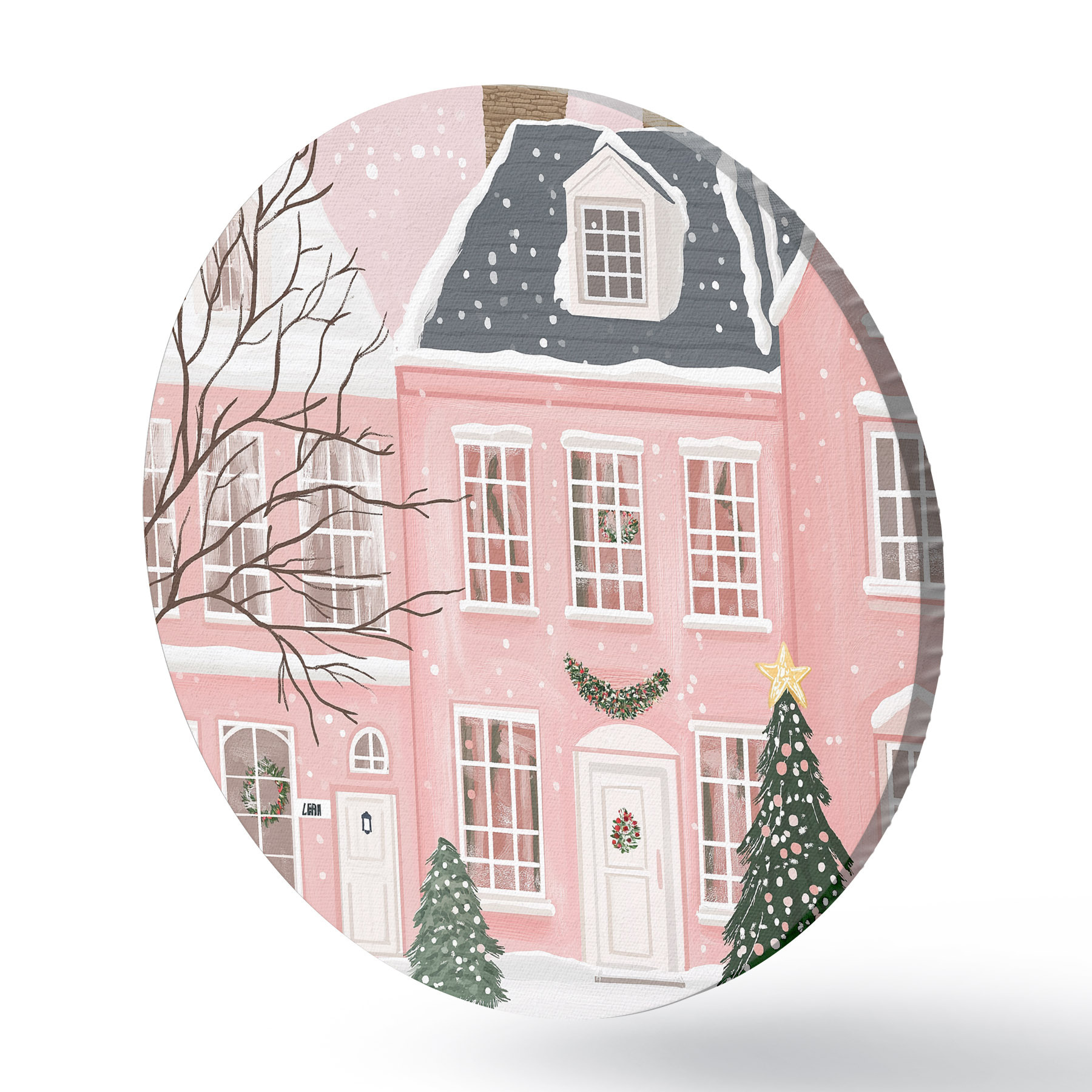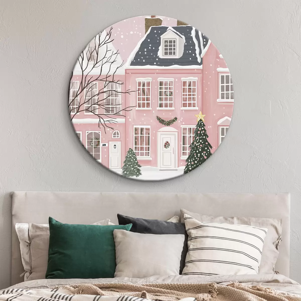 Apaļas gleznas Jauki rozā mājas, priedes, ziemas ainavas r42791