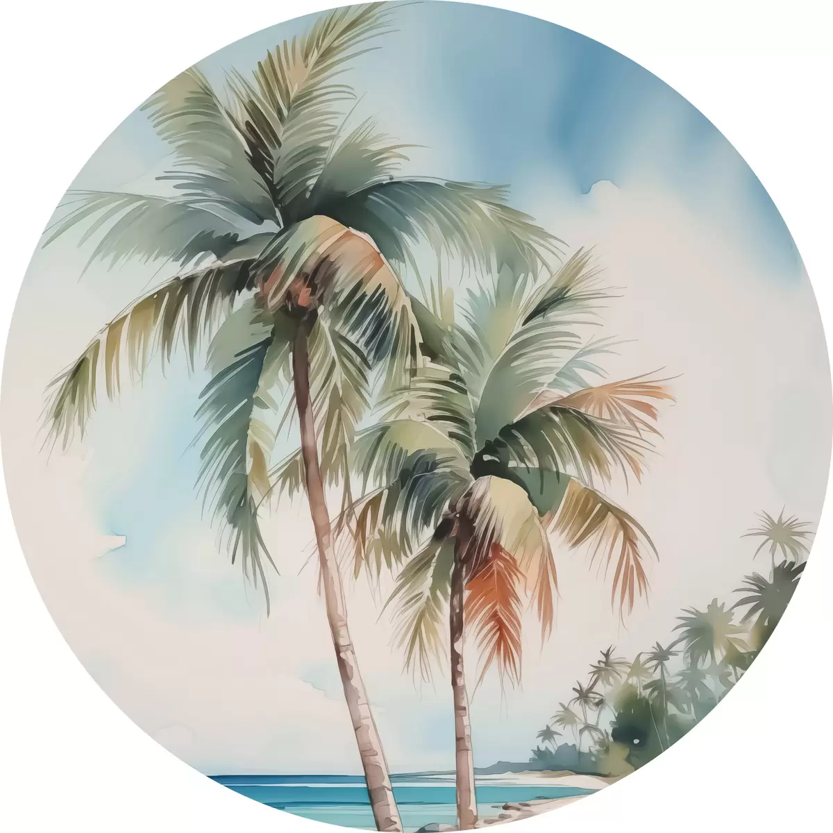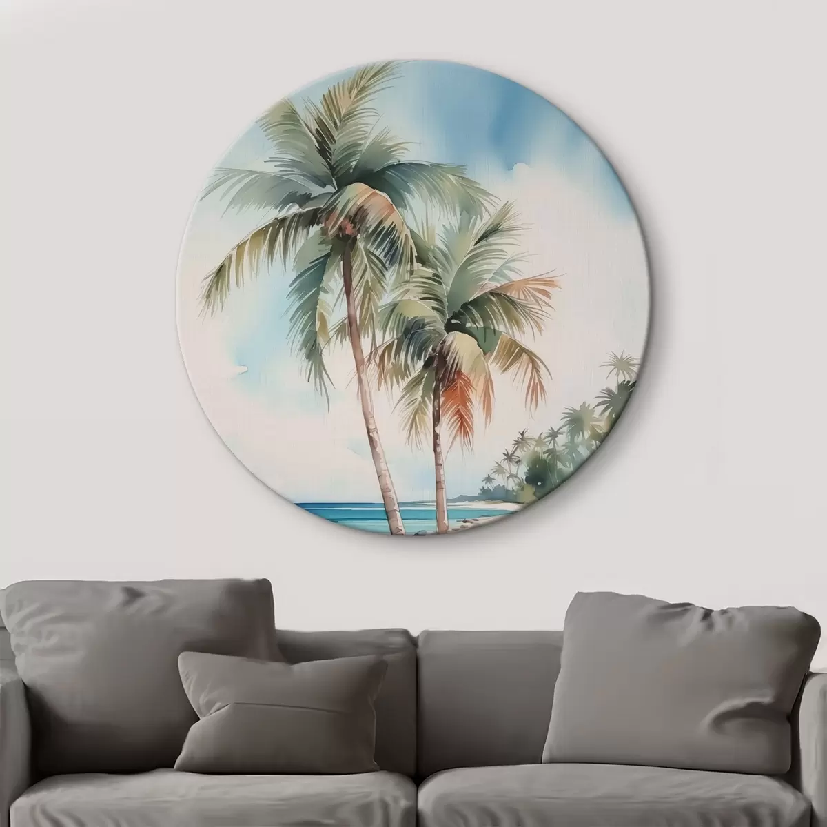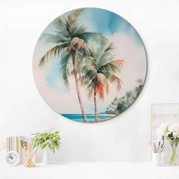 Apaļas gleznas Palmas pie jūras akvareļa imitācija r42958