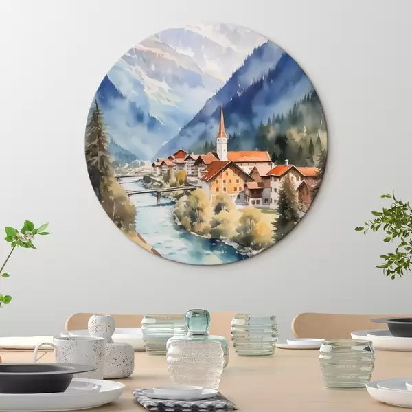 Apaļas gleznas Ciemats pie kalniem imitācija akvarelis r42964
