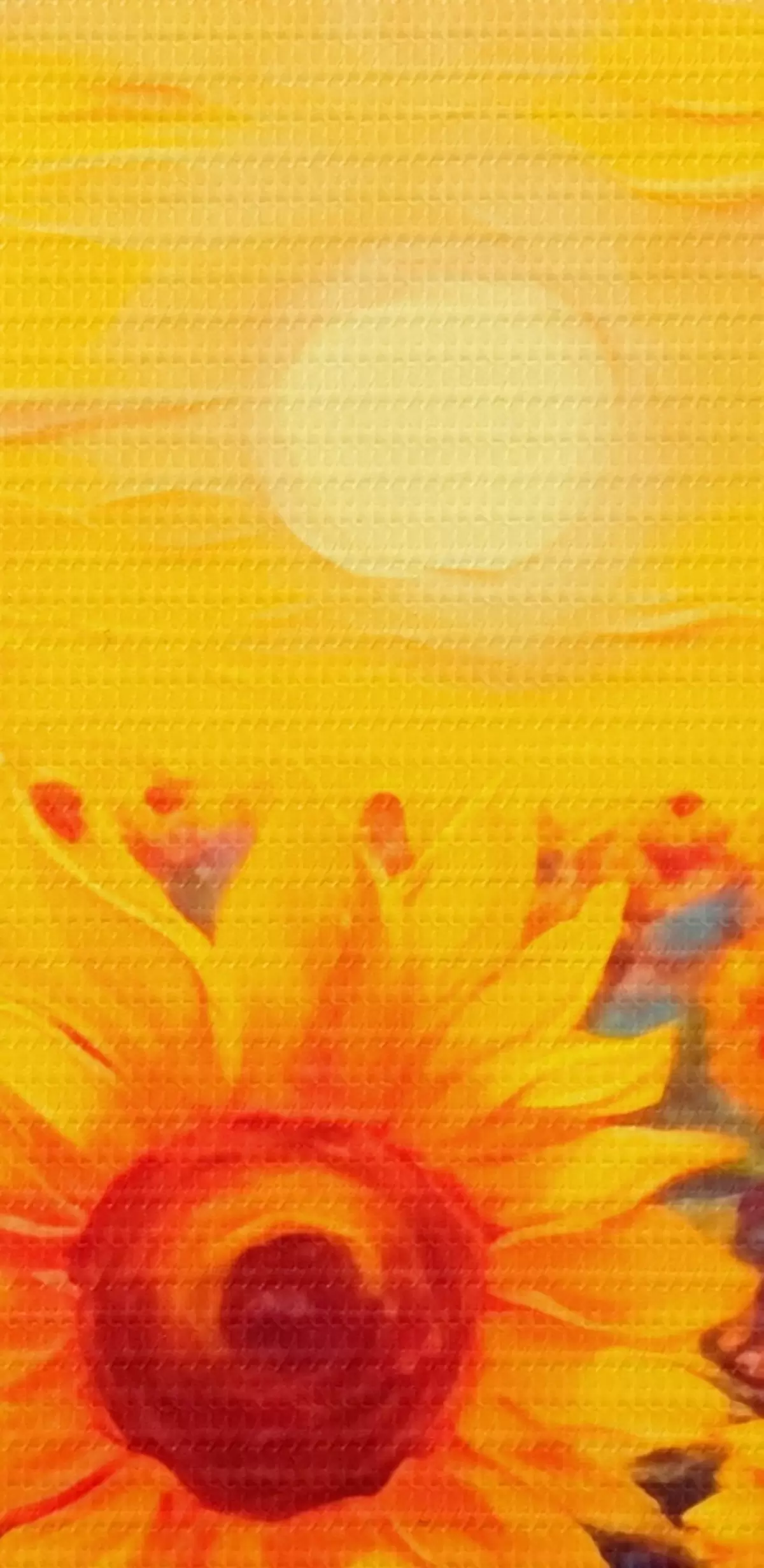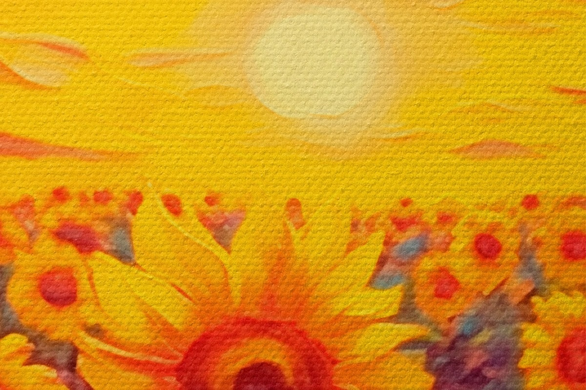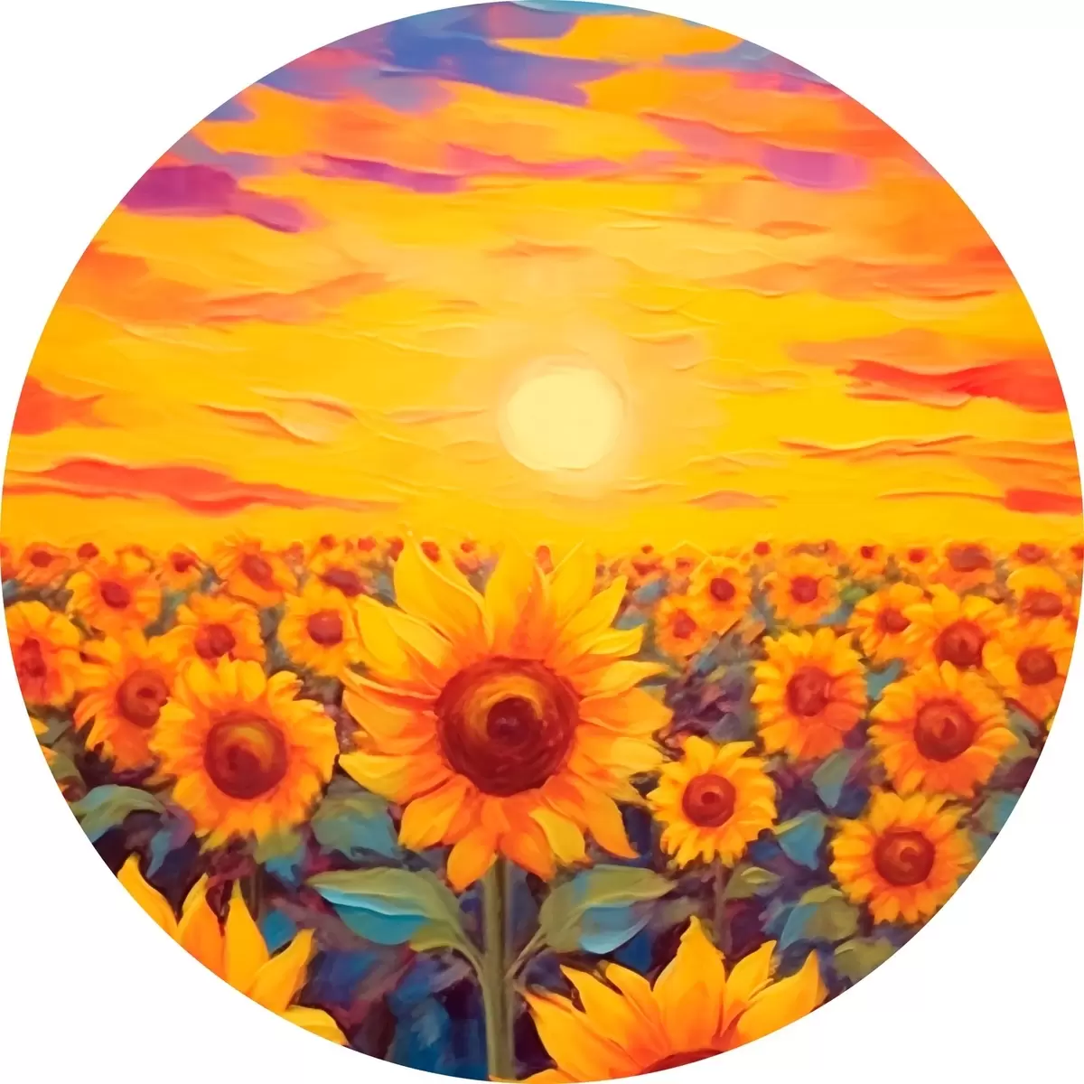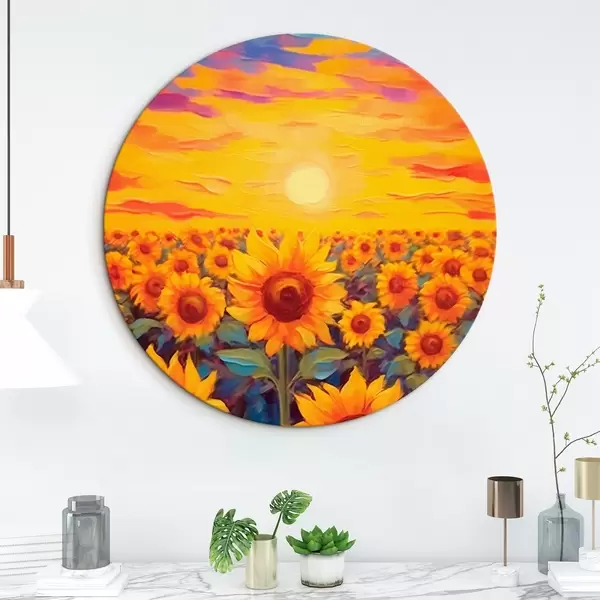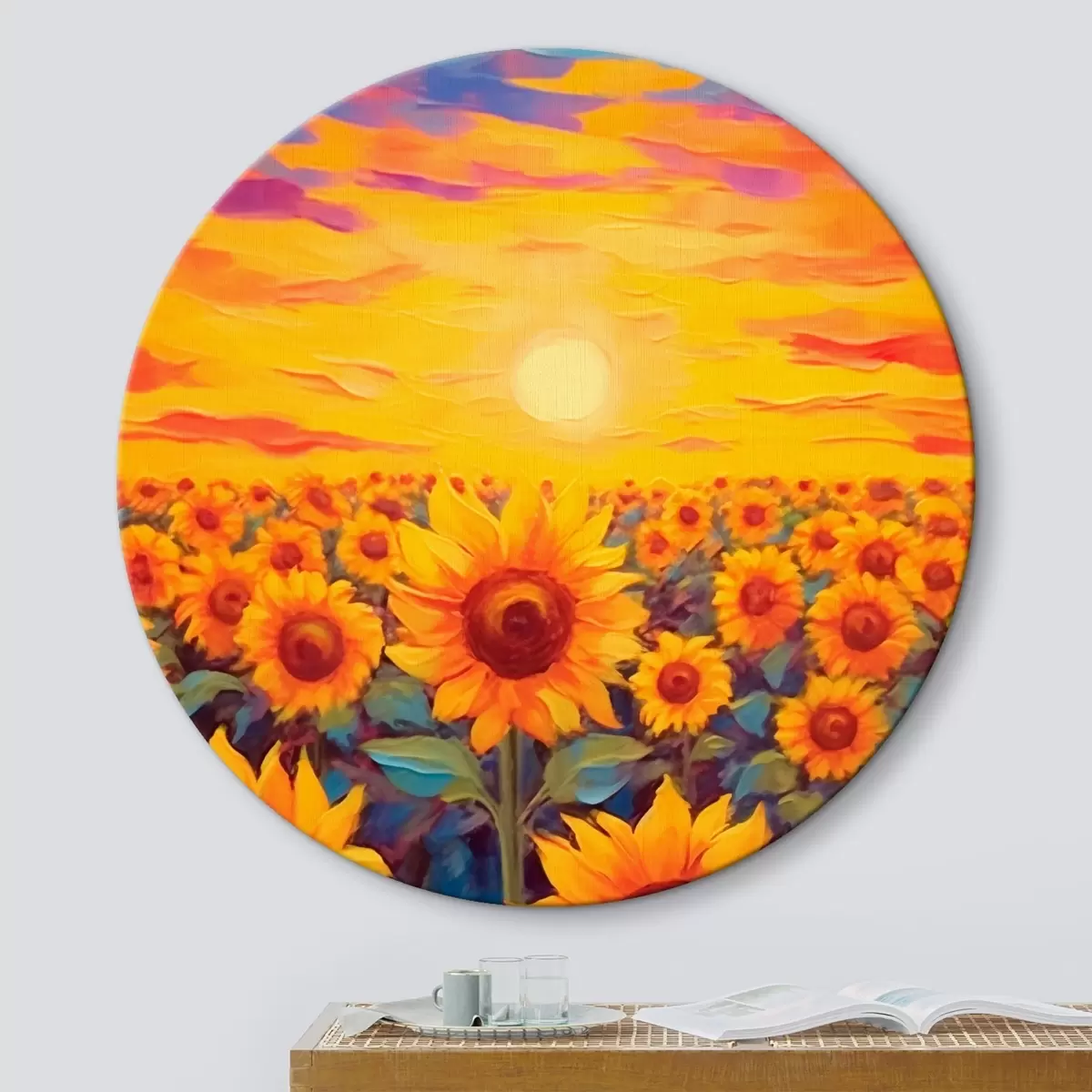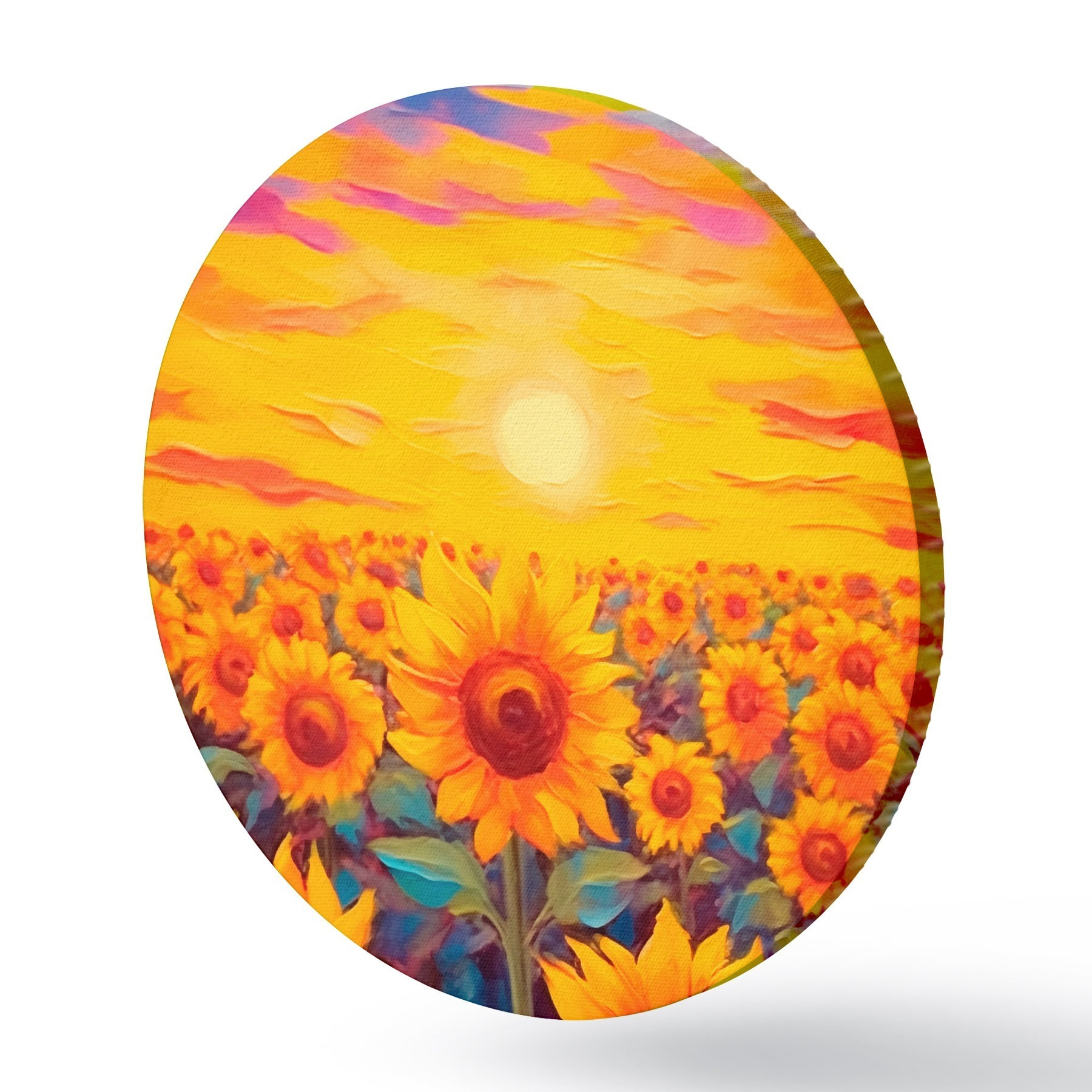 Apaļas gleznas Saulespuķu lauks saulrieta laikā r43010