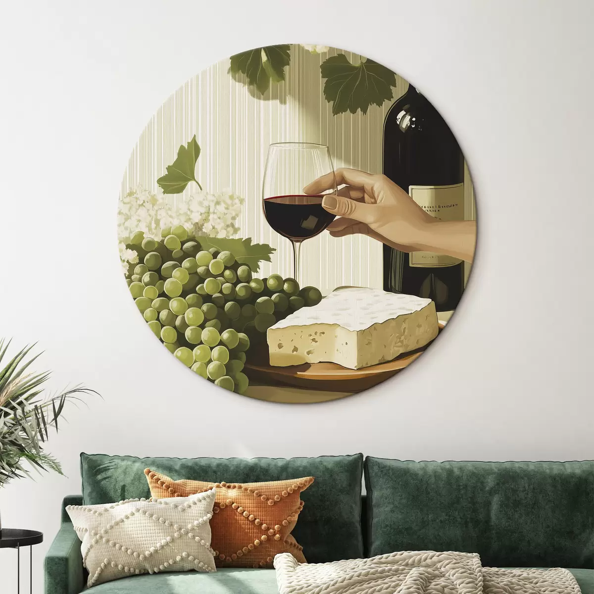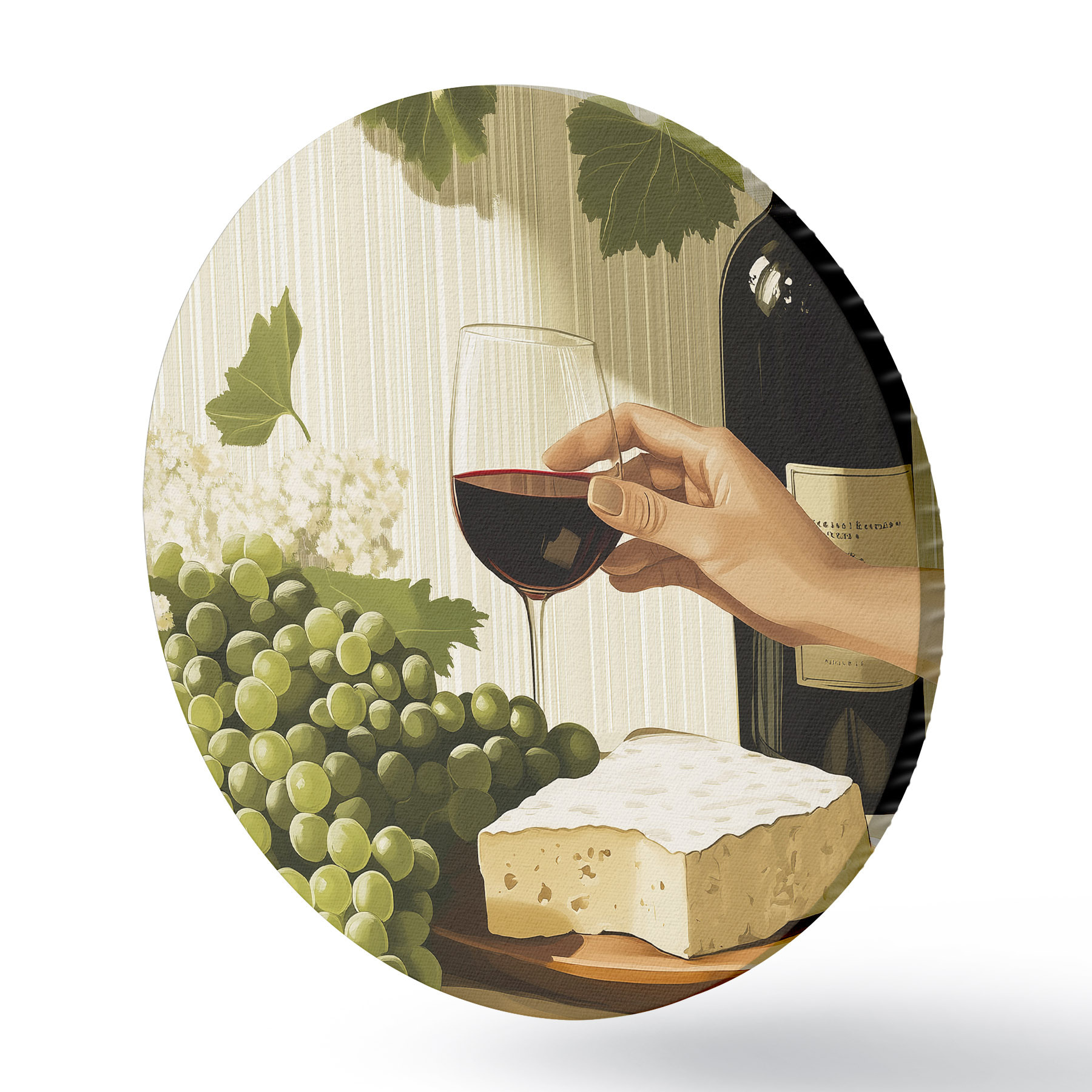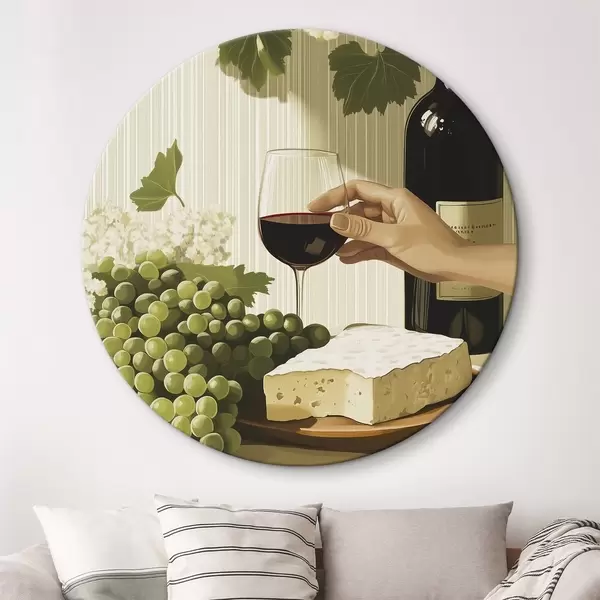 Apaļas gleznas Vīnogas ar sieru, vīna pudele, vintage stila, balti ziedi r43052