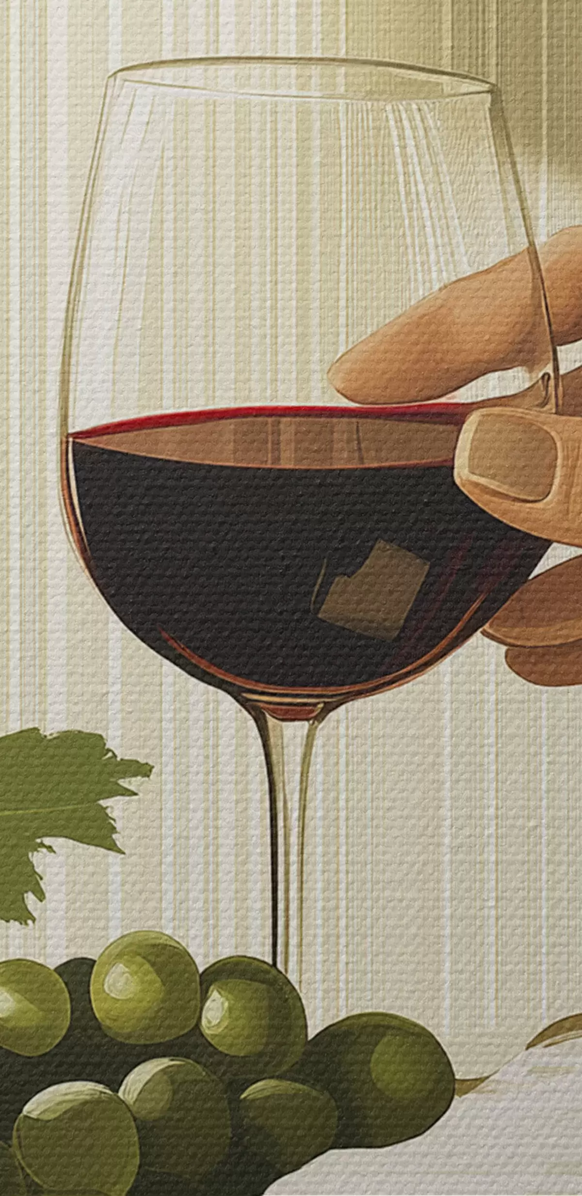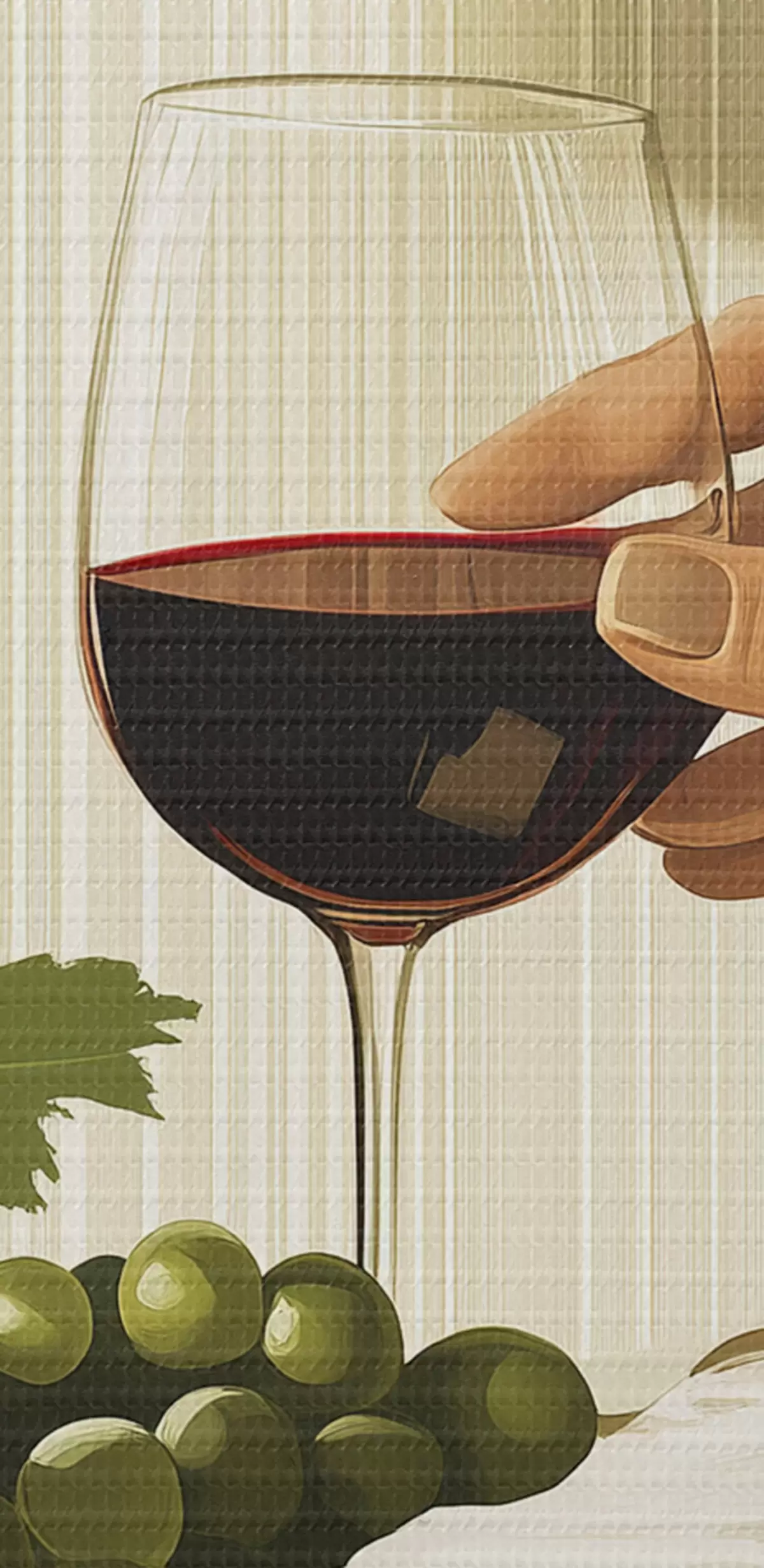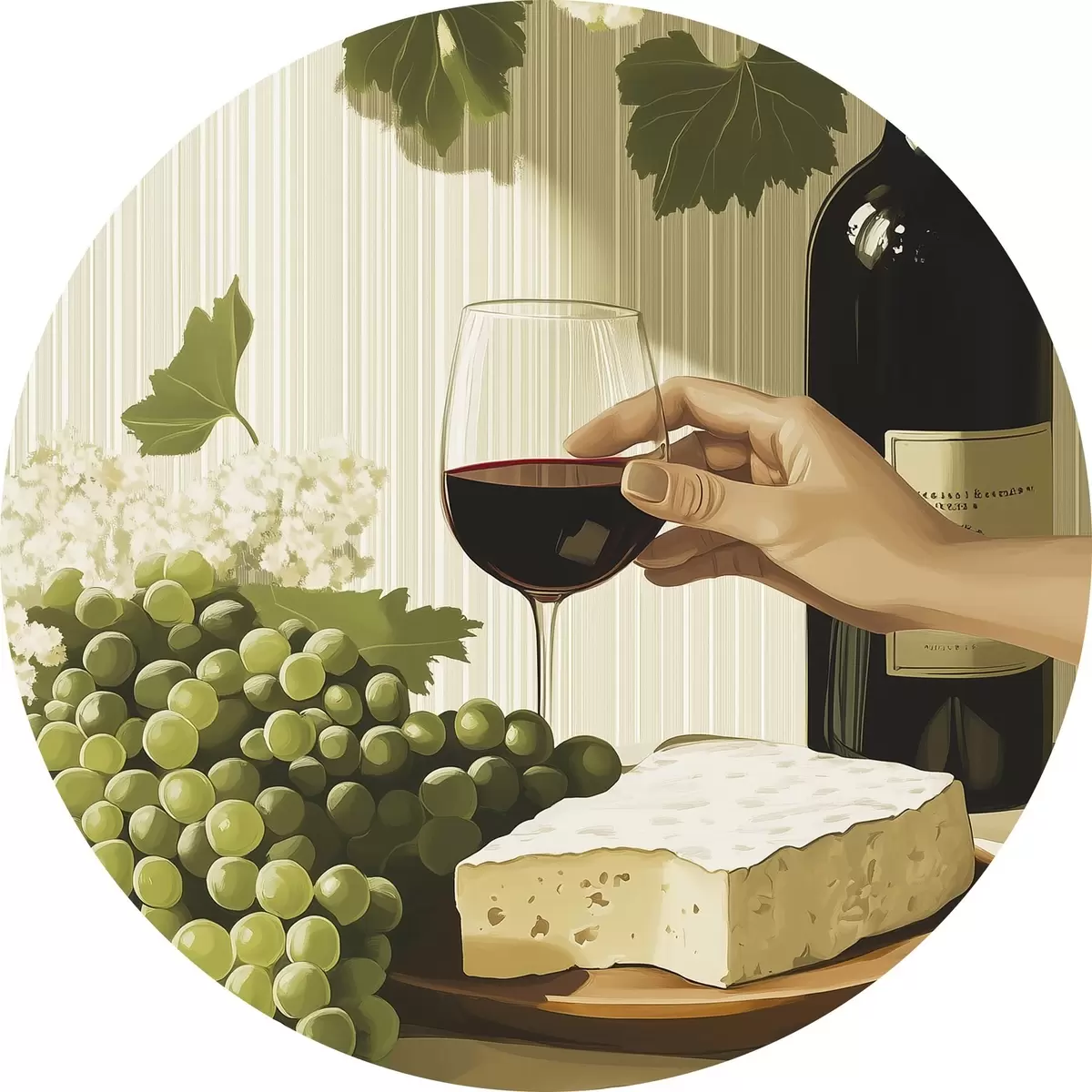 Apaļas gleznas Vīnogas ar sieru, vīna pudele, vintage stila, balti ziedi r43052
