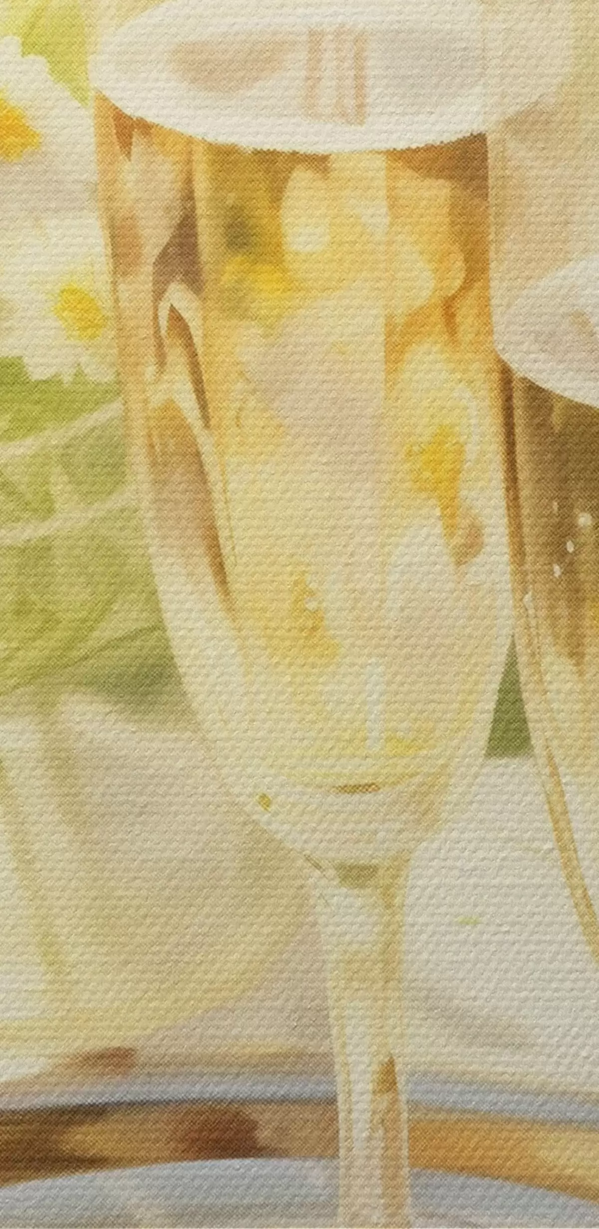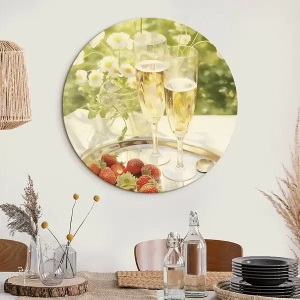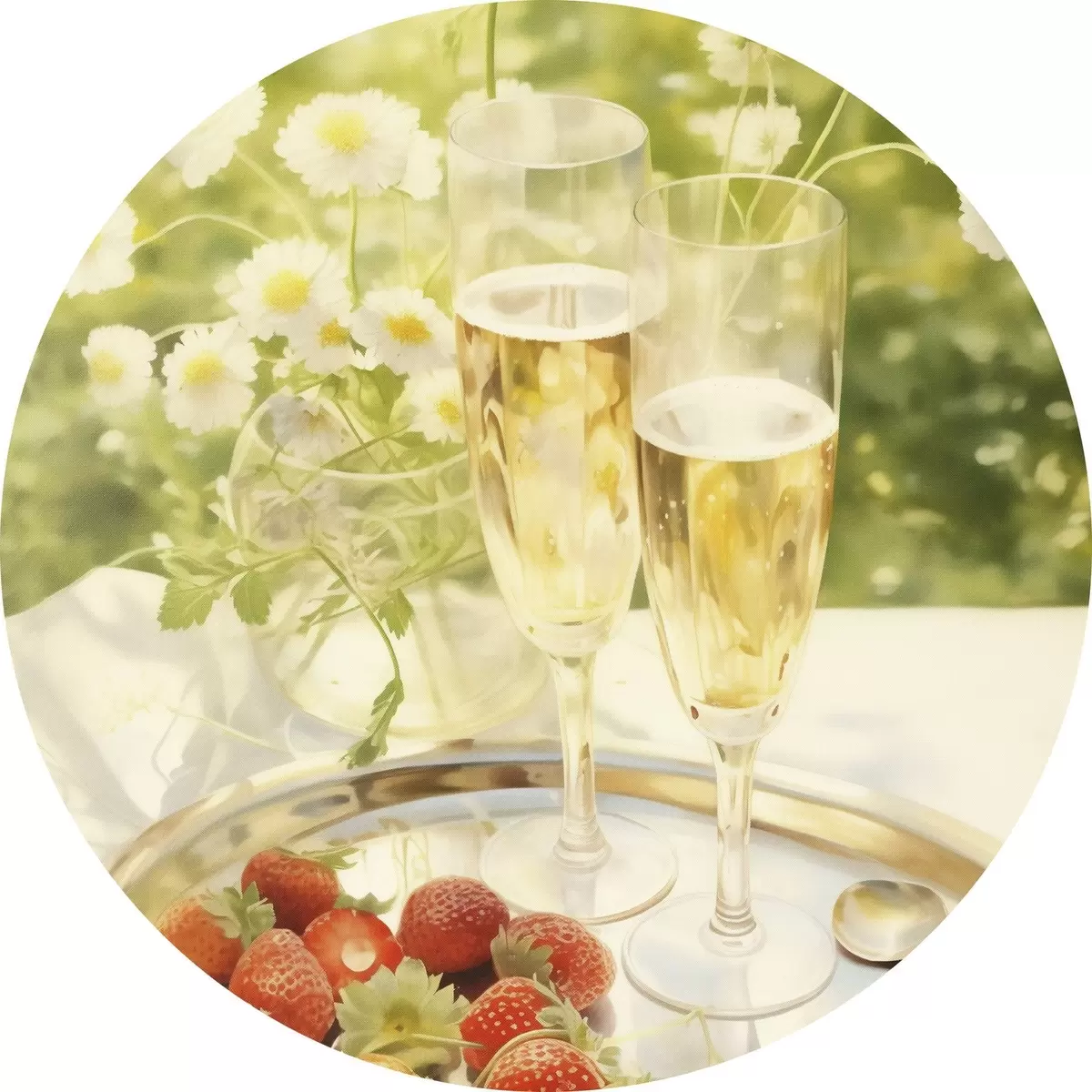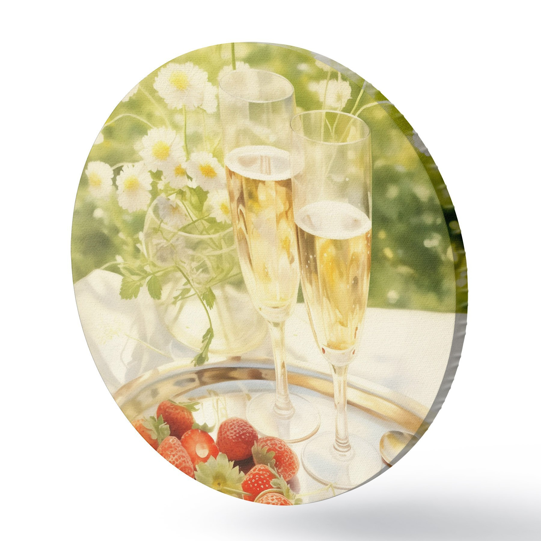 Apaļas gleznas Šampanieša glāzes ar zemenēm uz paplātes, kumelīšu ziedi, vasara r43054