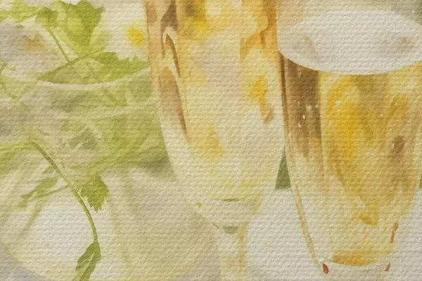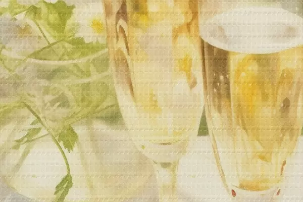 Attēls Šampanieša glāzes ar zemenēm uz paplātes, kumelīšu ziedi, vasara Nr r43054