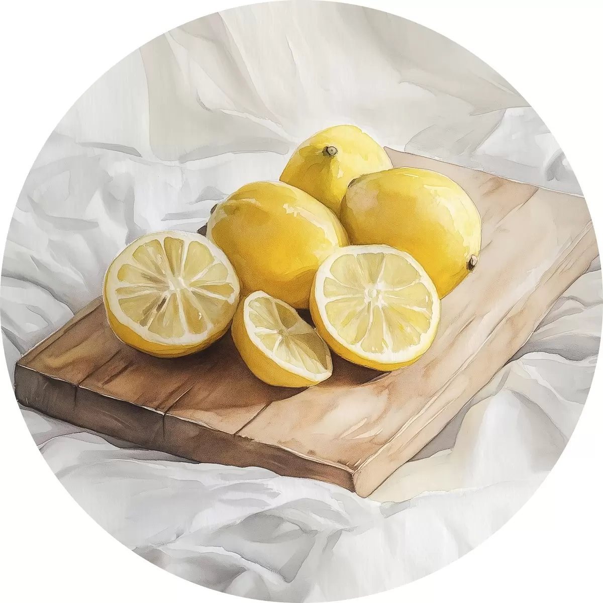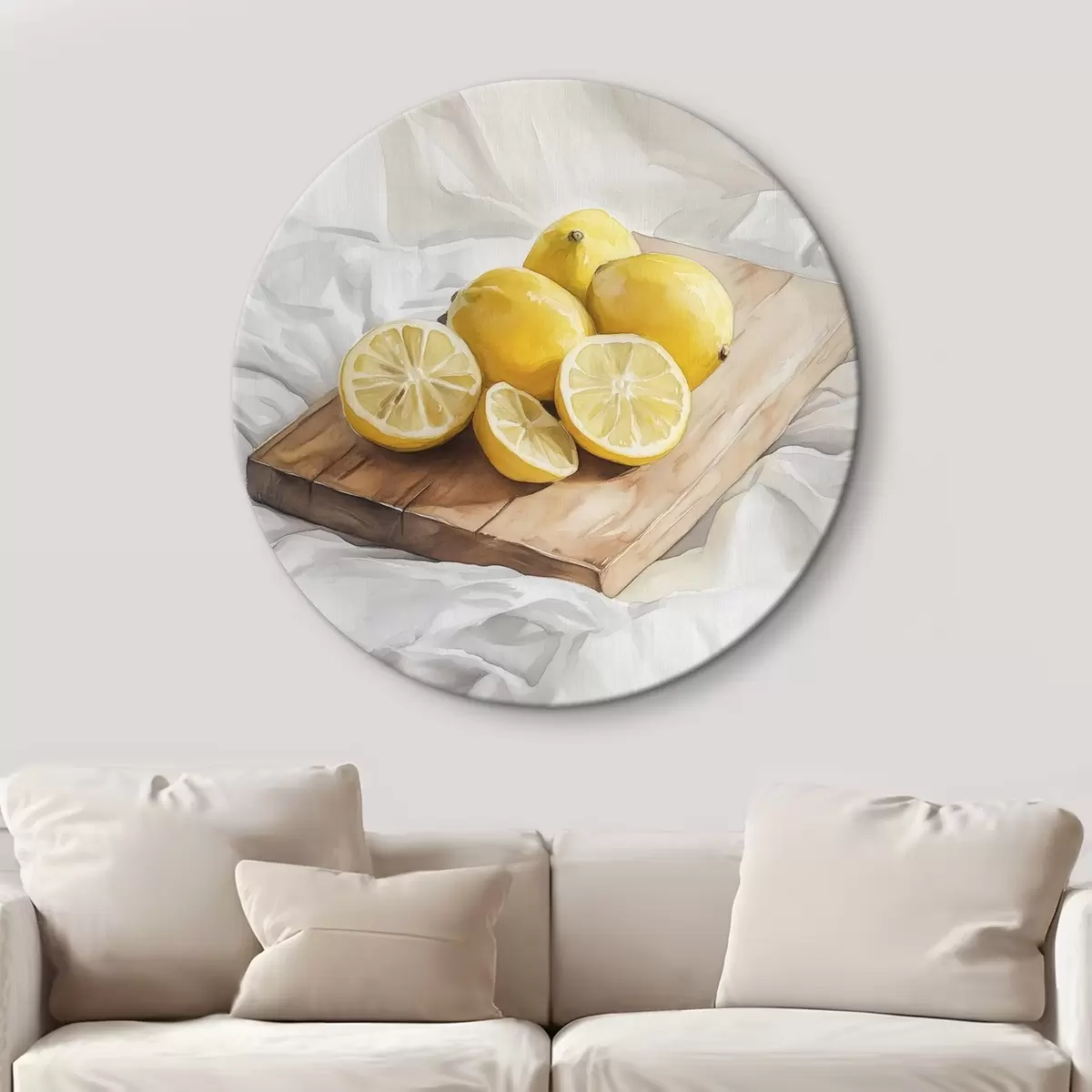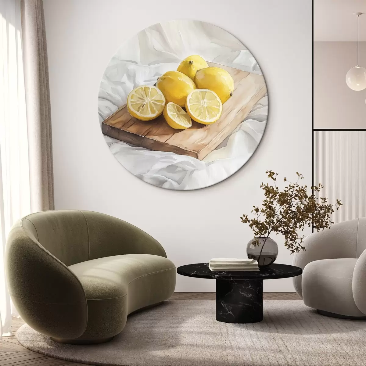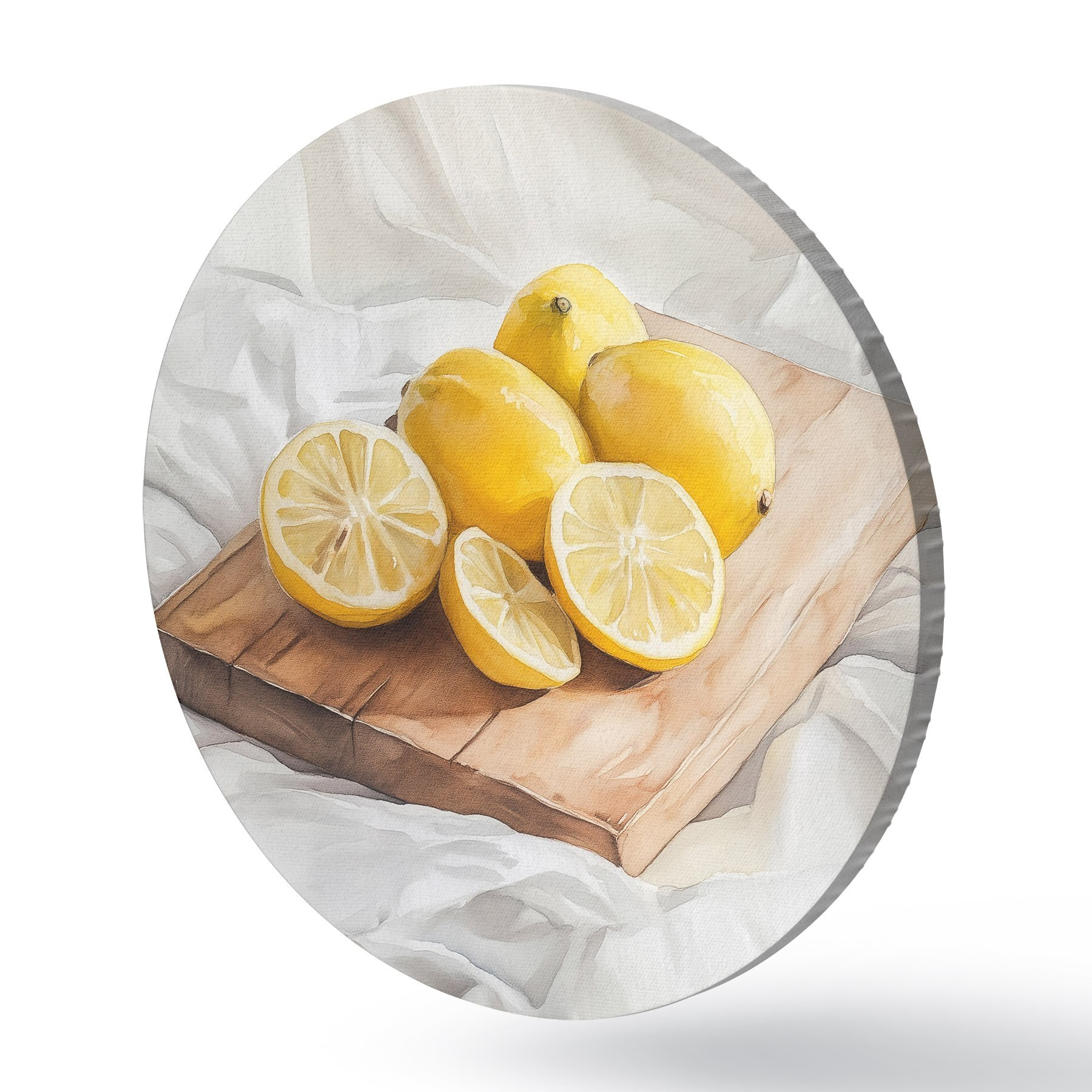 Apaļas gleznas Estētiski citroni uz koka dēļa, mājas apdare, dabiskais apgaismojums r43062