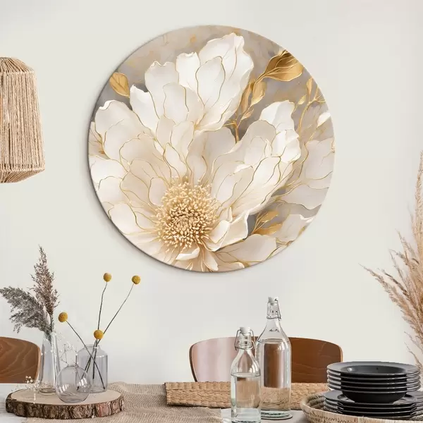 Apaļas gleznas Balts zieds ar lapām akrila glezniecības stilā r43115