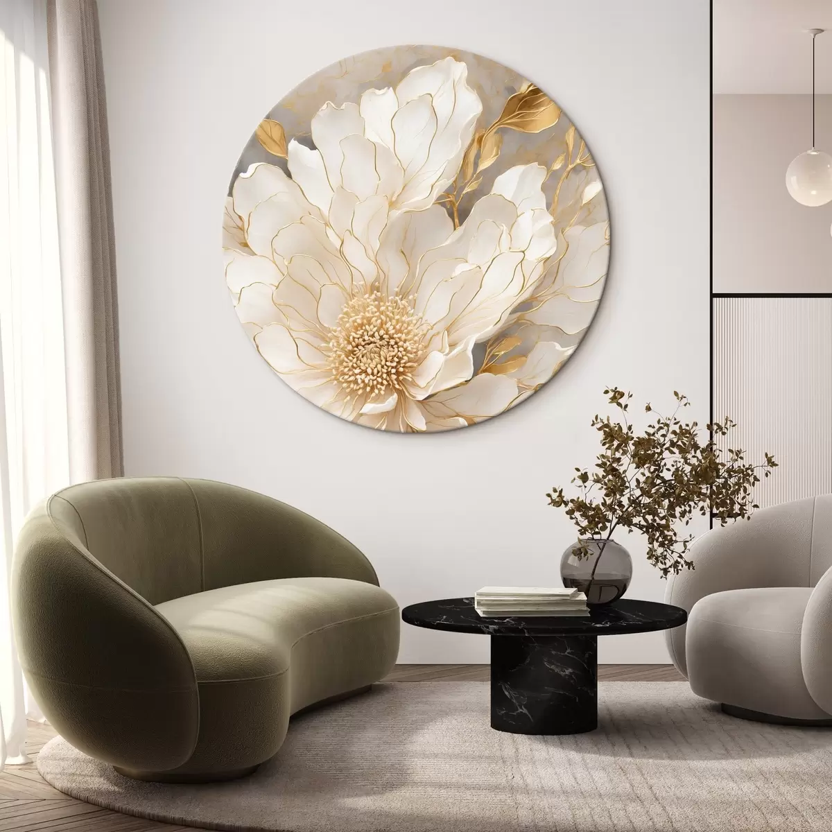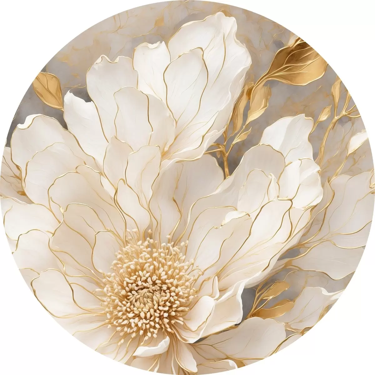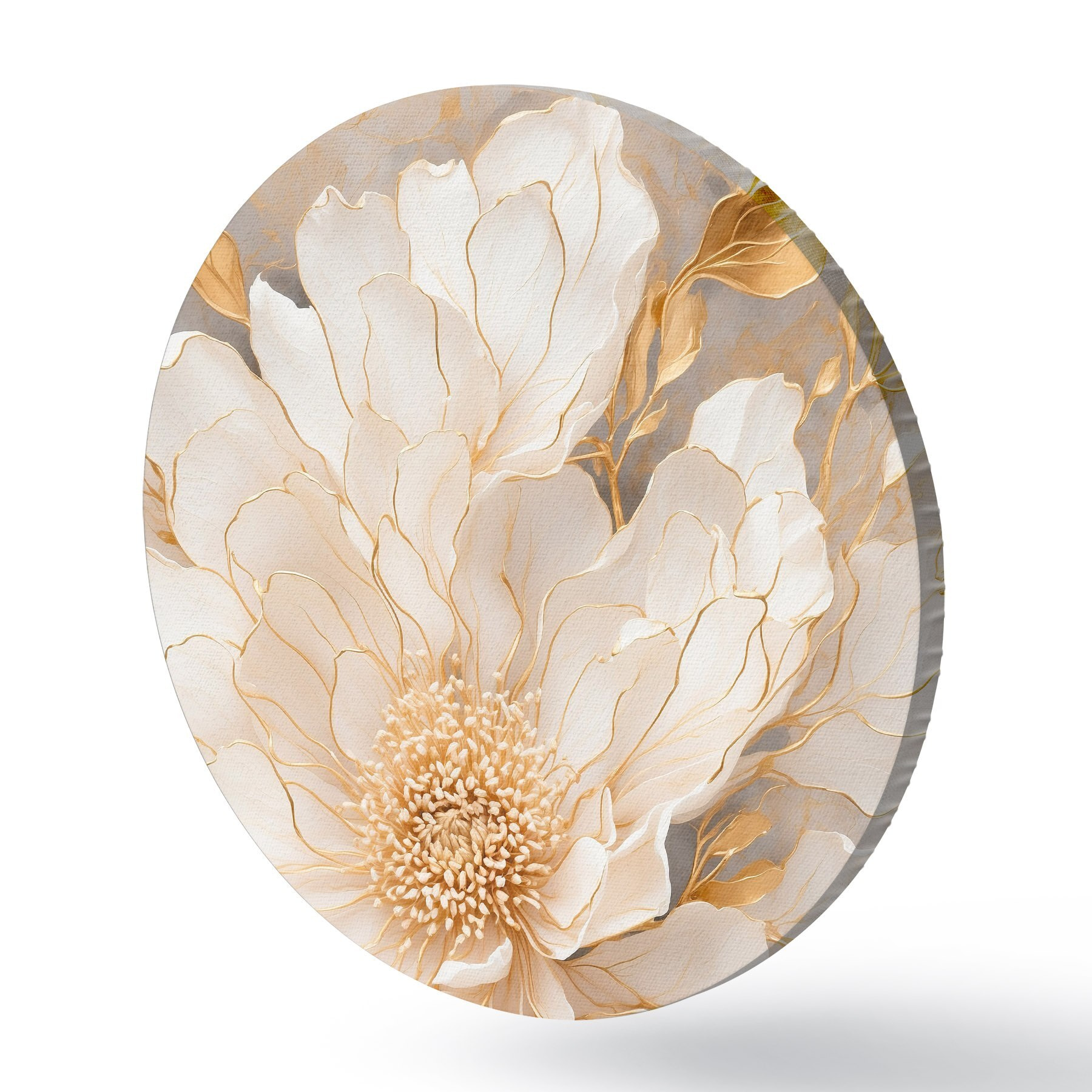 Apaļas gleznas Balts zieds ar lapām akrila glezniecības stilā r43115