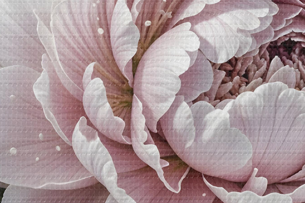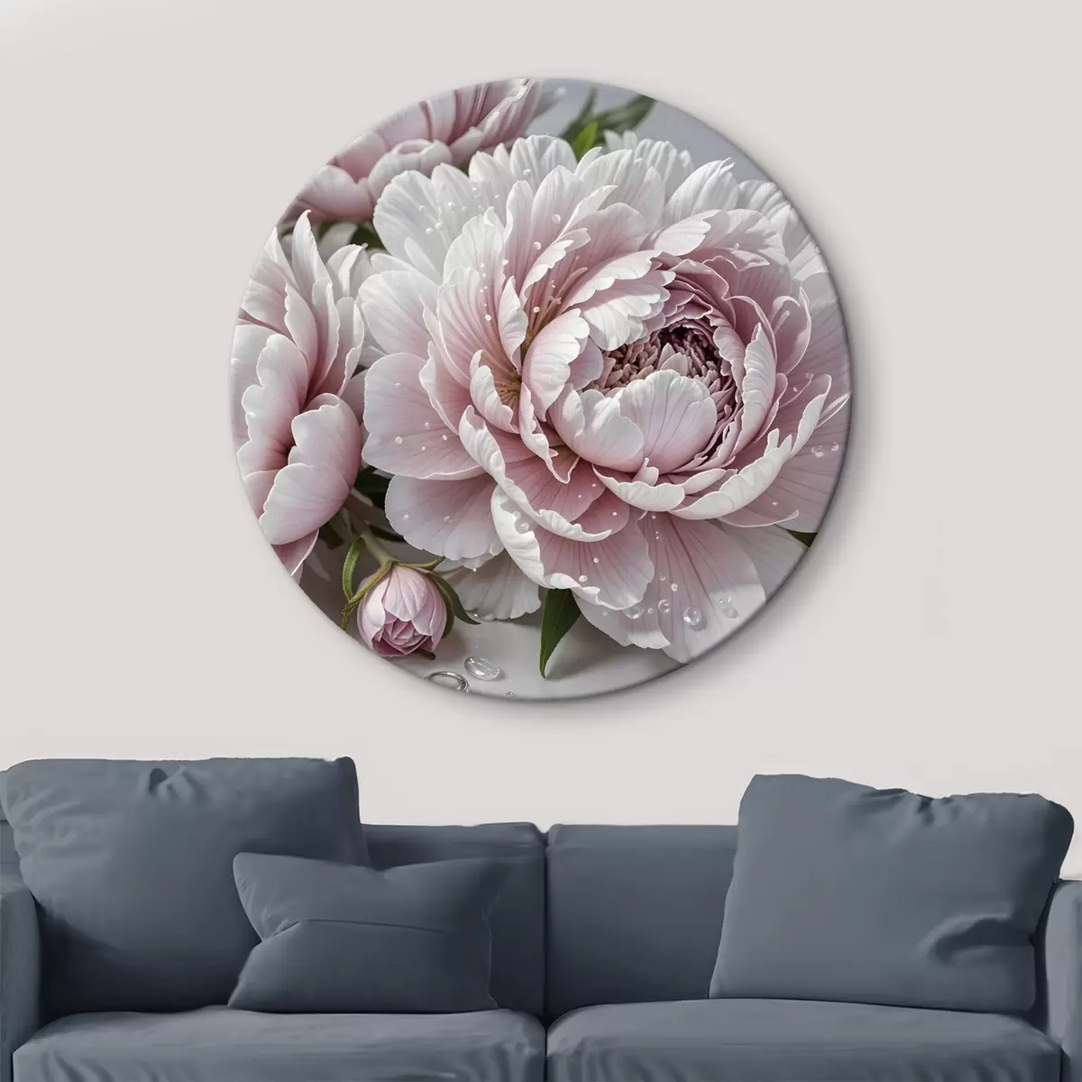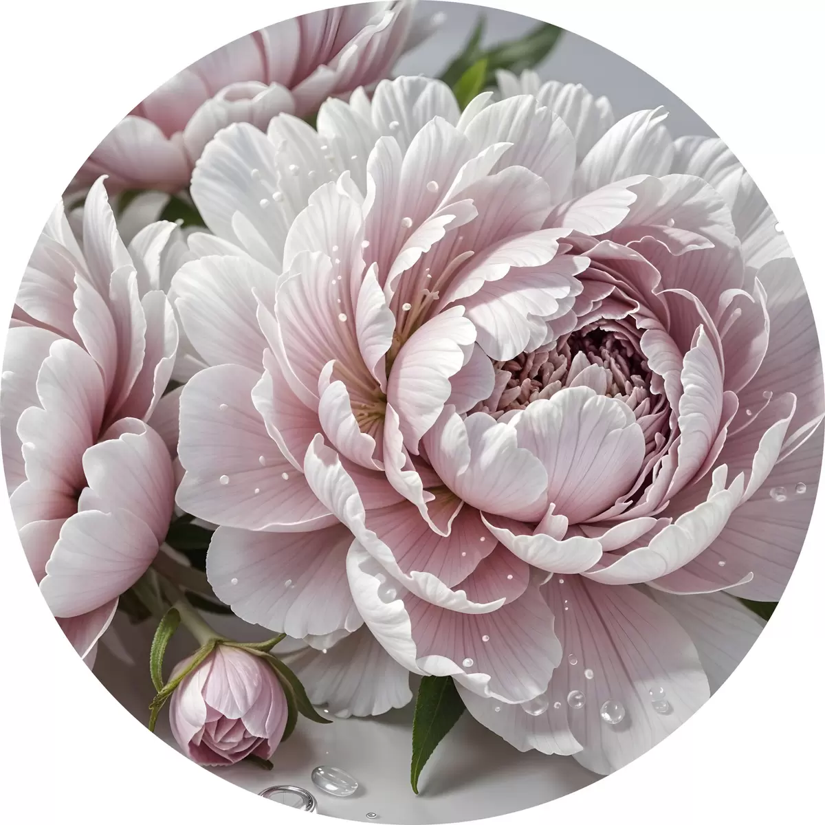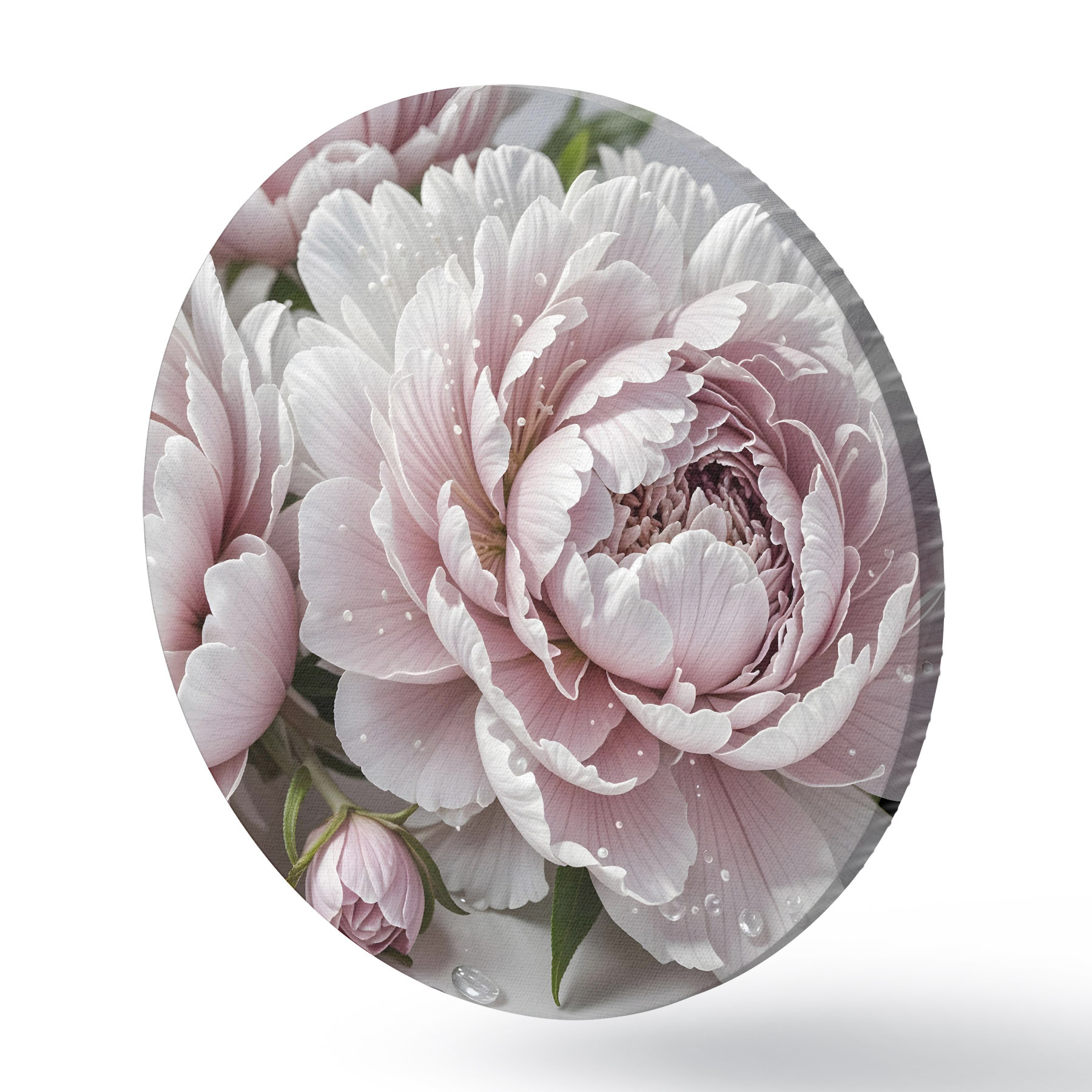 Apaļas gleznas Gaiši rozā un baltas peonijas ar ūdens pilieniem uz ziedlapiņām, fons ir balta virsma r43158