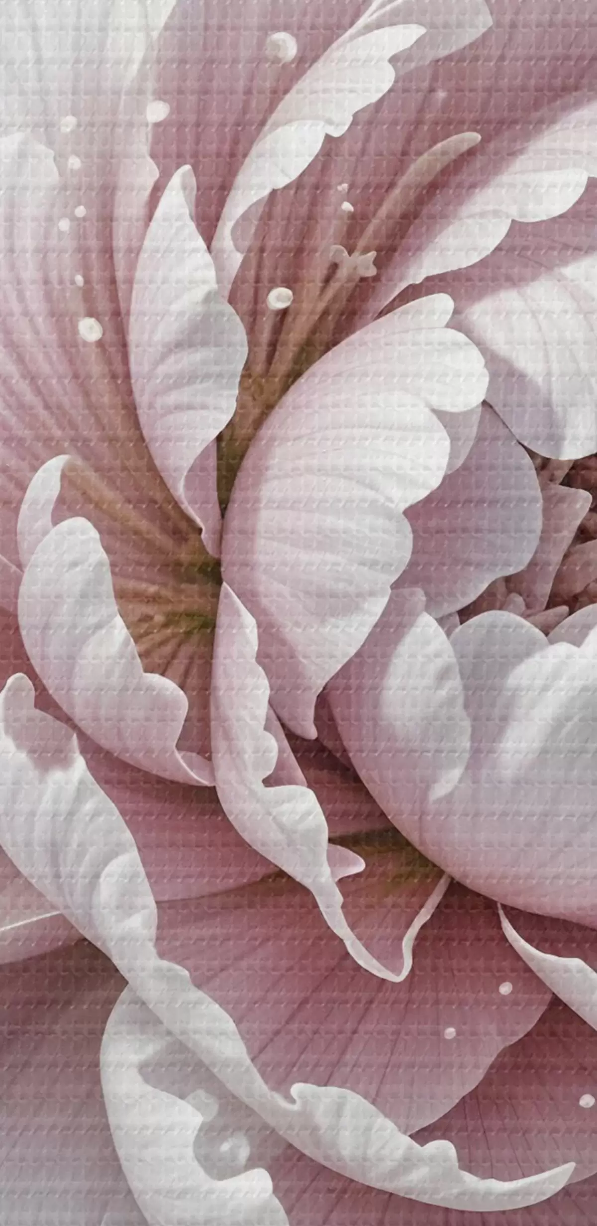 Attēls Gaiši rozā un baltas peonijas ar ūdens pilieniem uz ziedlapiņām, fons ir balta virsma Nr r43158