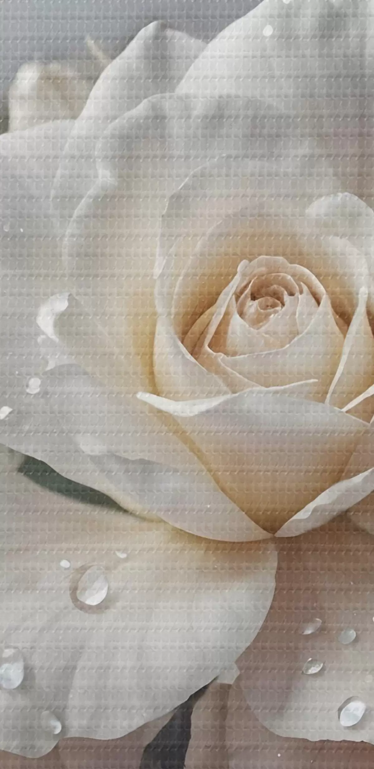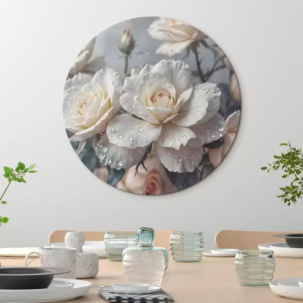 Apaļas gleznas Baltu rožu grupa ar ūdens pilieniem uz ziedlapiņām, dažas zaļas lapas, pieklusināts fons, maiga gaisma r43163
