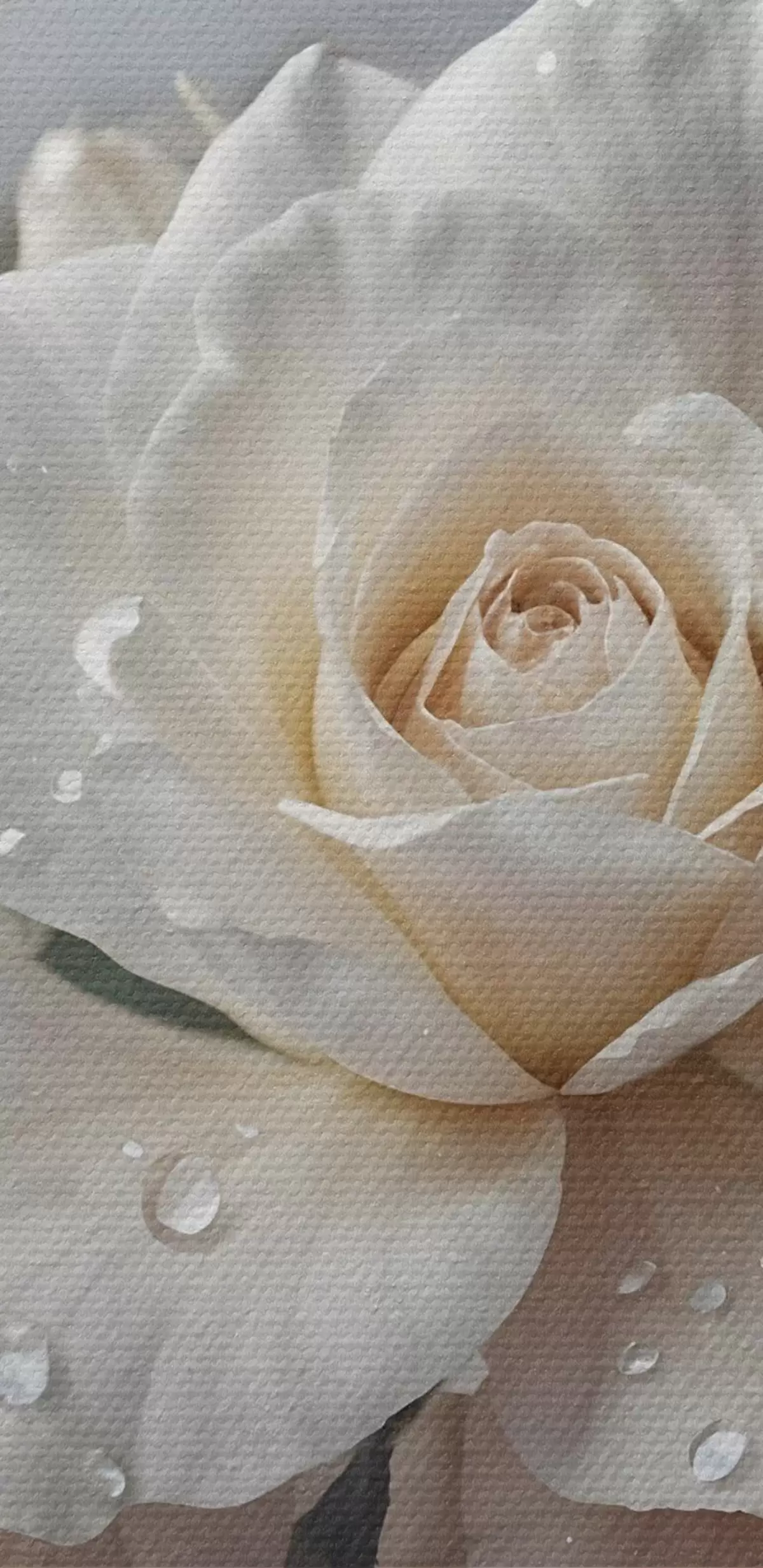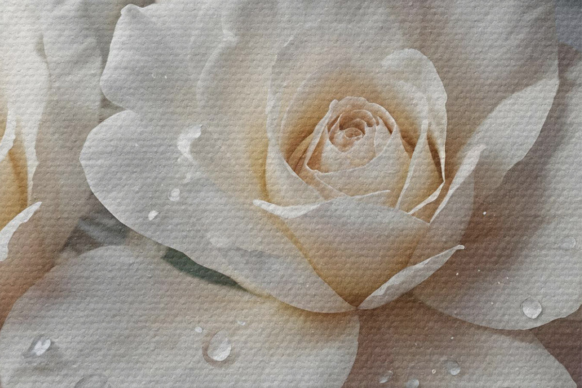 Attēls Baltu rožu grupa ar ūdens pilieniem uz ziedlapiņām, dažas zaļas lapas, pieklusināts fons, maiga gaisma Nr r43163