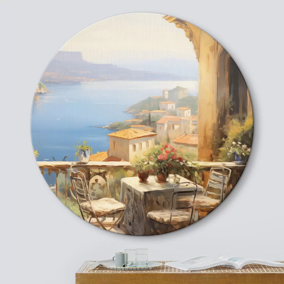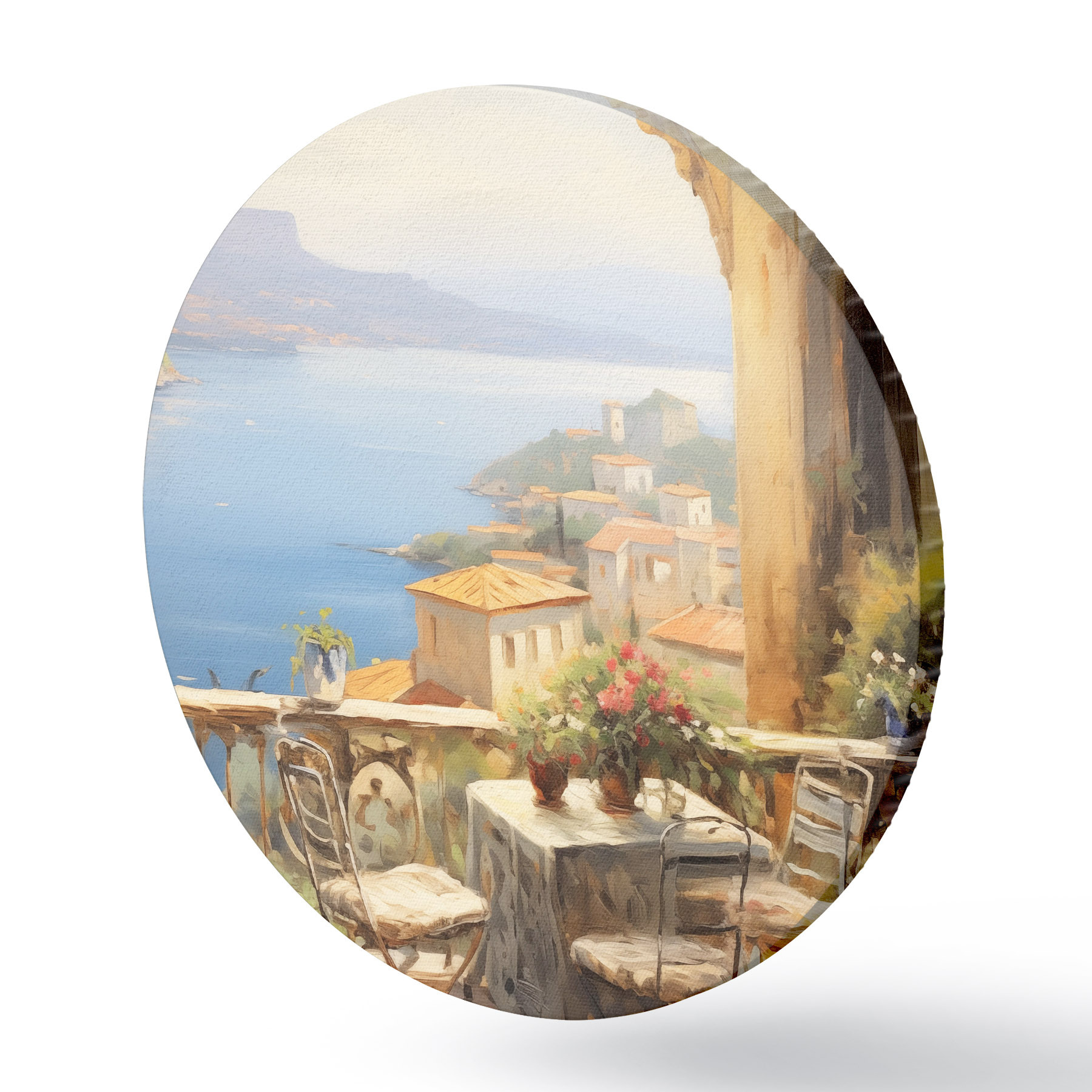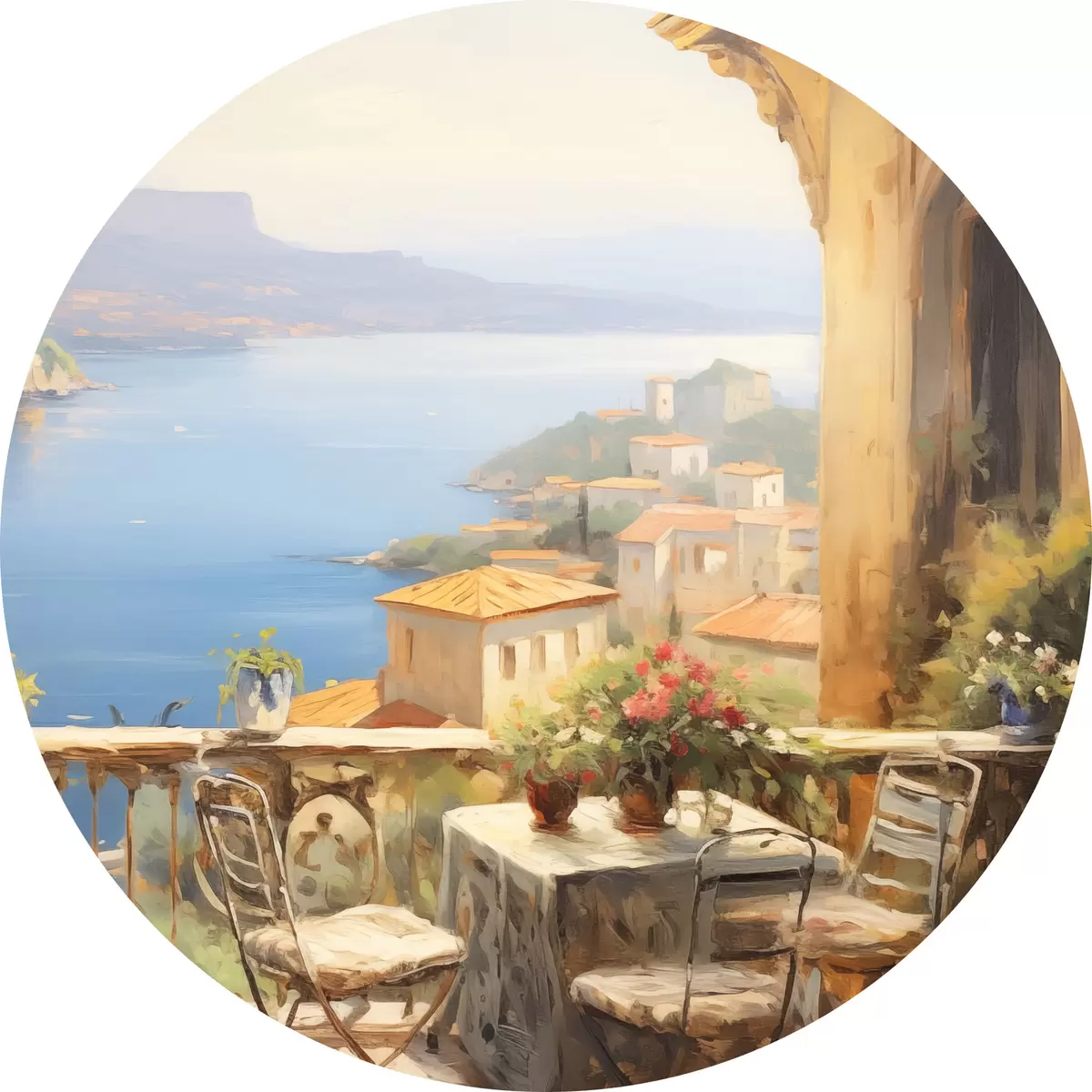 Apaļas gleznas Eļļas glezna imitācija balkona ar ziediem, ar skatu uz jūru, mājas krastā, saulaina diena, zilas debesis r43173