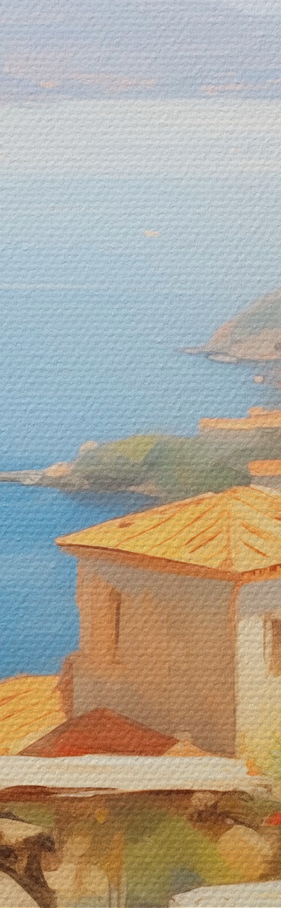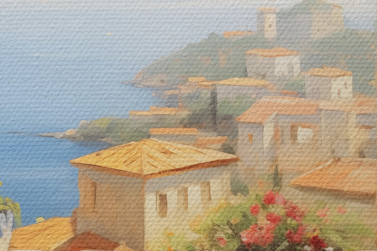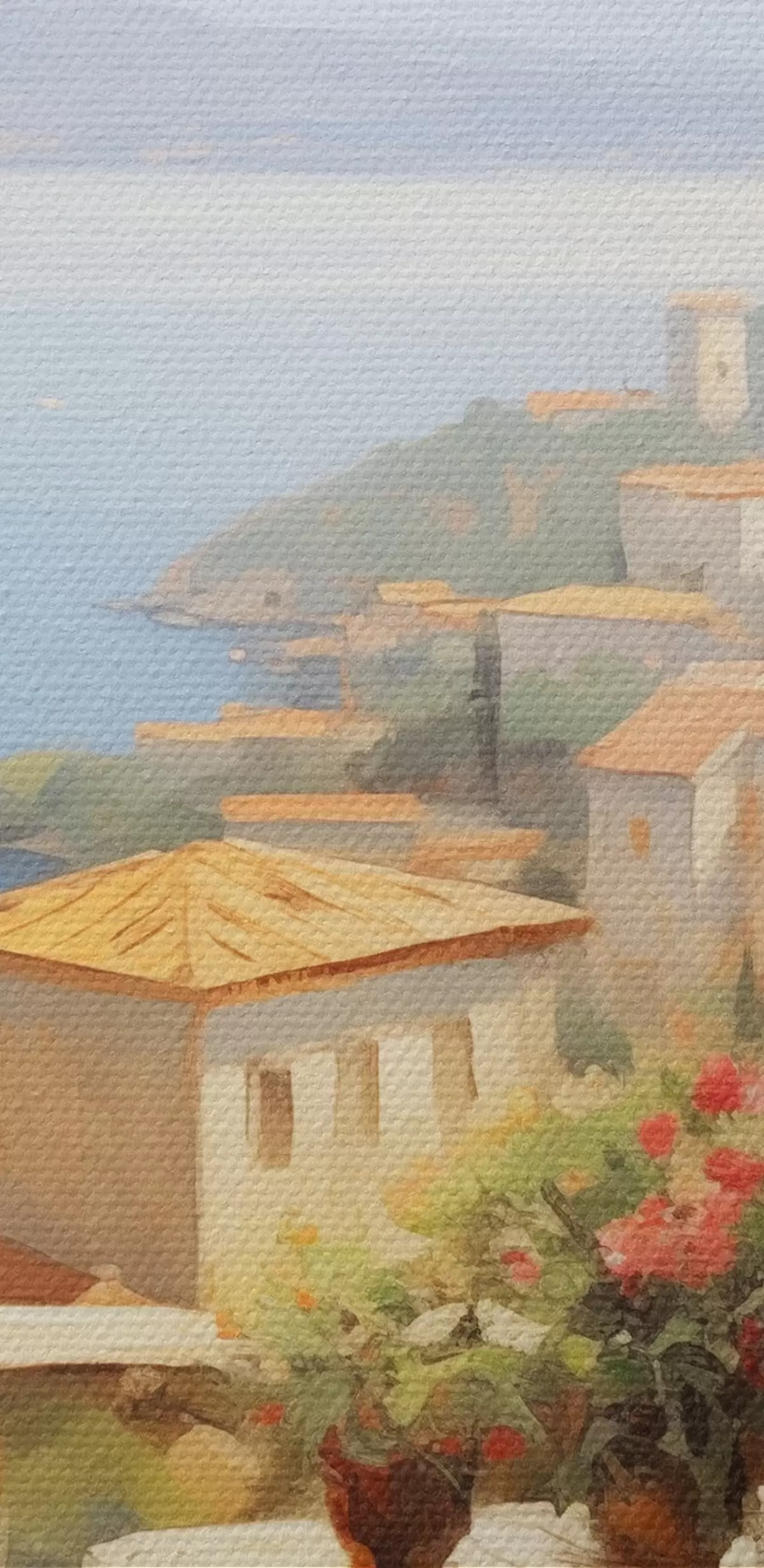 Attēls Eļļas glezna imitācija balkona ar ziediem, ar skatu uz jūru, mājas krastā, saulaina diena, zilas debesis Nr r43173