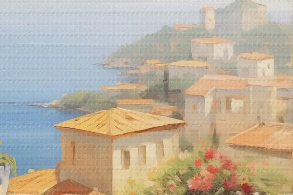 Attēls Eļļas glezna imitācija balkona ar ziediem, ar skatu uz jūru, mājas krastā, saulaina diena, zilas debesis Nr r43173