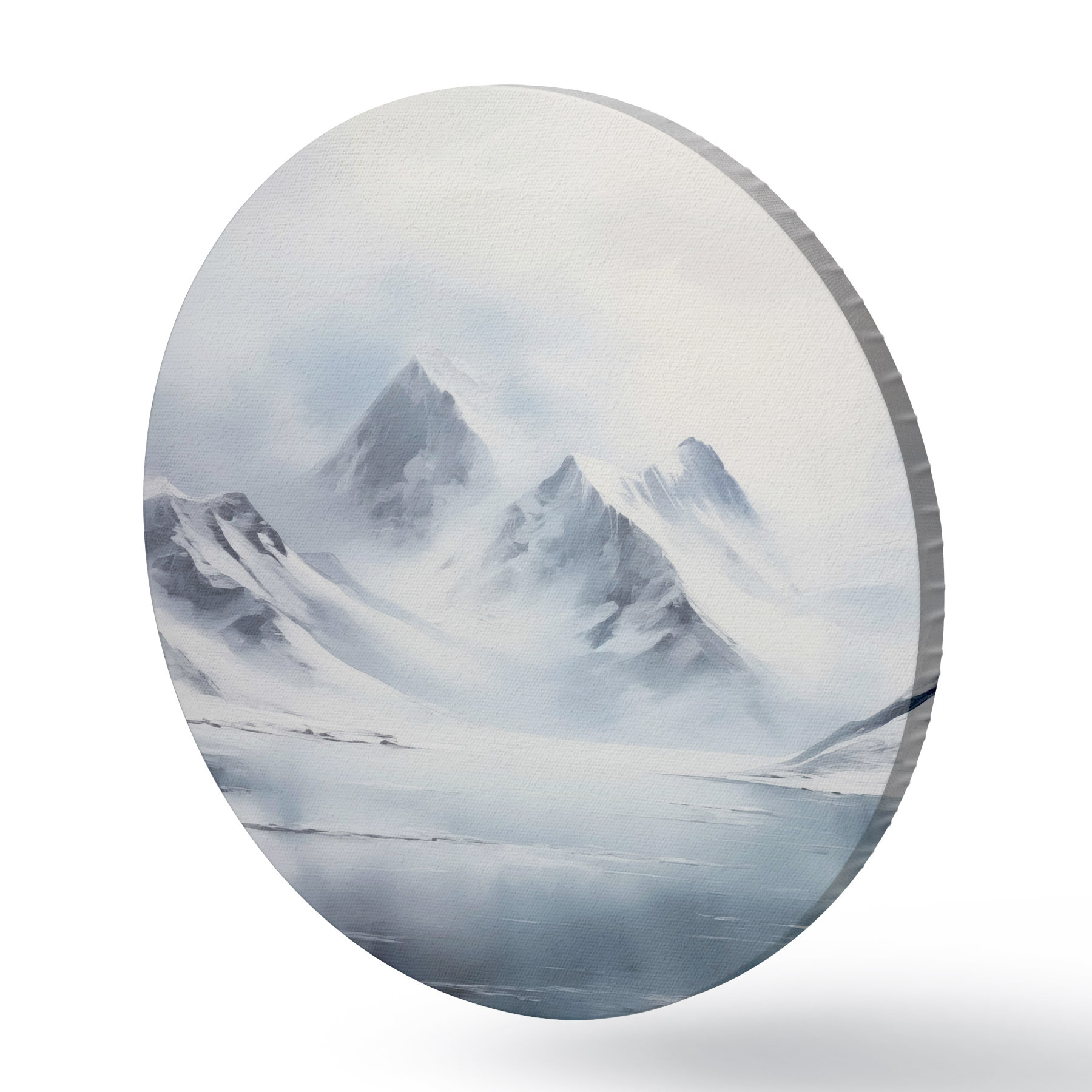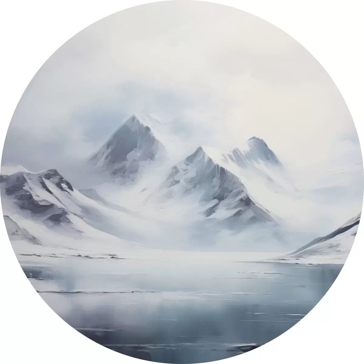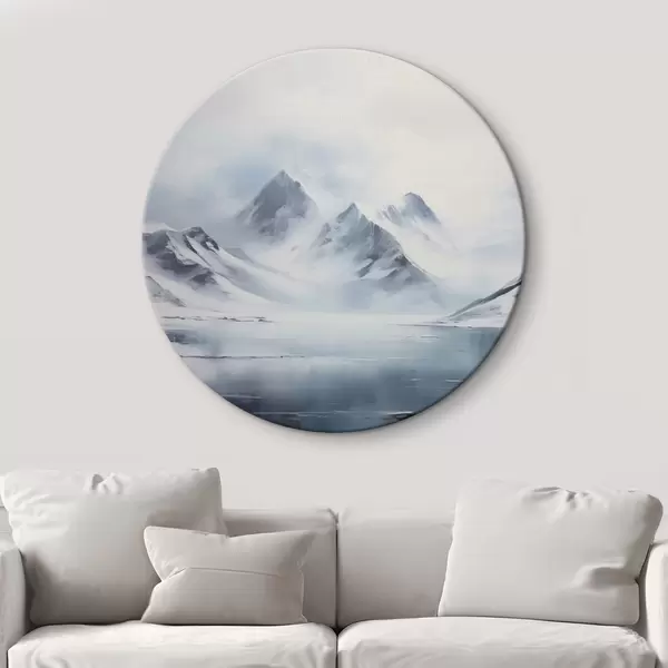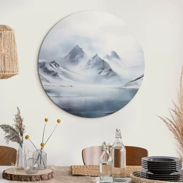 Apaļas gleznas Sniegota kalnu ainava ar ezeru priekšplānā, virsotnes klāj sniegs un debesis ir apmākušās r43174