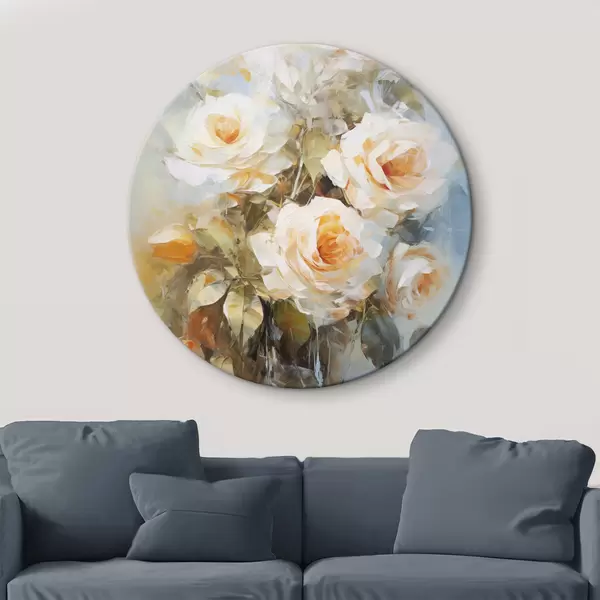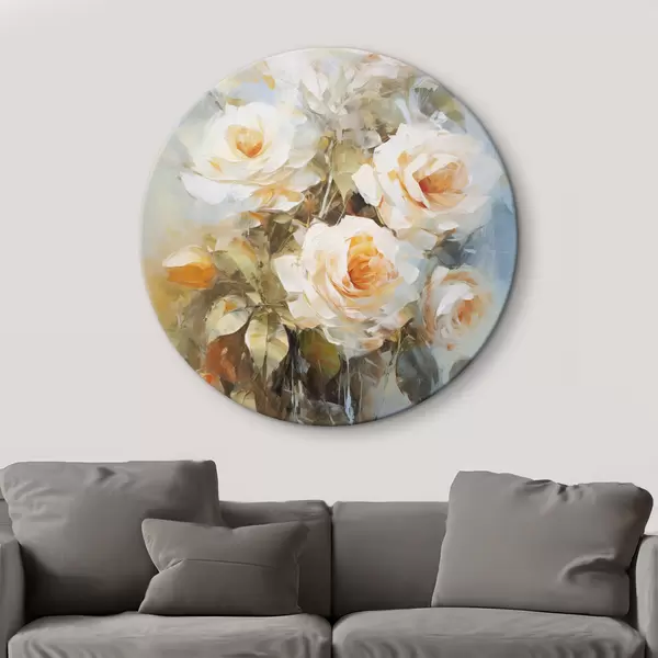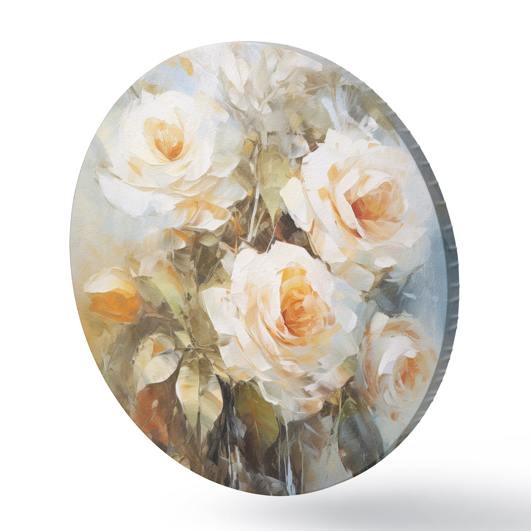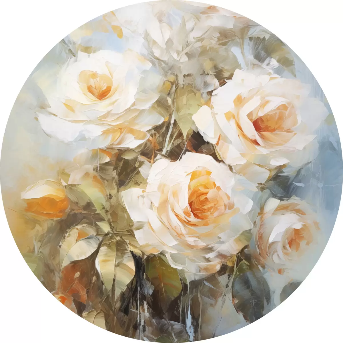 Apaļas gleznas Baltas rozes ar oranžu krāsu uz maiga, gaiši zila fona, ar redzamiem otas triepieniem un glezniecisku stilu r43175