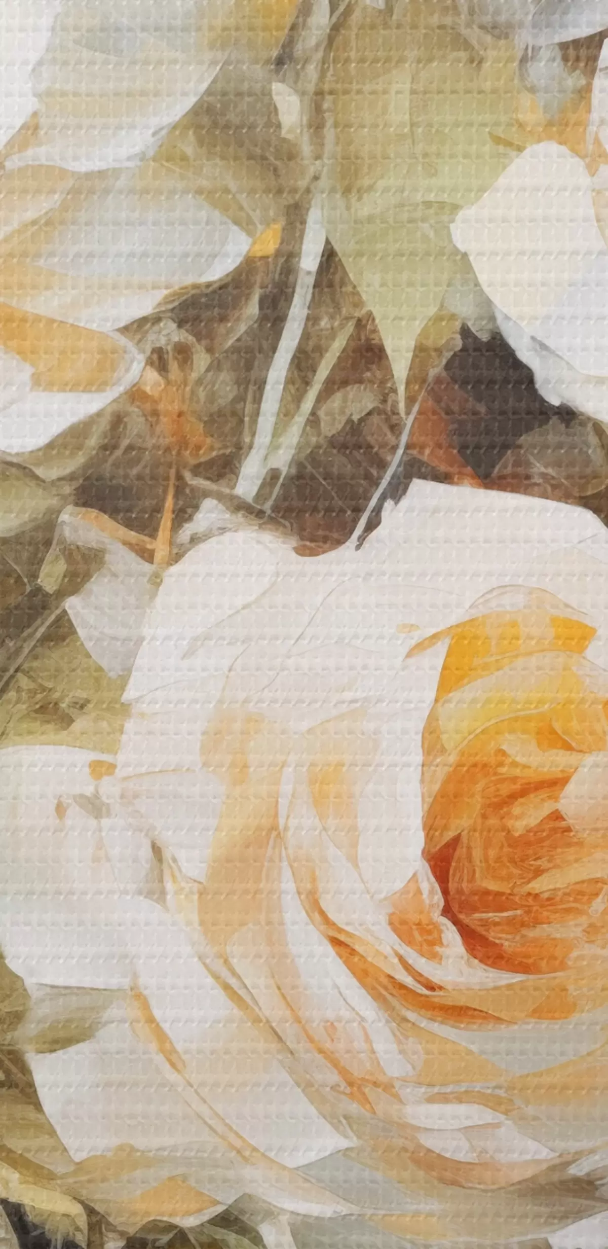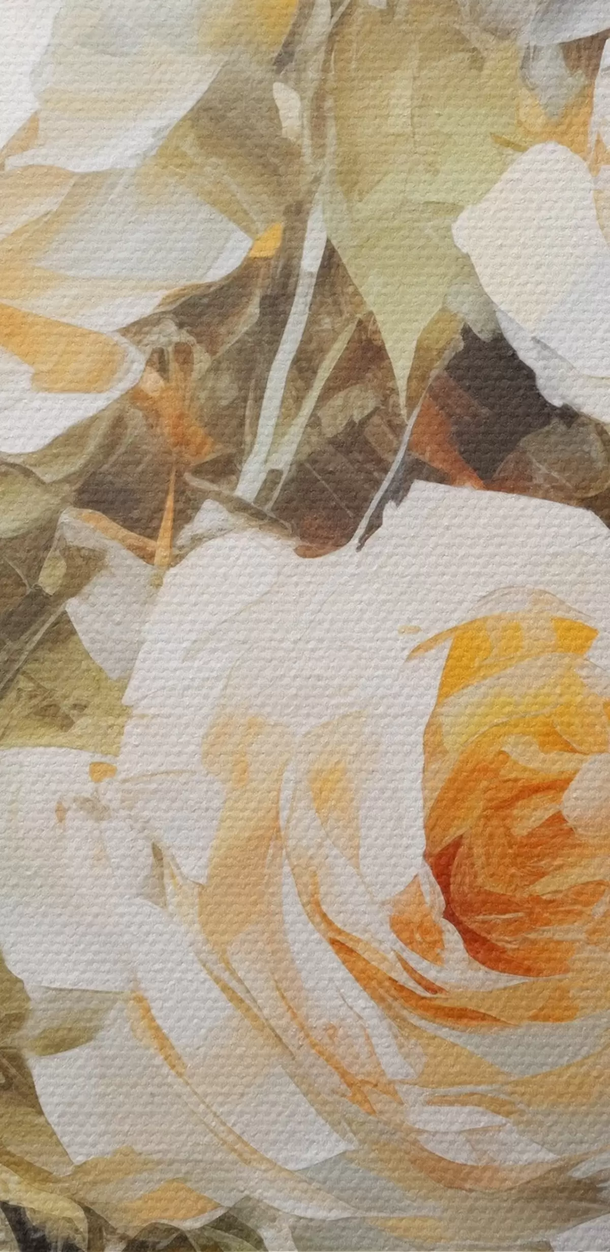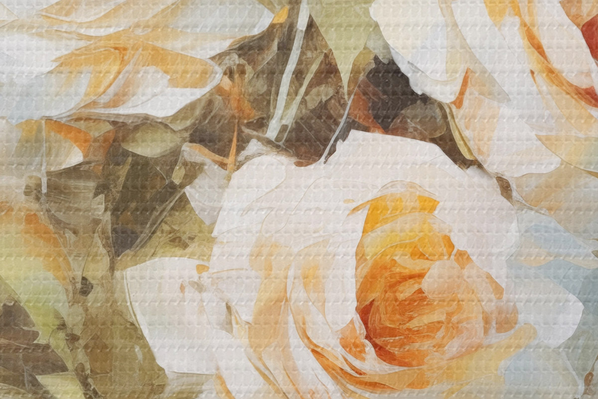 Attēls Baltas rozes ar oranžu krāsu uz maiga, gaiši zila fona, ar redzamiem otas triepieniem un glezniecisku stilu Nr r43175
