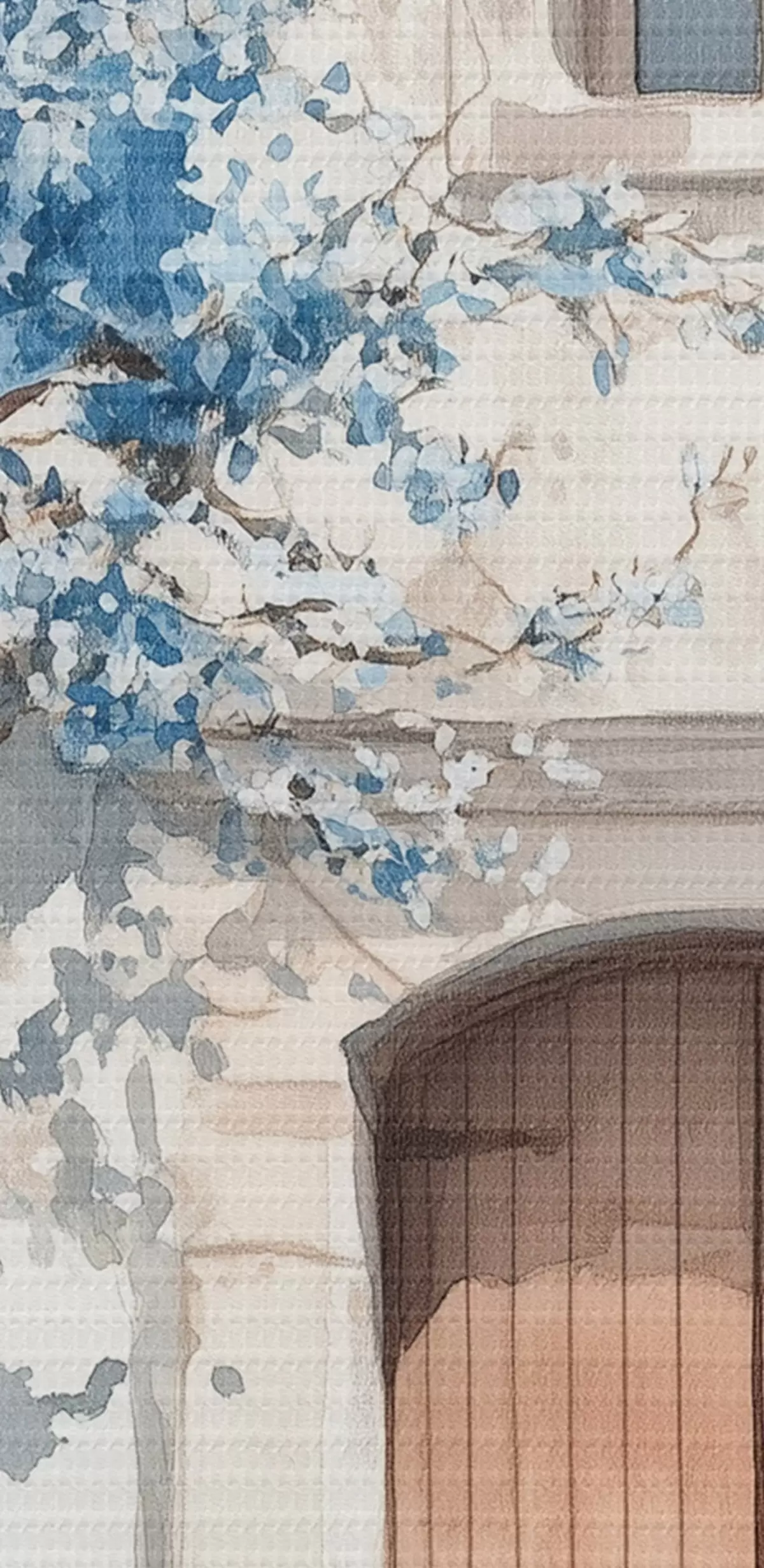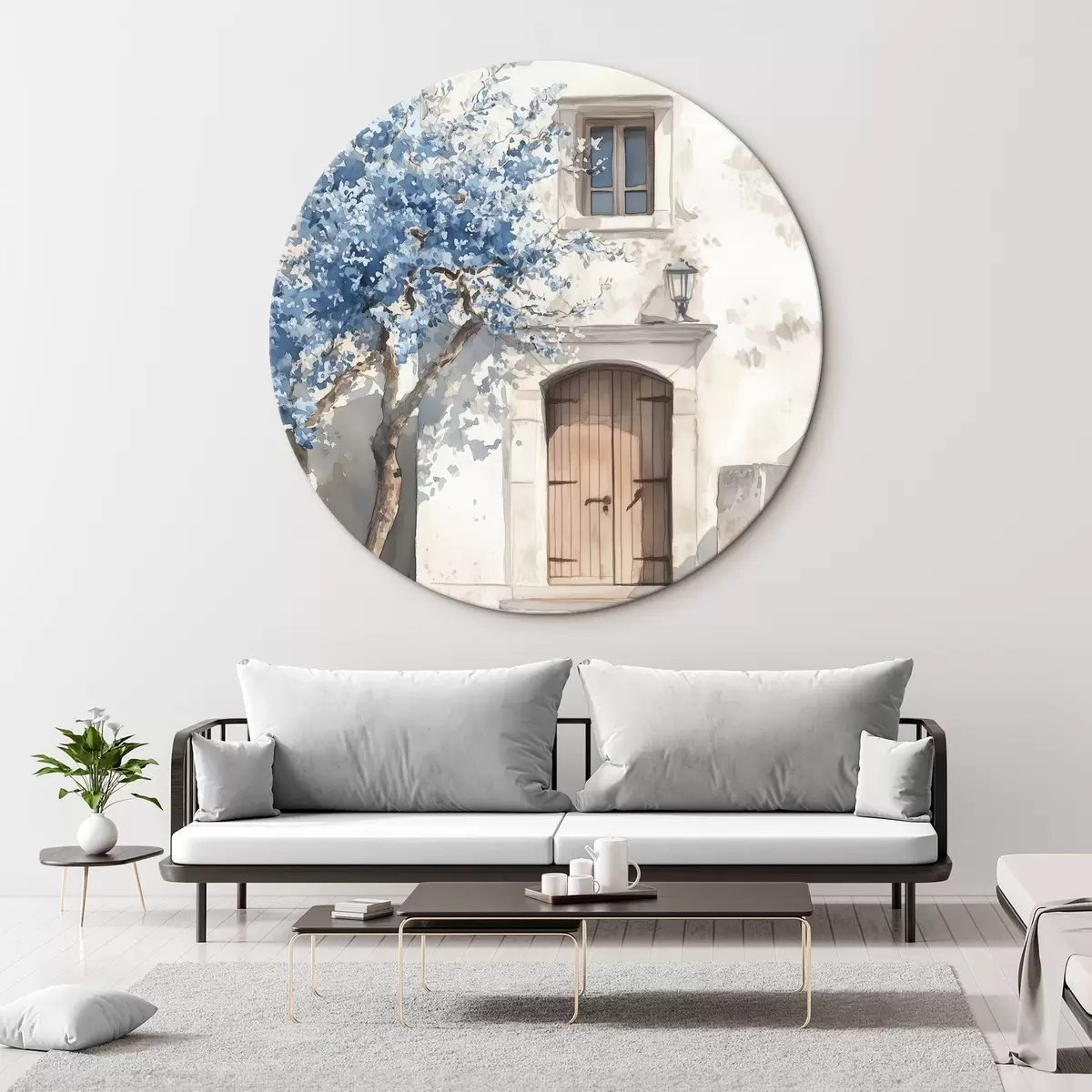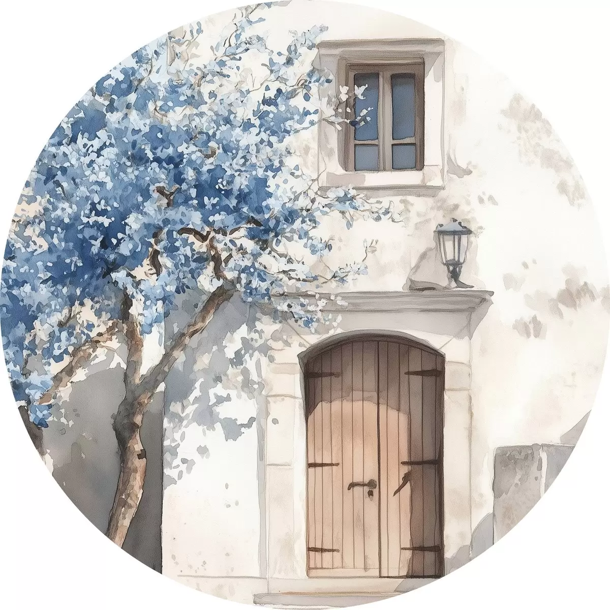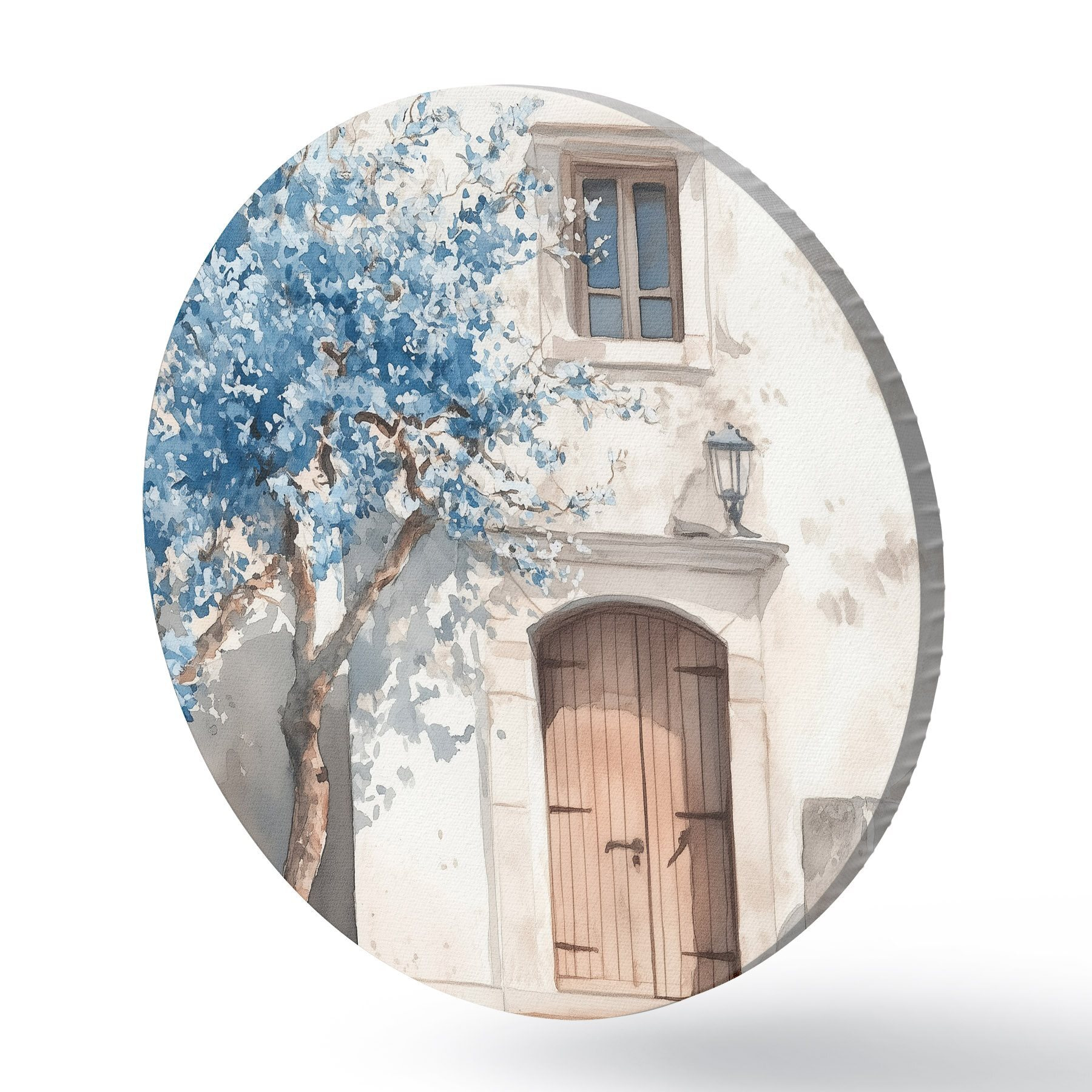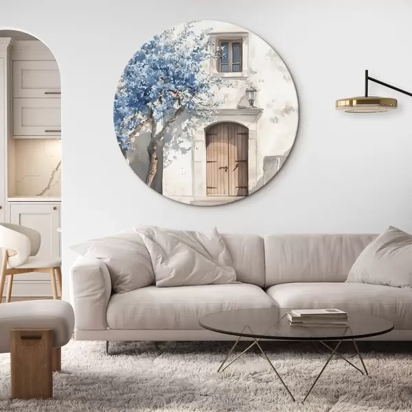 Apaļas gleznas Grieķu māja ar skaistu koku, arhitektūra, akvareļu stils r43178