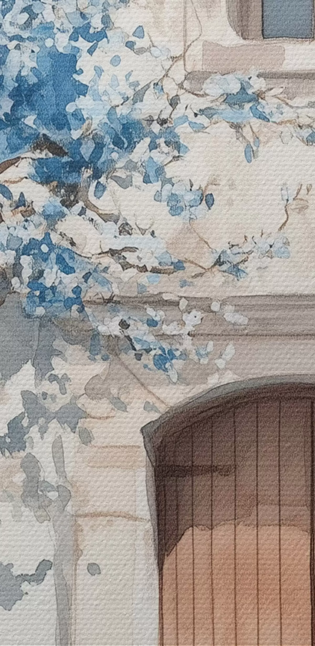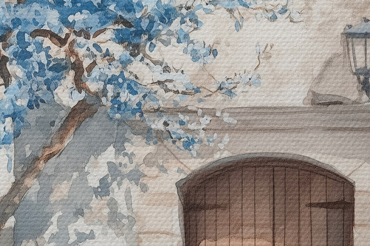 Attēls Grieķu māja ar skaistu koku, arhitektūra, akvareļu stils Nr r43178