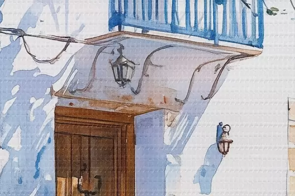 Attēls Akvareļu stils, grieķu māja, ziedošs koks, arhitektūra Nr r43182