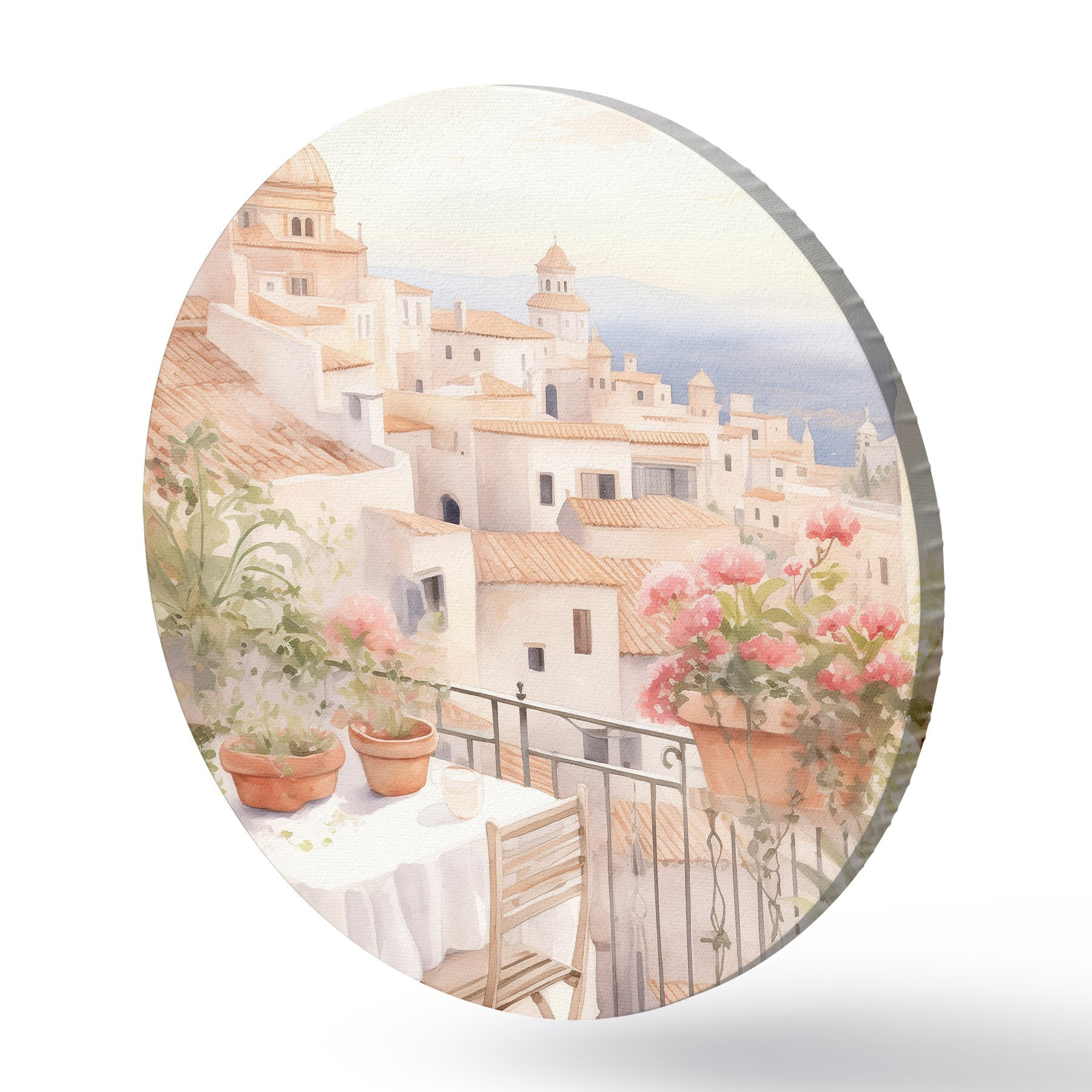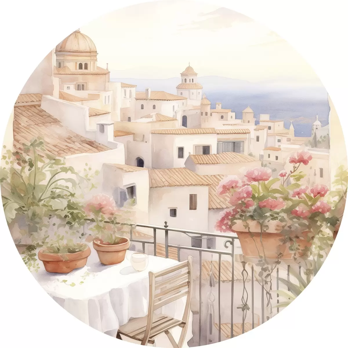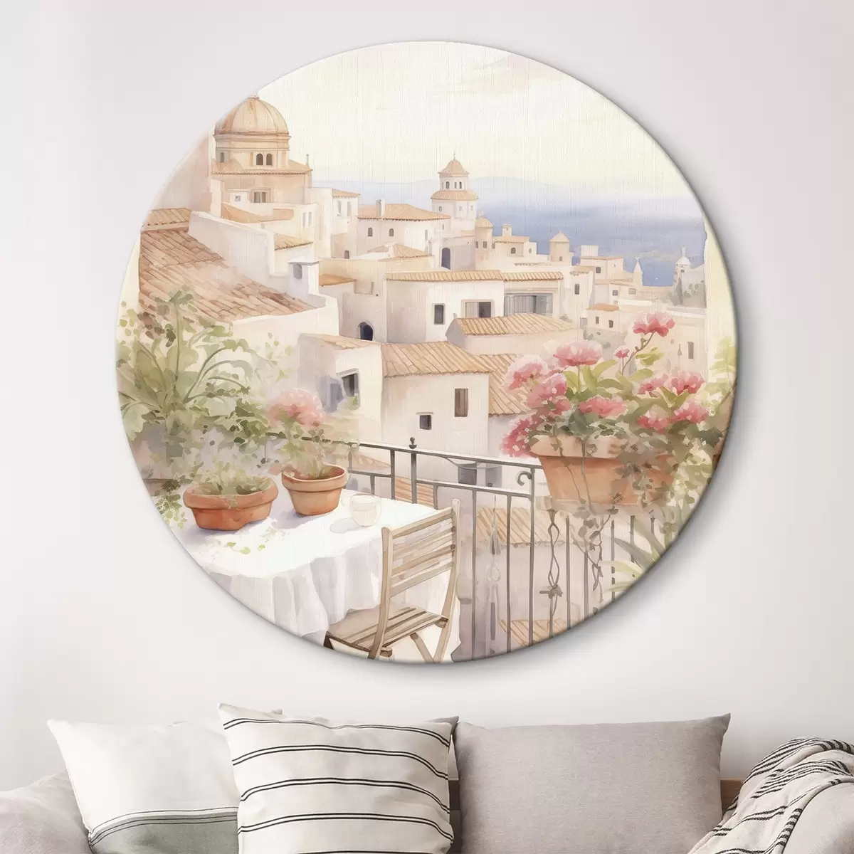 Apaļas gleznas Saulriets uz balkona, Itālija, arhitektūra, ziedošas puķes, akvareļu stilā r43184