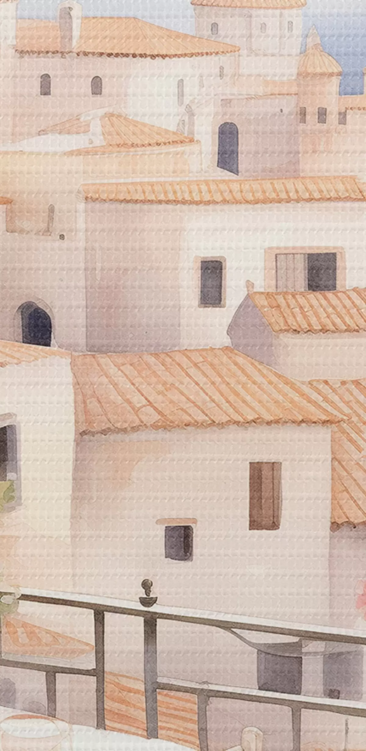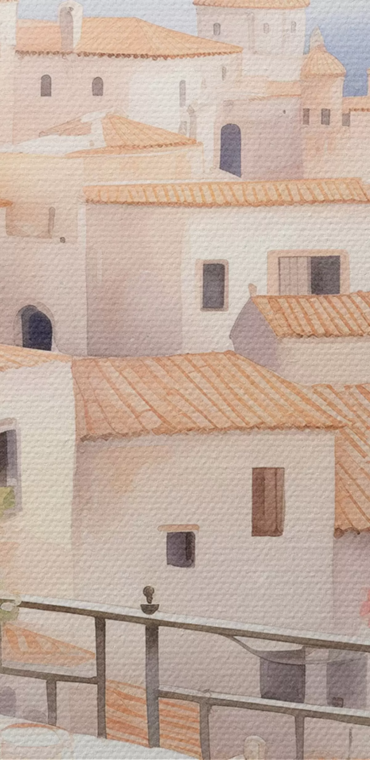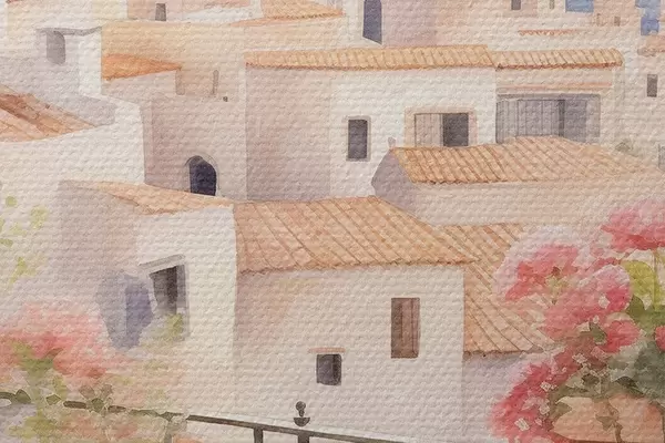 Attēls Saulriets uz balkona, Itālija, arhitektūra, ziedošas puķes, akvareļu stilā Nr r43184