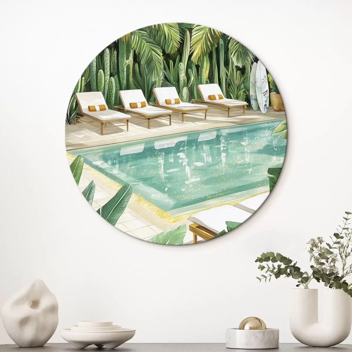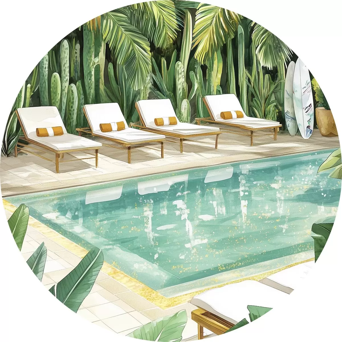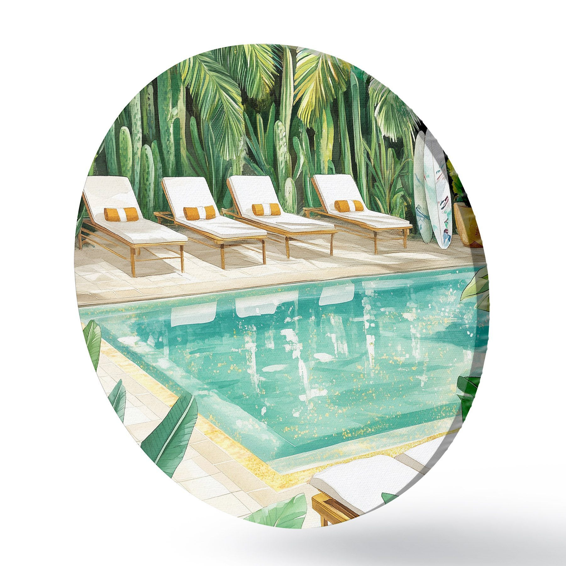 Apaļas gleznas Tropu daba, dārzs, vasaras baseins, sērfošana, akvareļu stils r43190