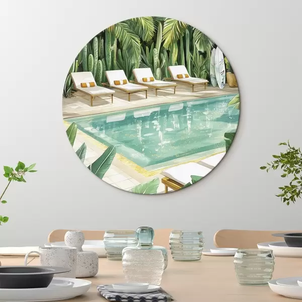 Apaļas gleznas Tropu daba, dārzs, vasaras baseins, sērfošana, akvareļu stils r43190