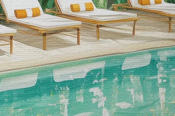 Attēls Tropu daba, dārzs, vasaras baseins, sērfošana, akvareļu stils Nr r43190