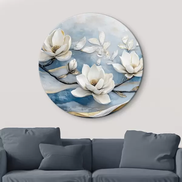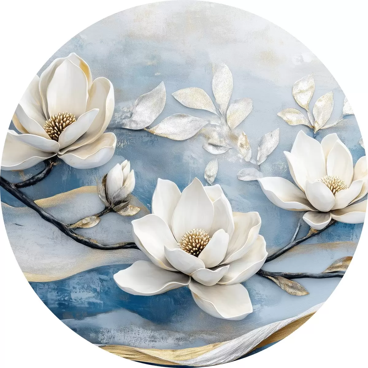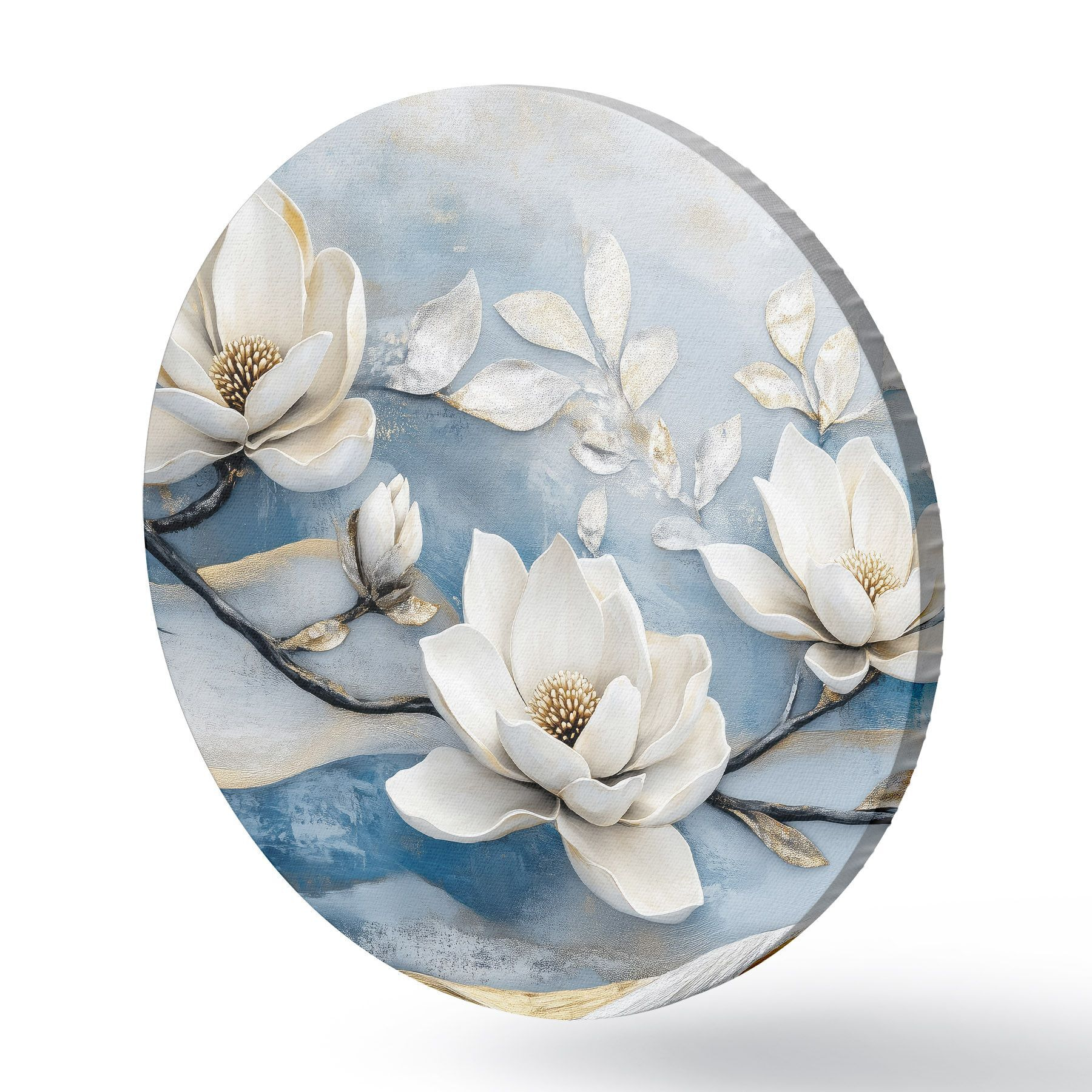 Apaļas gleznas Magnolijas zars uz abstrakta zili dzeltena fona r43323