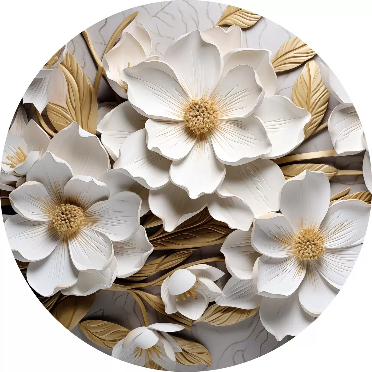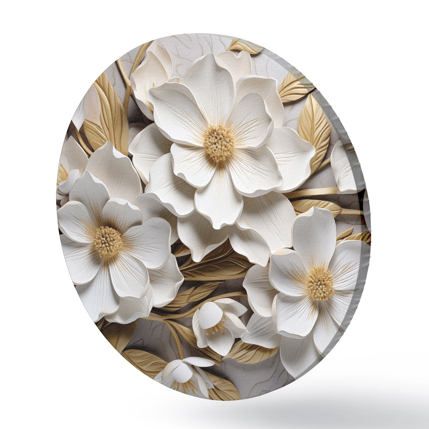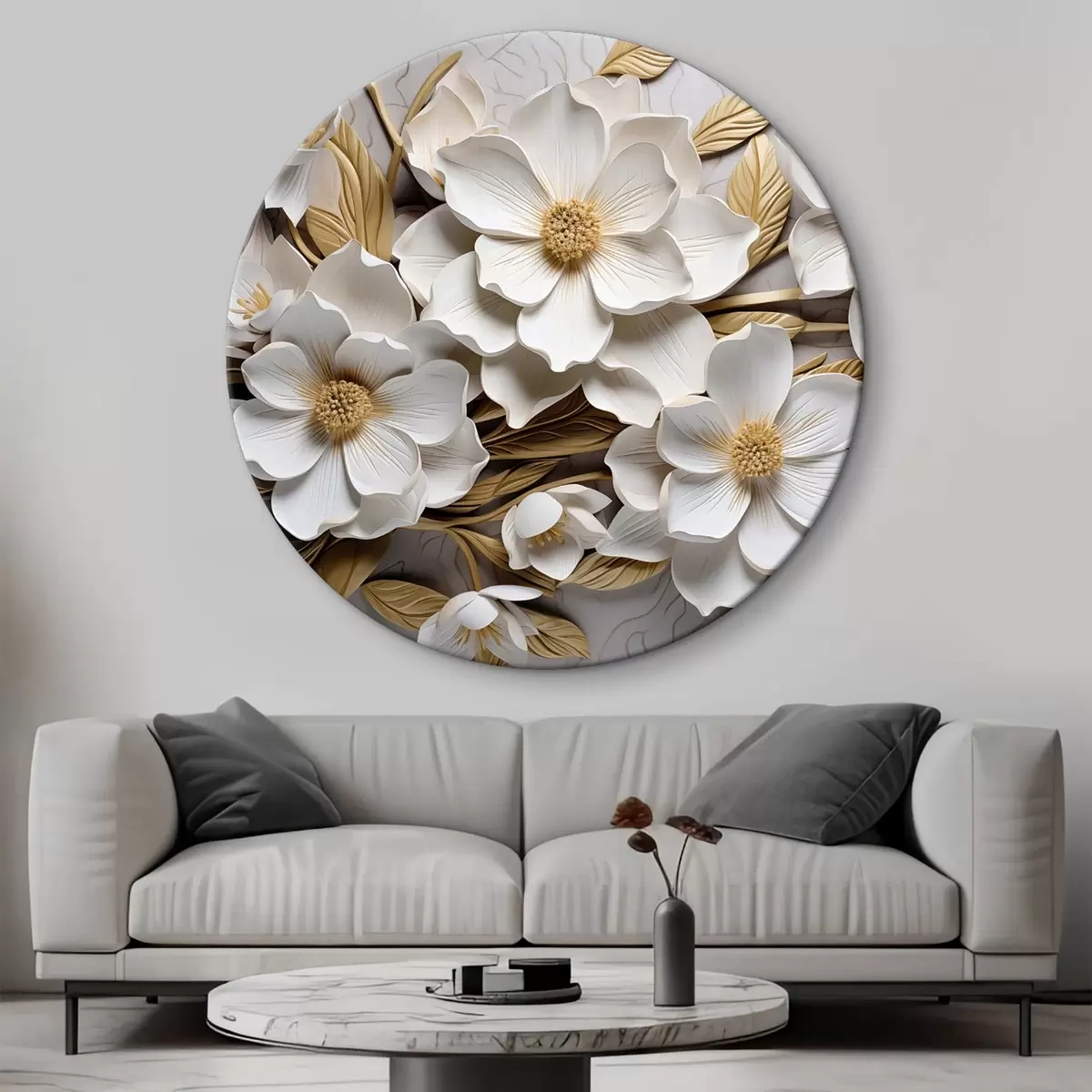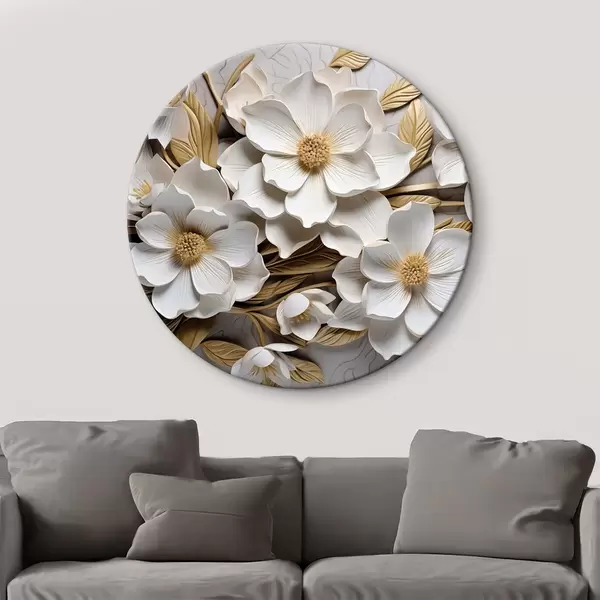 Apaļas gleznas Balti ziedi reljefa freskas stilā ar dzelteniem akcentiem r43330