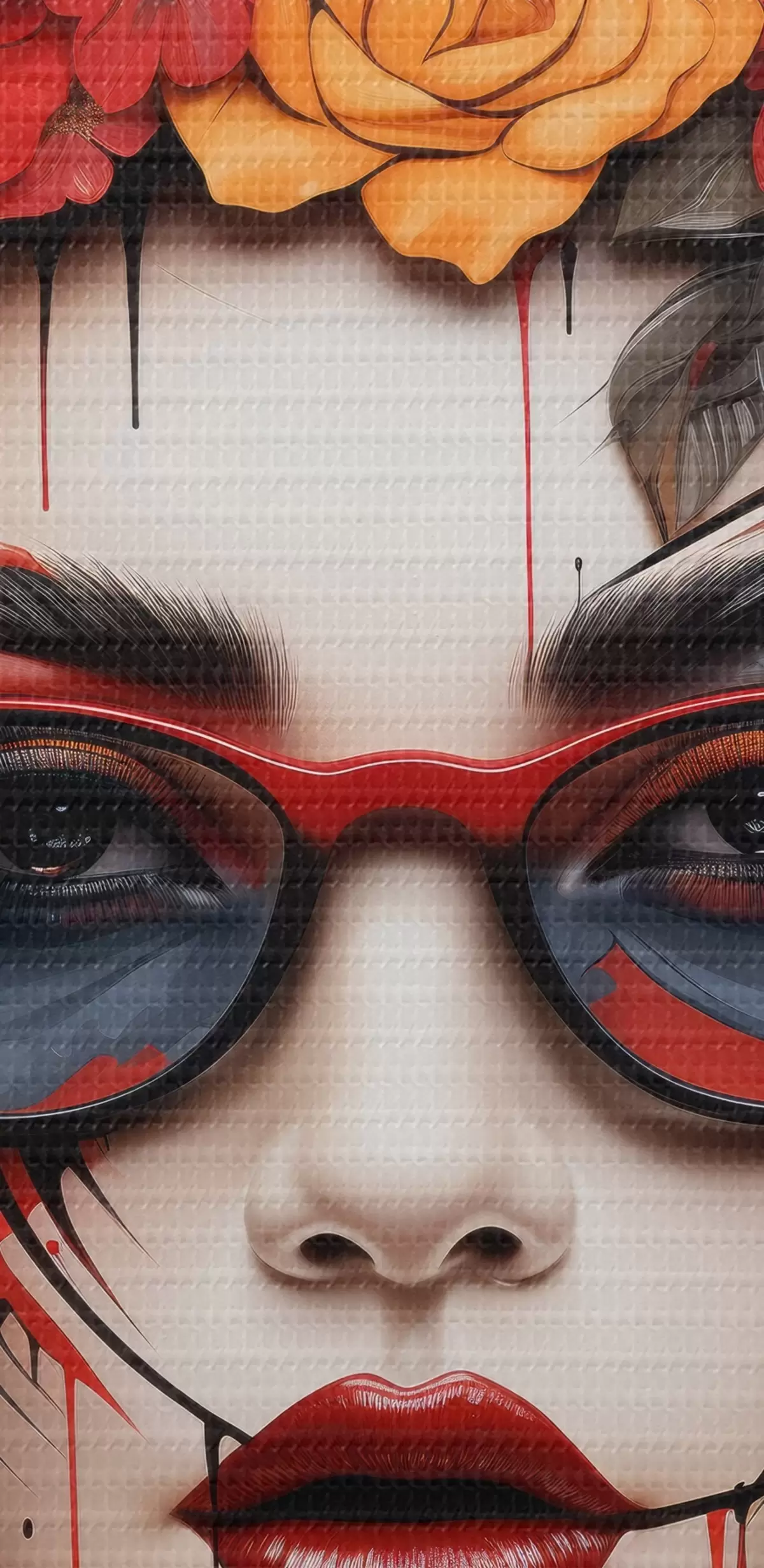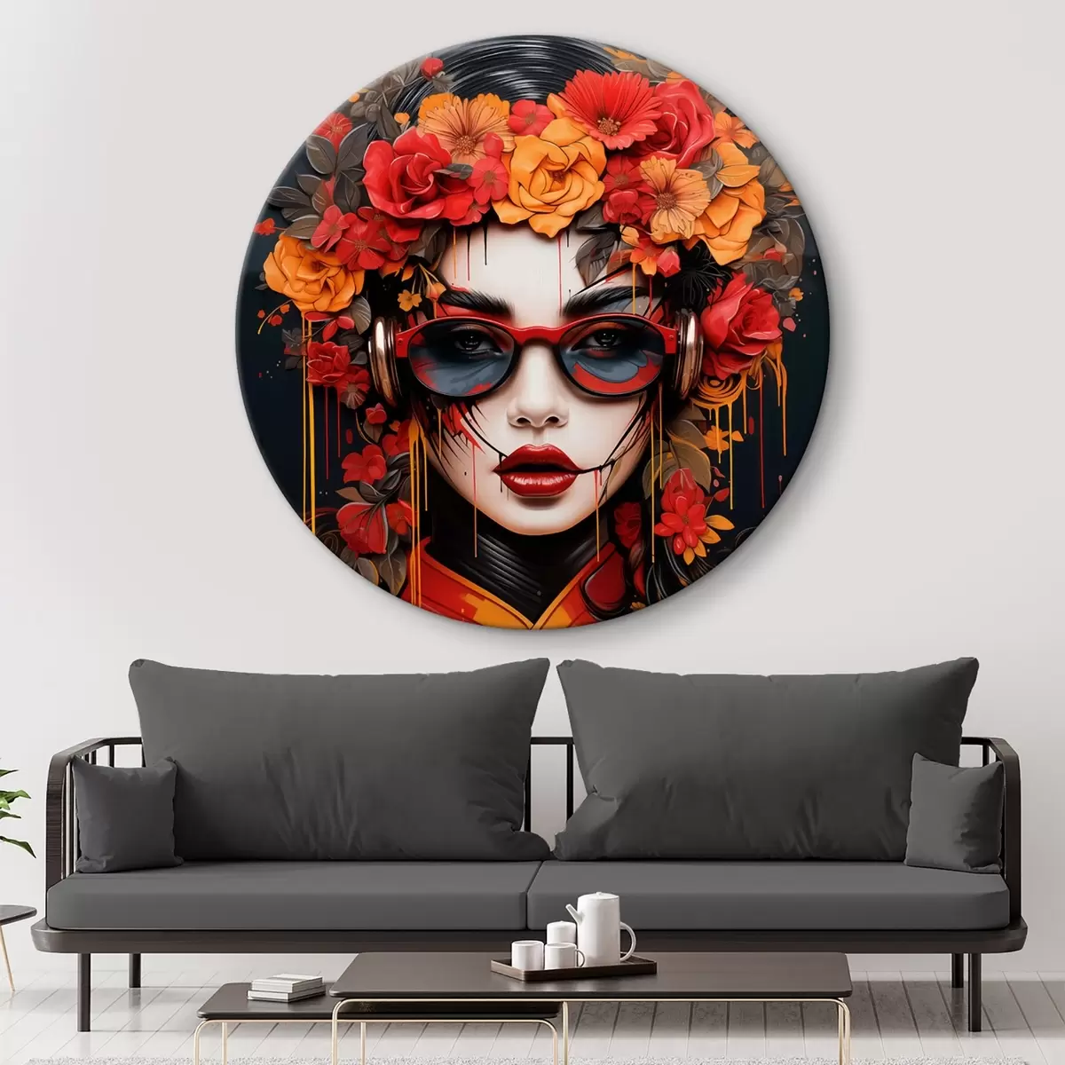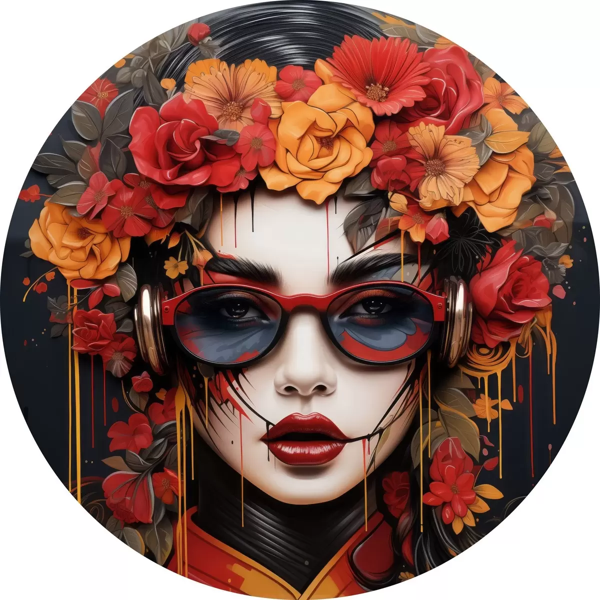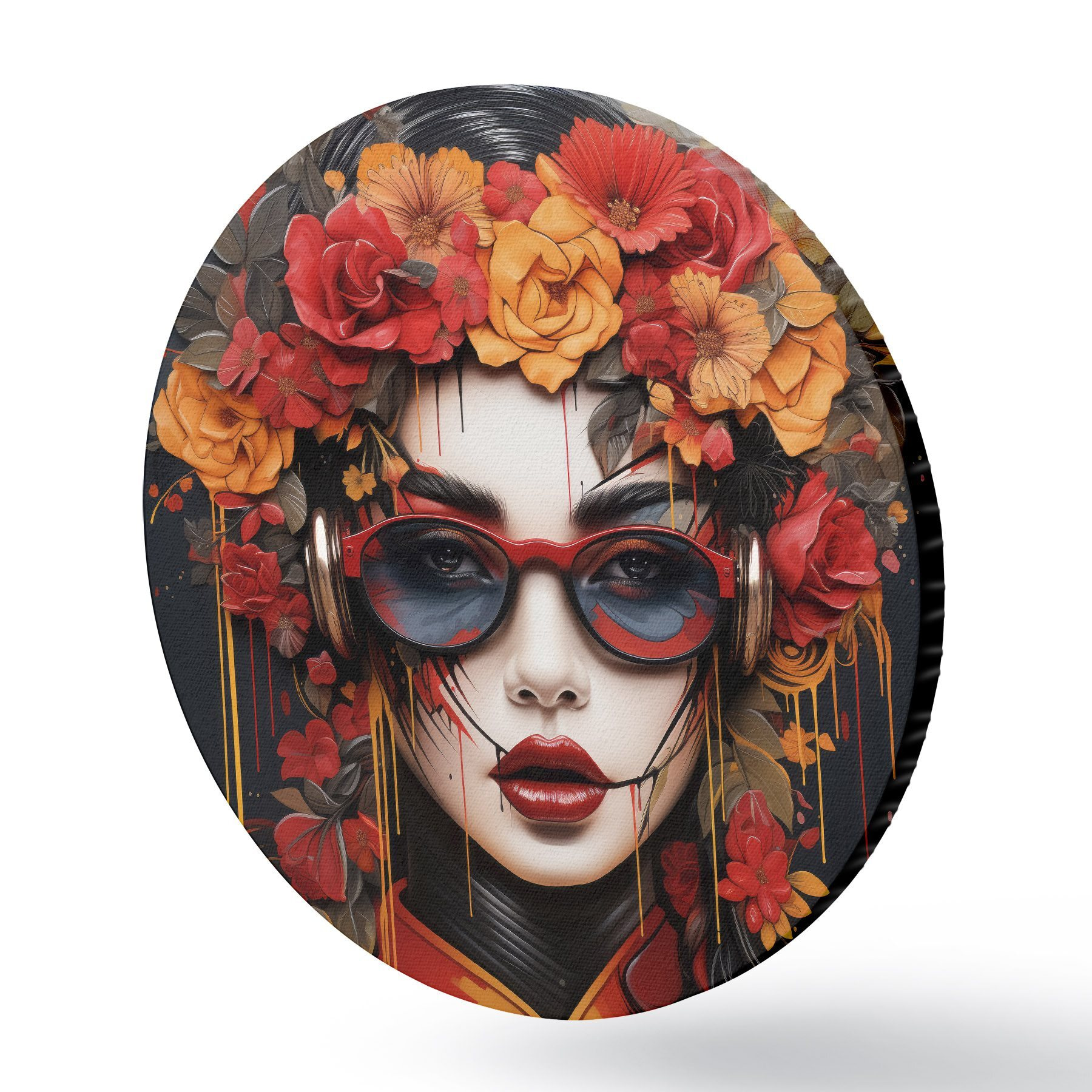 Apaļas gleznas Sieviete ar ziediem uz galvas, ielu mākslas stilā r43362