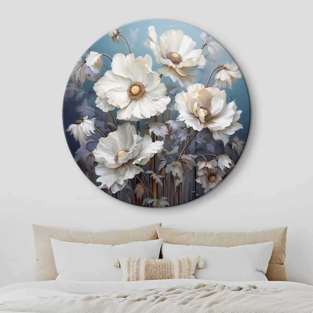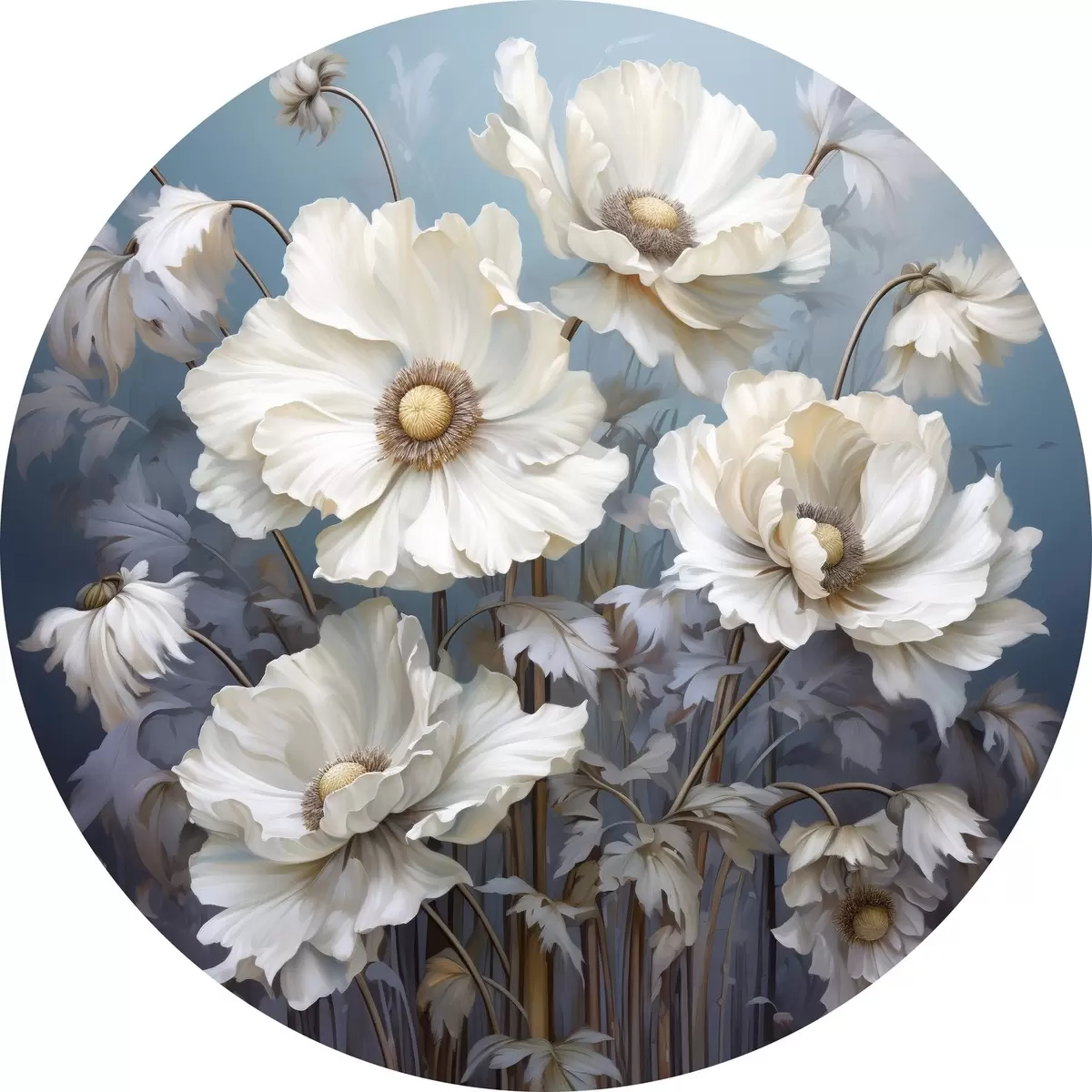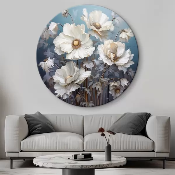 Apaļas gleznas Balts peoniju pušķis uz zila fona gleznošanas stilā r43370