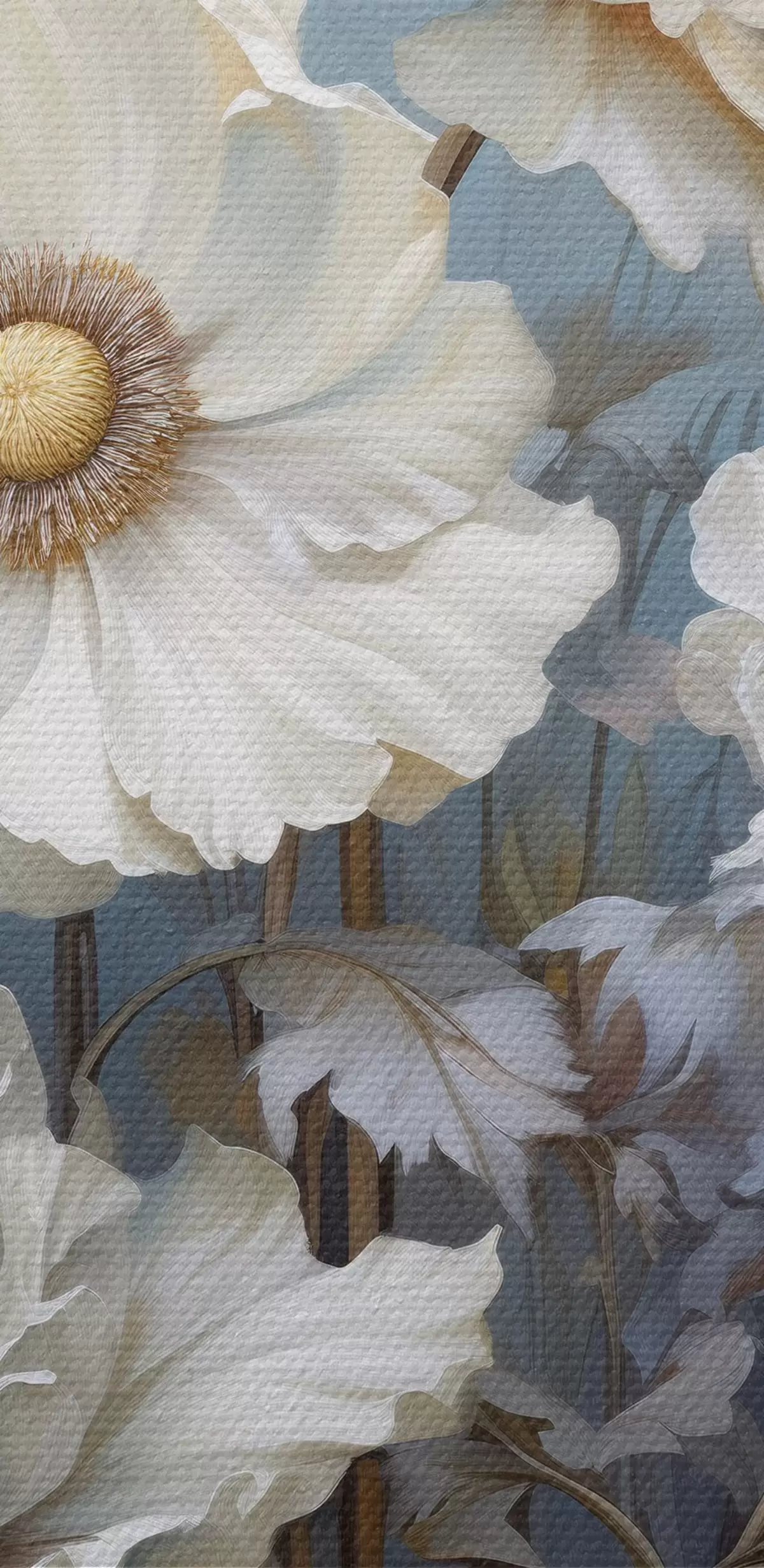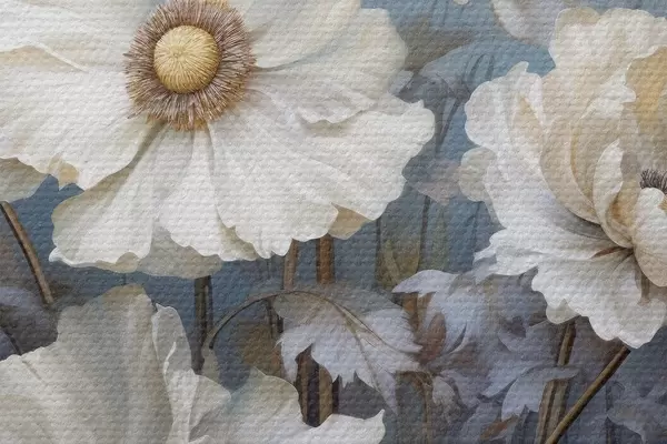 Attēls Balts peoniju pušķis uz zila fona gleznošanas stilā Nr r43370
