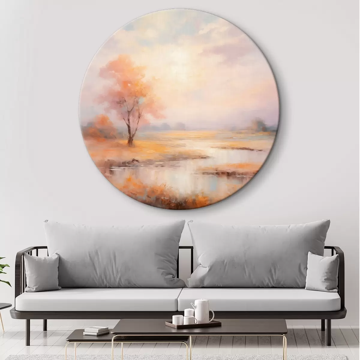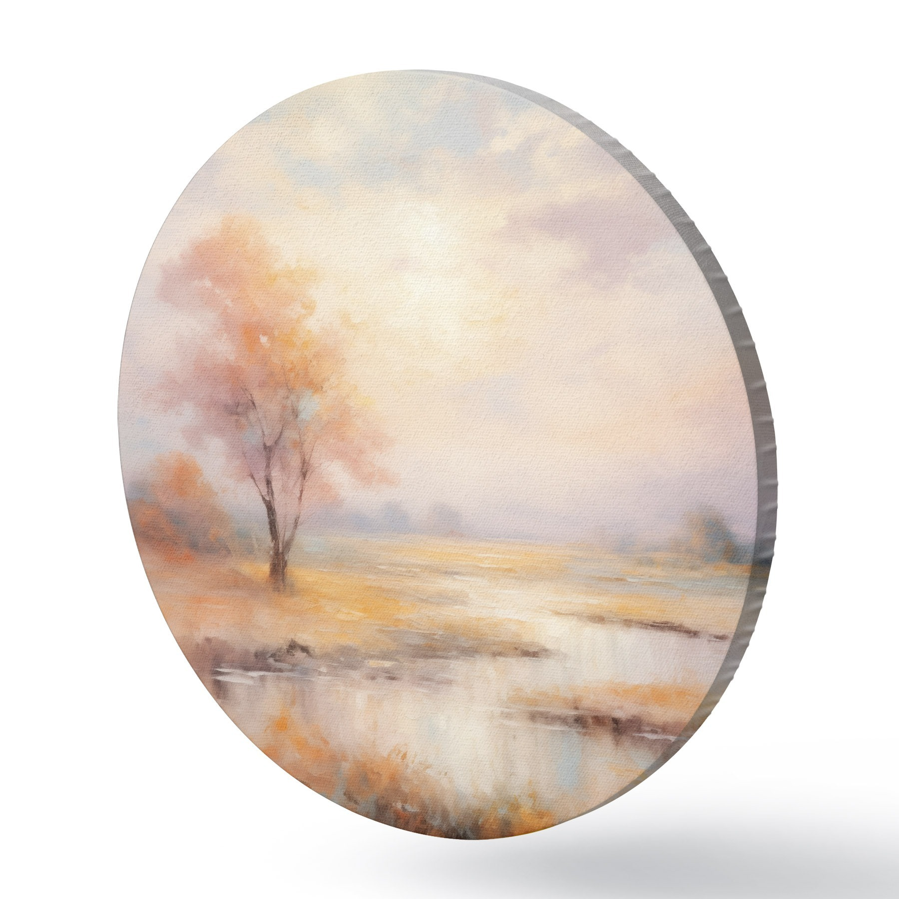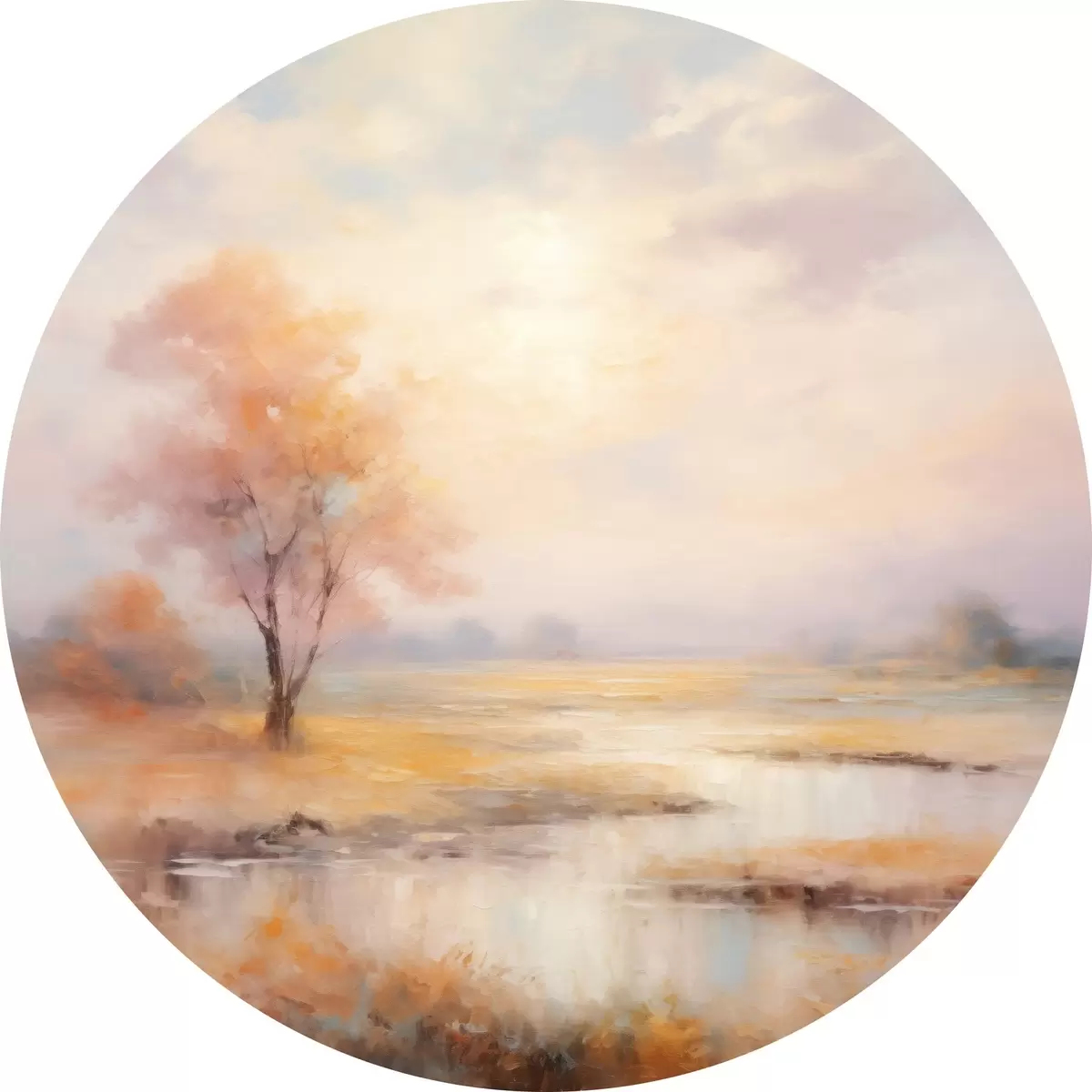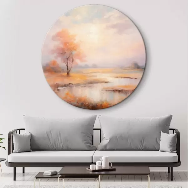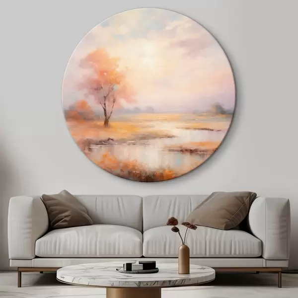 Apaļas gleznas Ainava siltos toņos ar upi un koku r43375