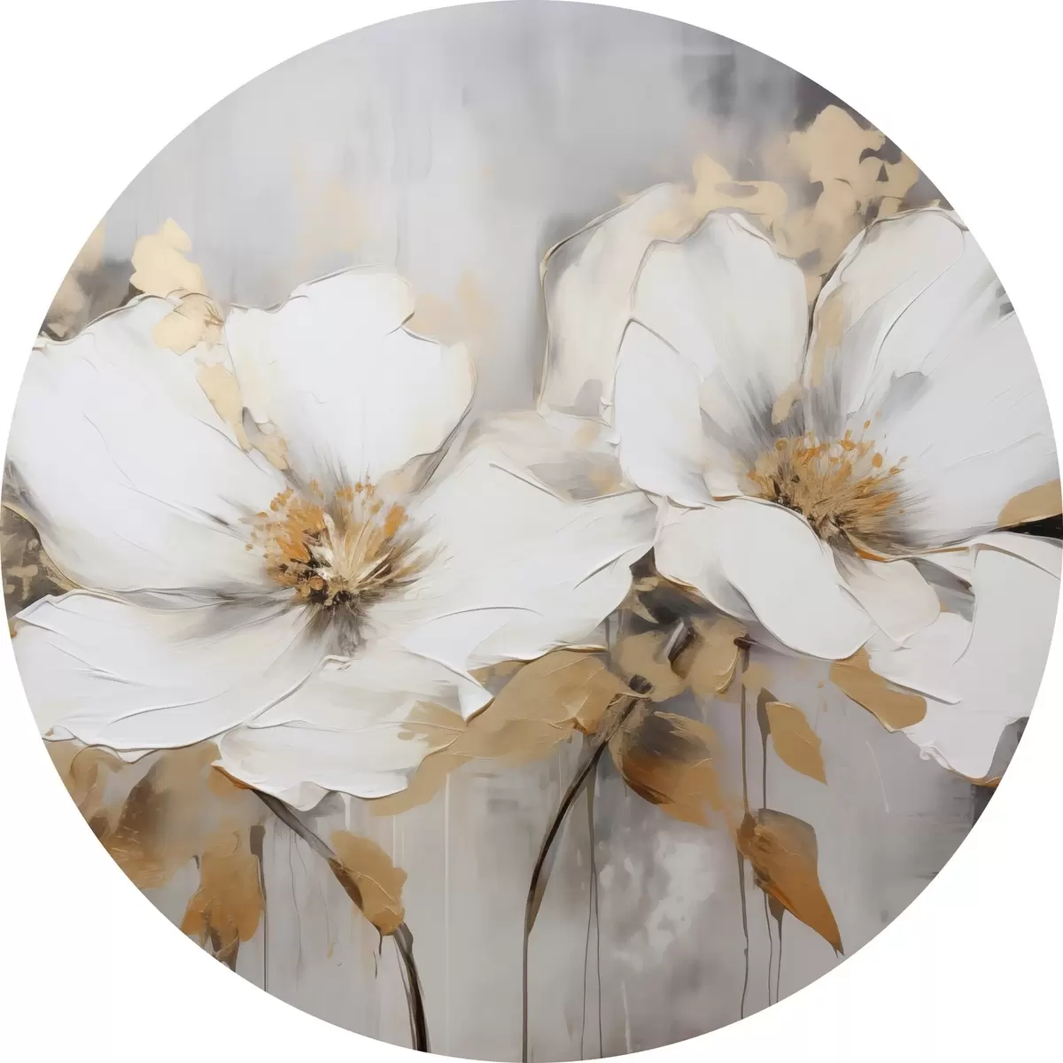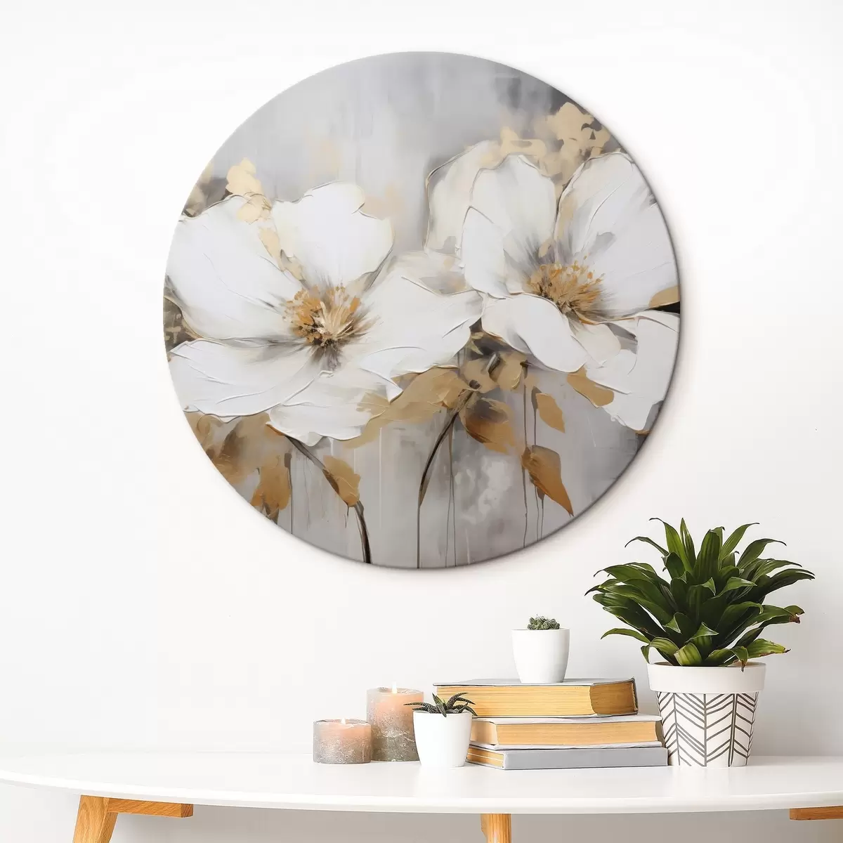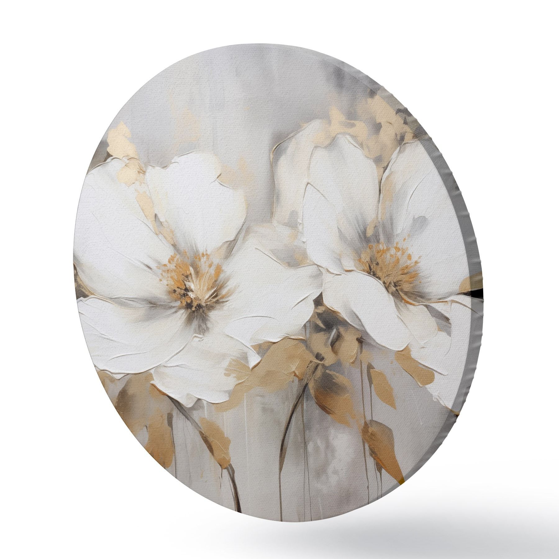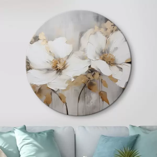 Apaļas gleznas Balti ziedi ar dzeltenām lapām uz balta fona, bieza triepienu imitācija, teksturēts moderns stils r43389