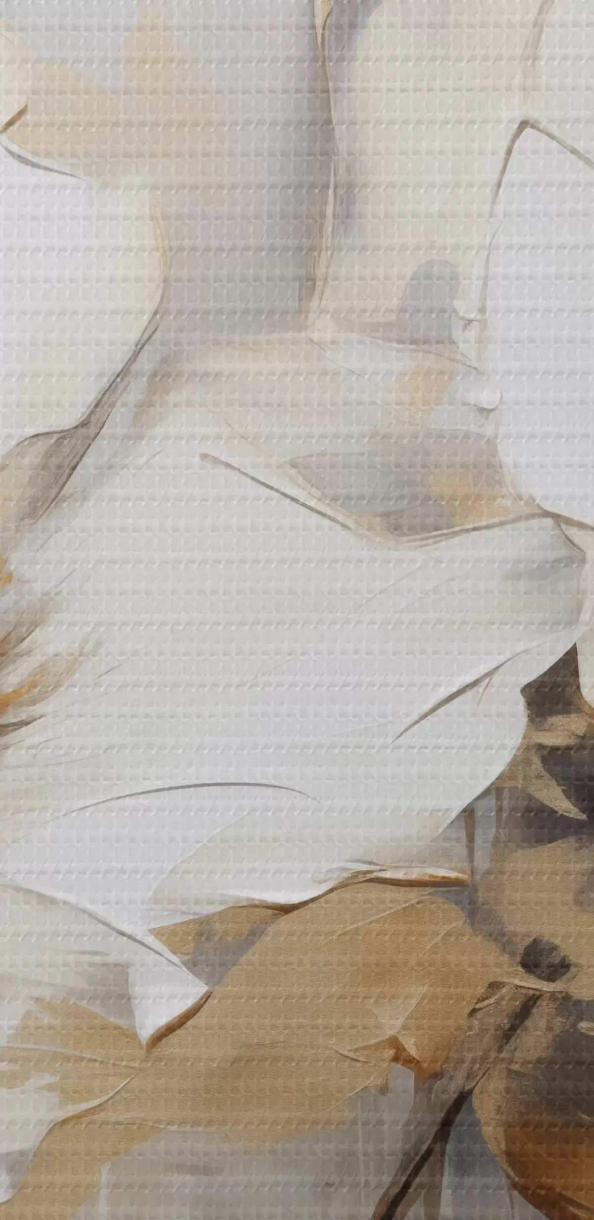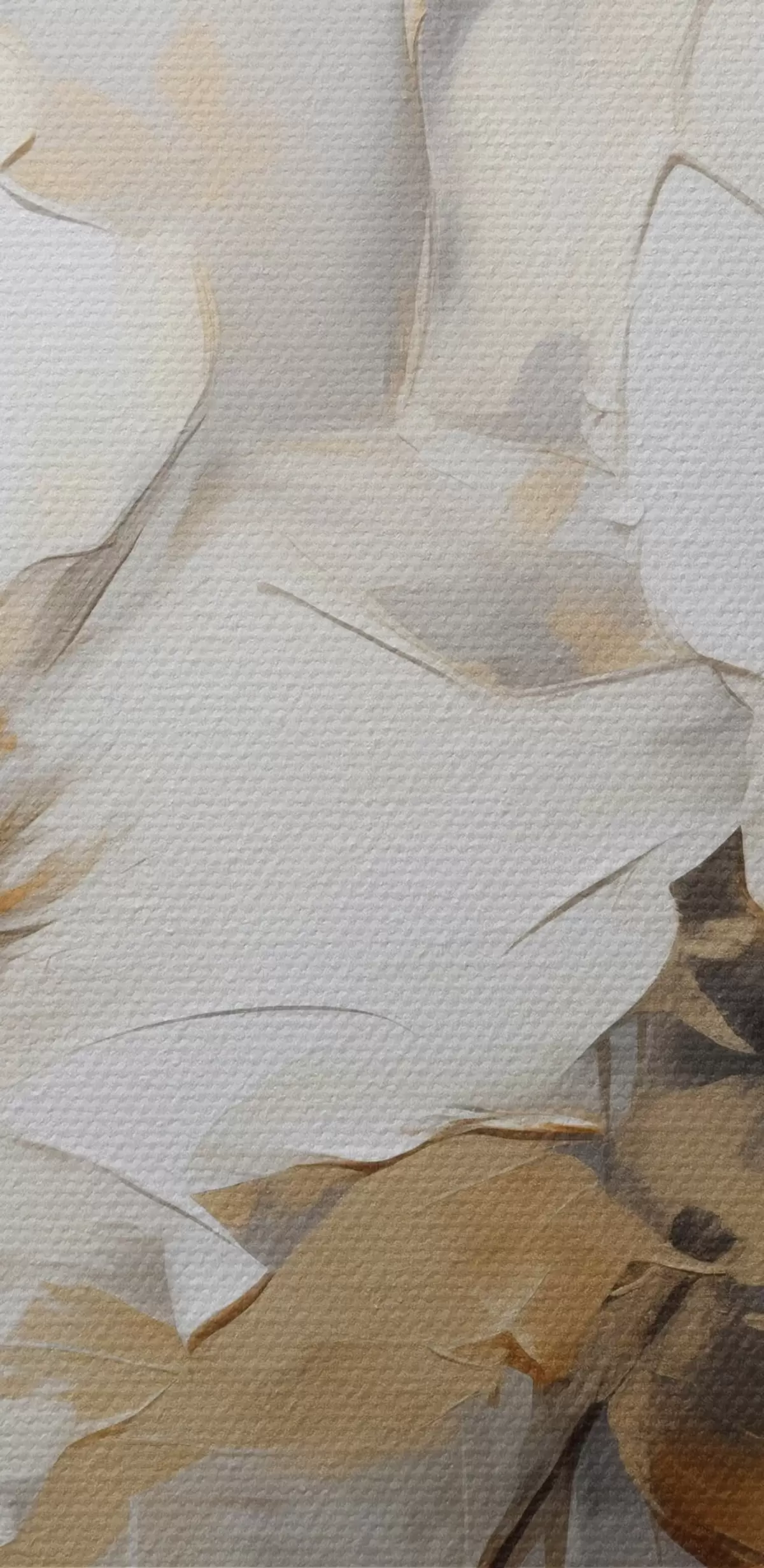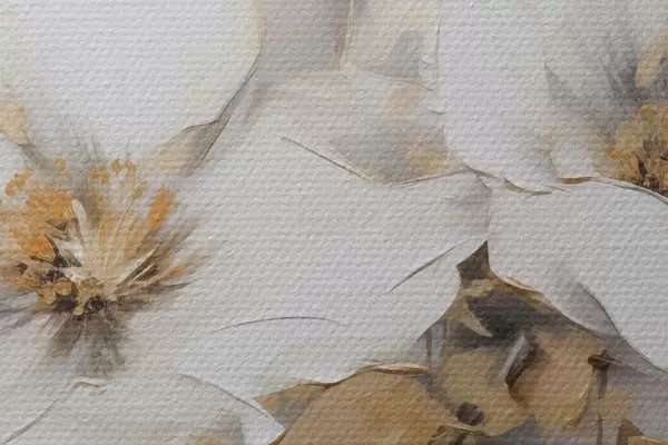 Attēls Balti ziedi ar dzeltenām lapām uz balta fona, bieza triepienu imitācija, teksturēts moderns stils Nr r43389