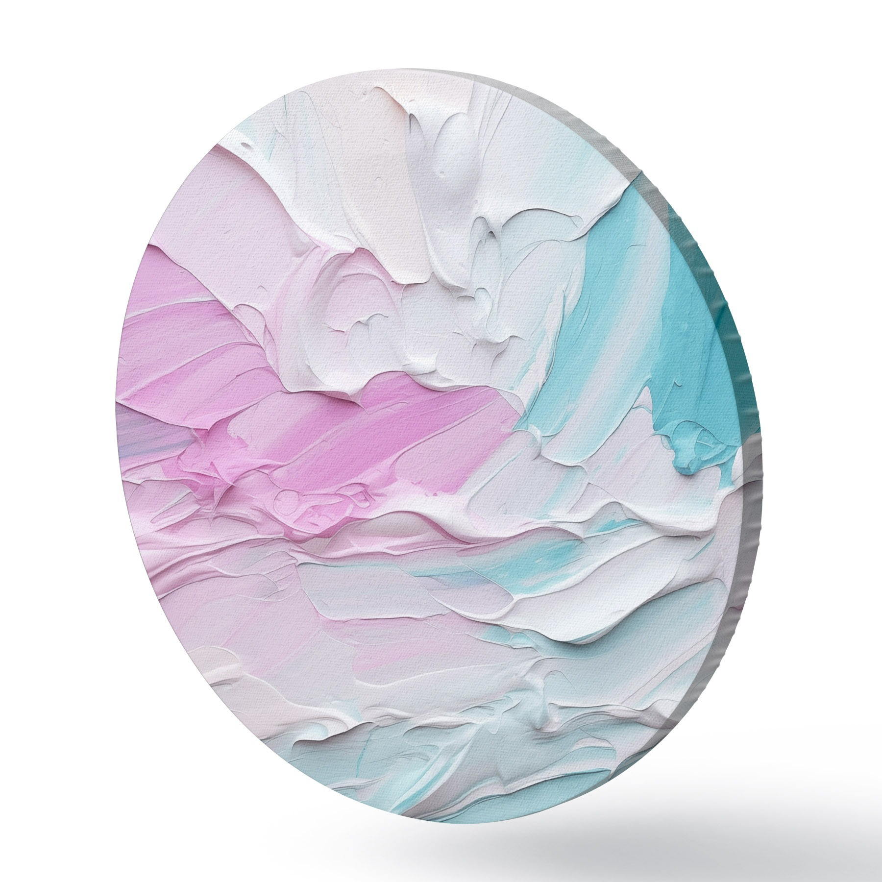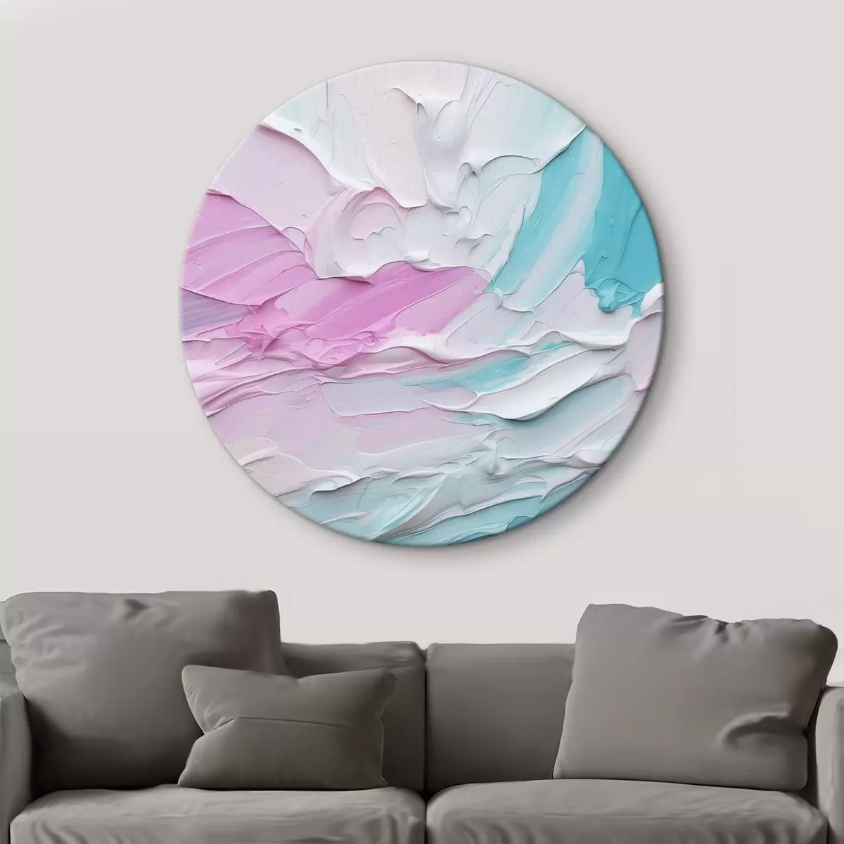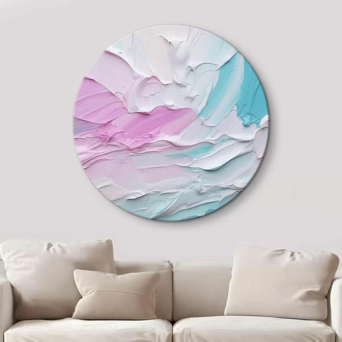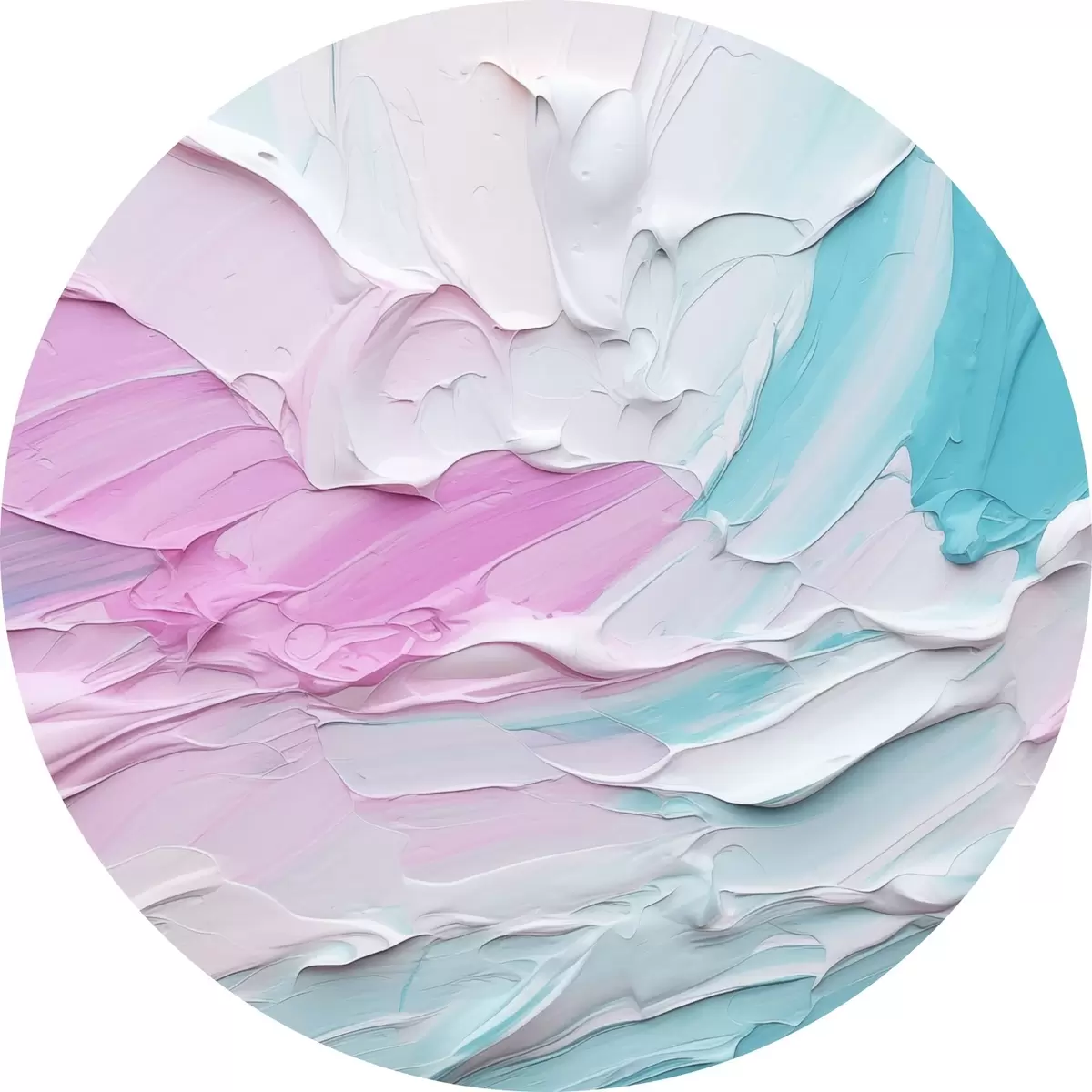 Apaļas gleznas Abstrakta eļļas glezniecības imitācija ar bieziem triepieniem rozā, baltā un tirkīza krāsā, kas rada faktūras efektu r43393