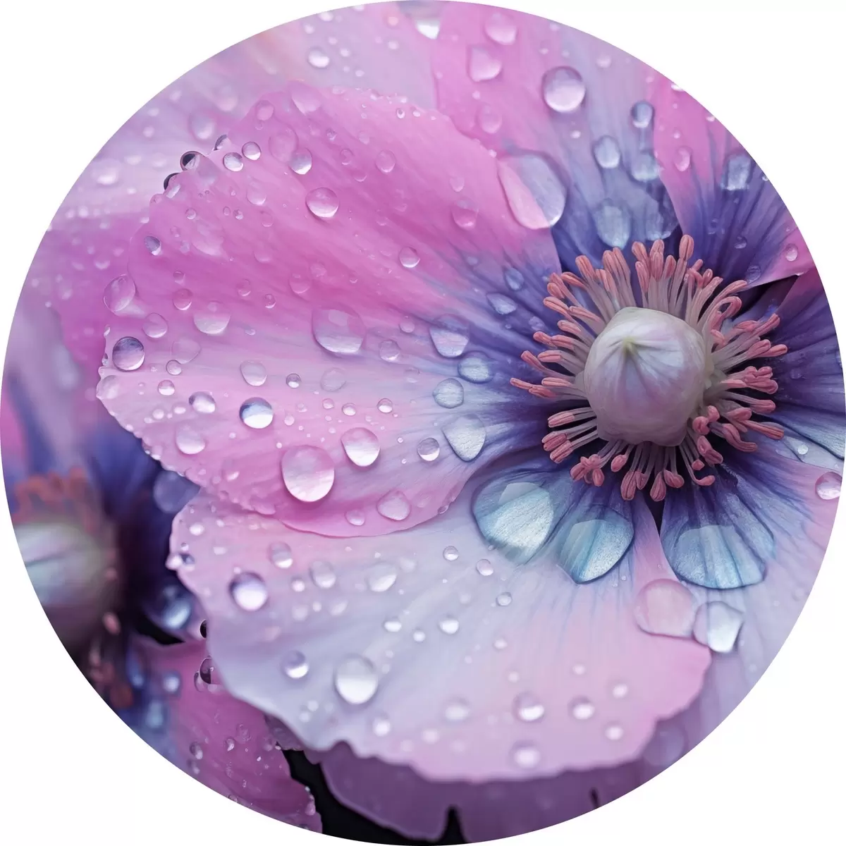 Apaļas gleznas Rozā un violeti ziedi pilnā ziedēšanas laikā, kas pārklāti ar ūdens pilieniem, uz tumša fona r43394