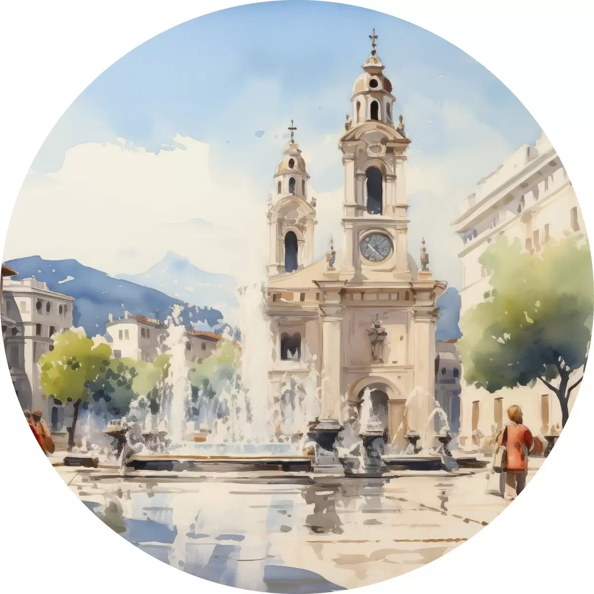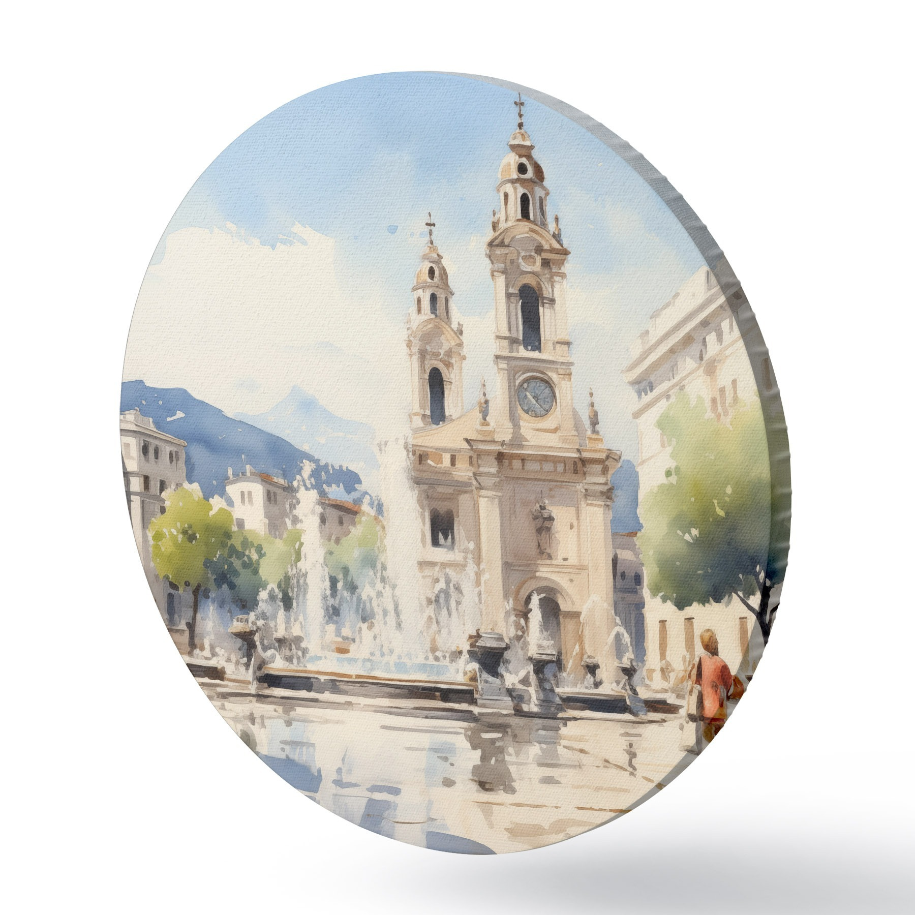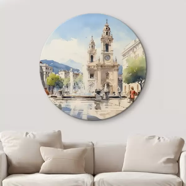 Apaļas gleznas Abstraktā pilsētas ainava ar torni un strūklaku pilsētas laukumā, kalni tālumā, akvareļa stilā r43397