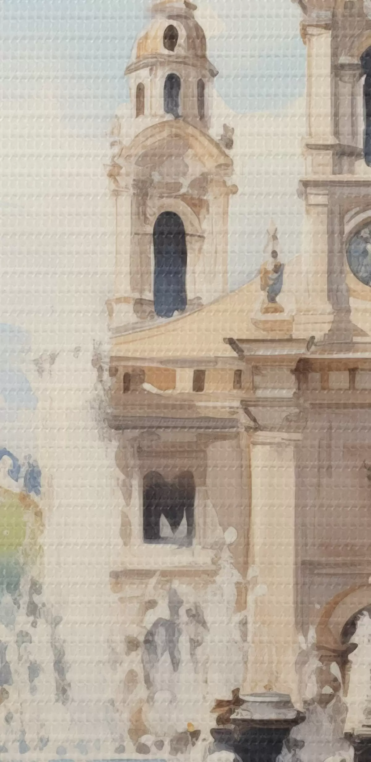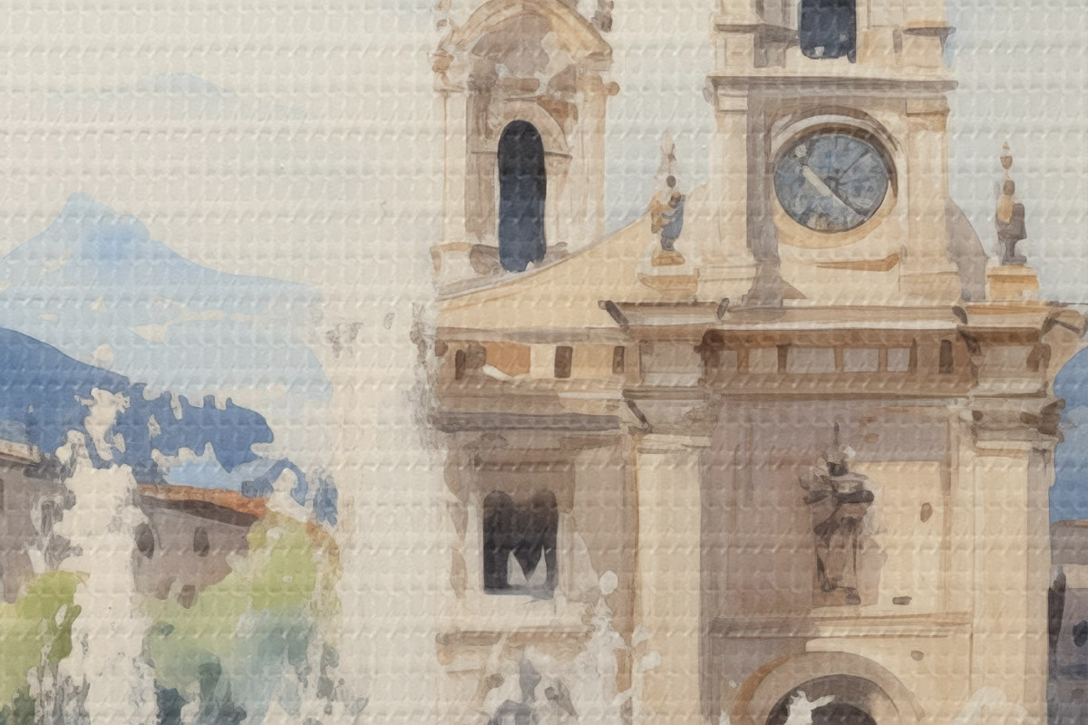 Attēls Abstraktā pilsētas ainava ar torni un strūklaku pilsētas laukumā, kalni tālumā, akvareļa stilā Nr r43397